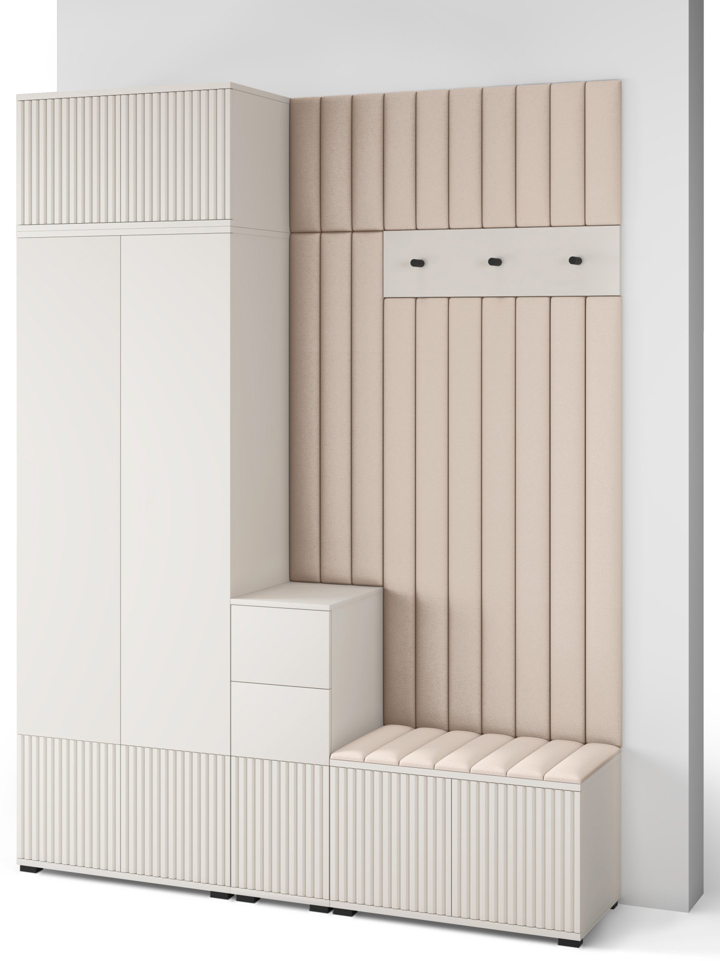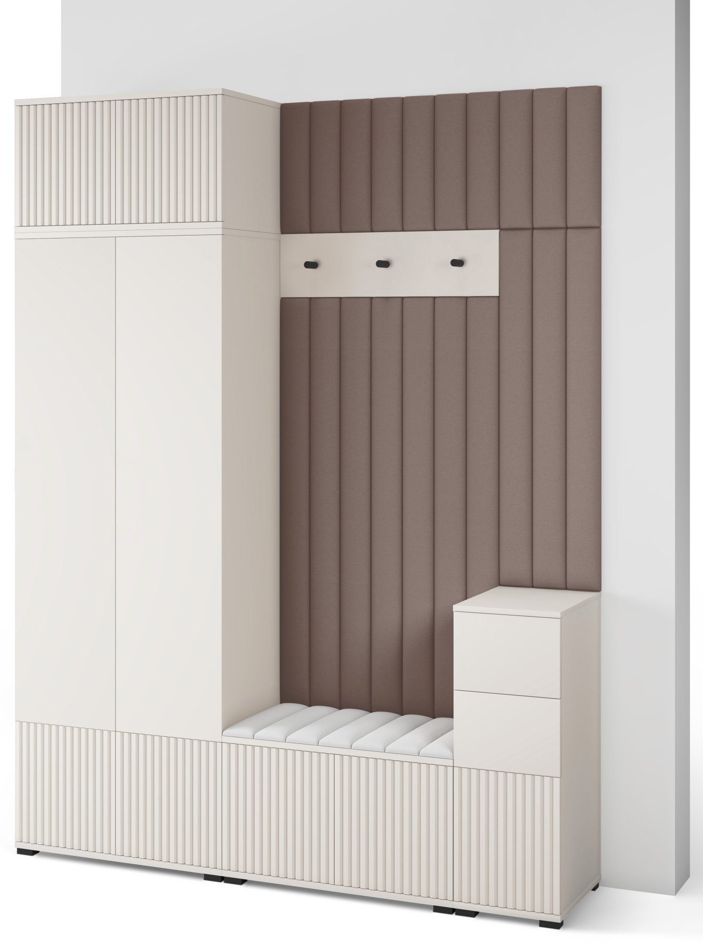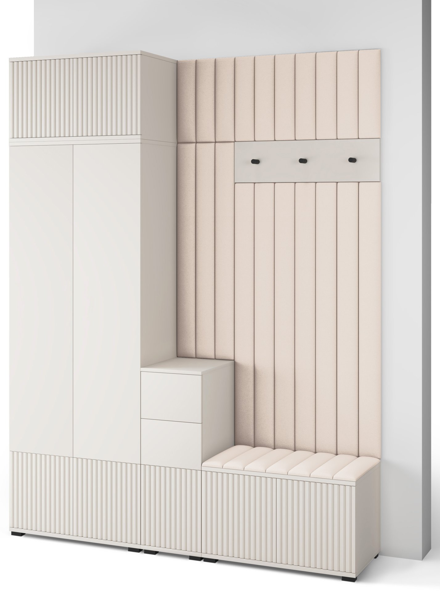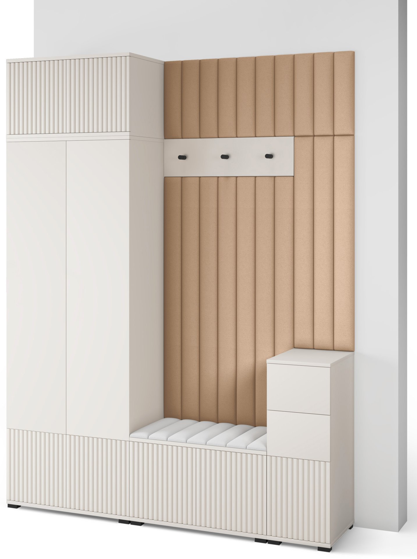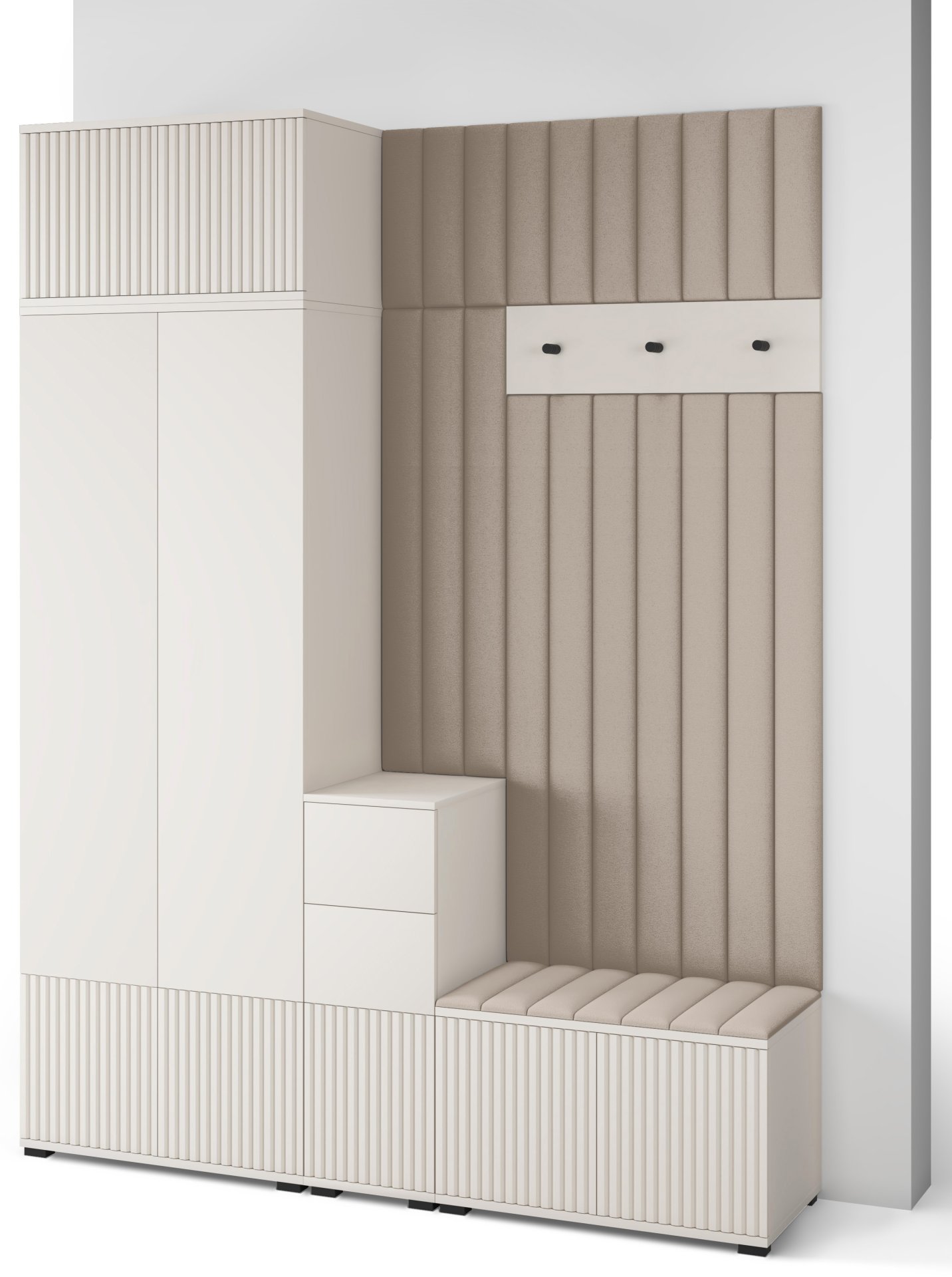 Komplet za hodnik Rayo 8 spaja funkcionalnost, estetiku i kvalitetnu izradu koju osigurava poljski proizvođač PKMebel. Izrađen je od izdržljive laminirane ploče debljine 16 mm, što osigurava dug vijek trajanja i jednostavno održavanje. Boja cashmere (kašmir) u kombinaciji s tapeciranim panelima od tkanine Trinity 02 stvara moderan, a istovremeno topao izgled koji se odlično uklapa u različite interijere.
