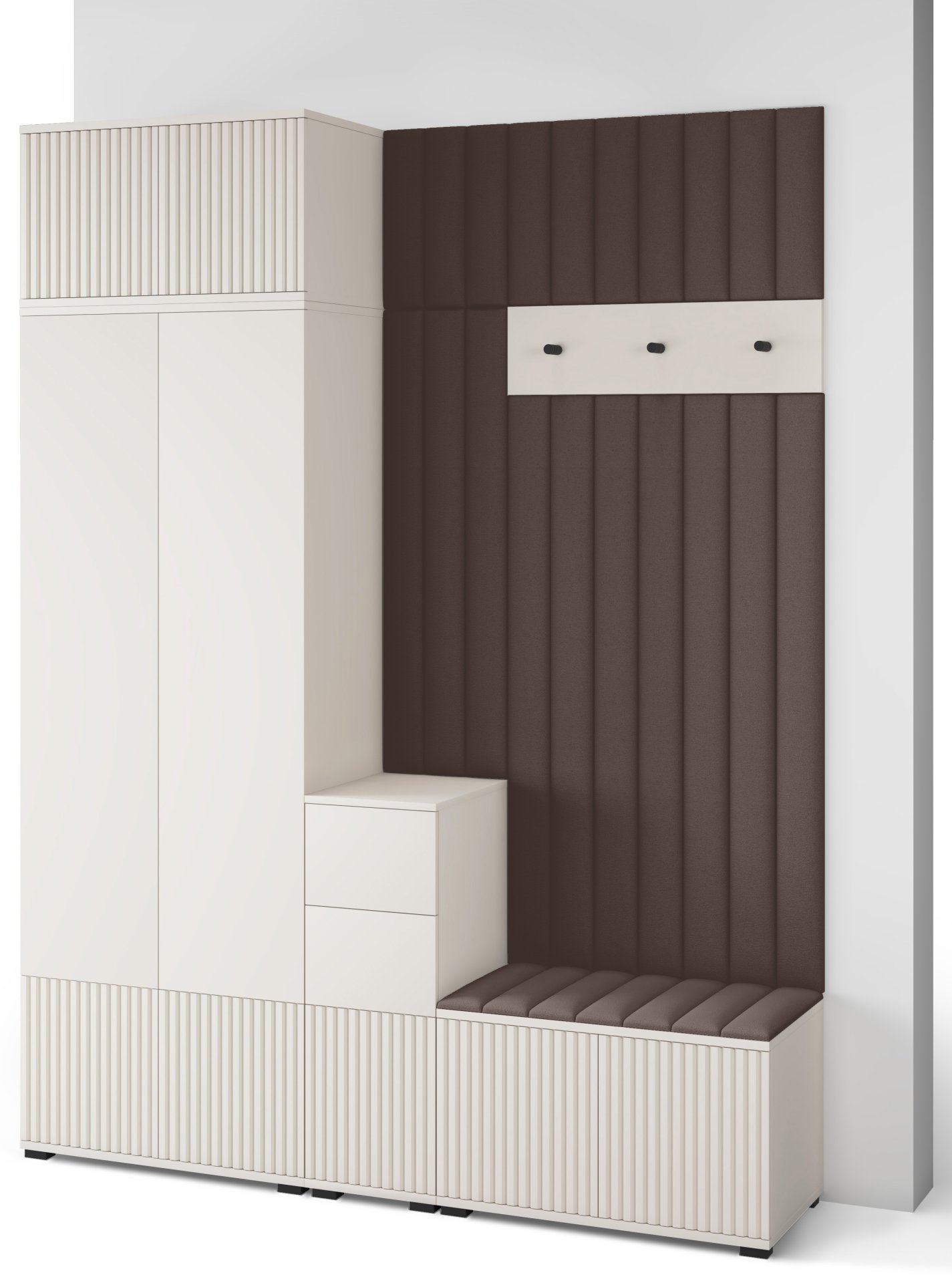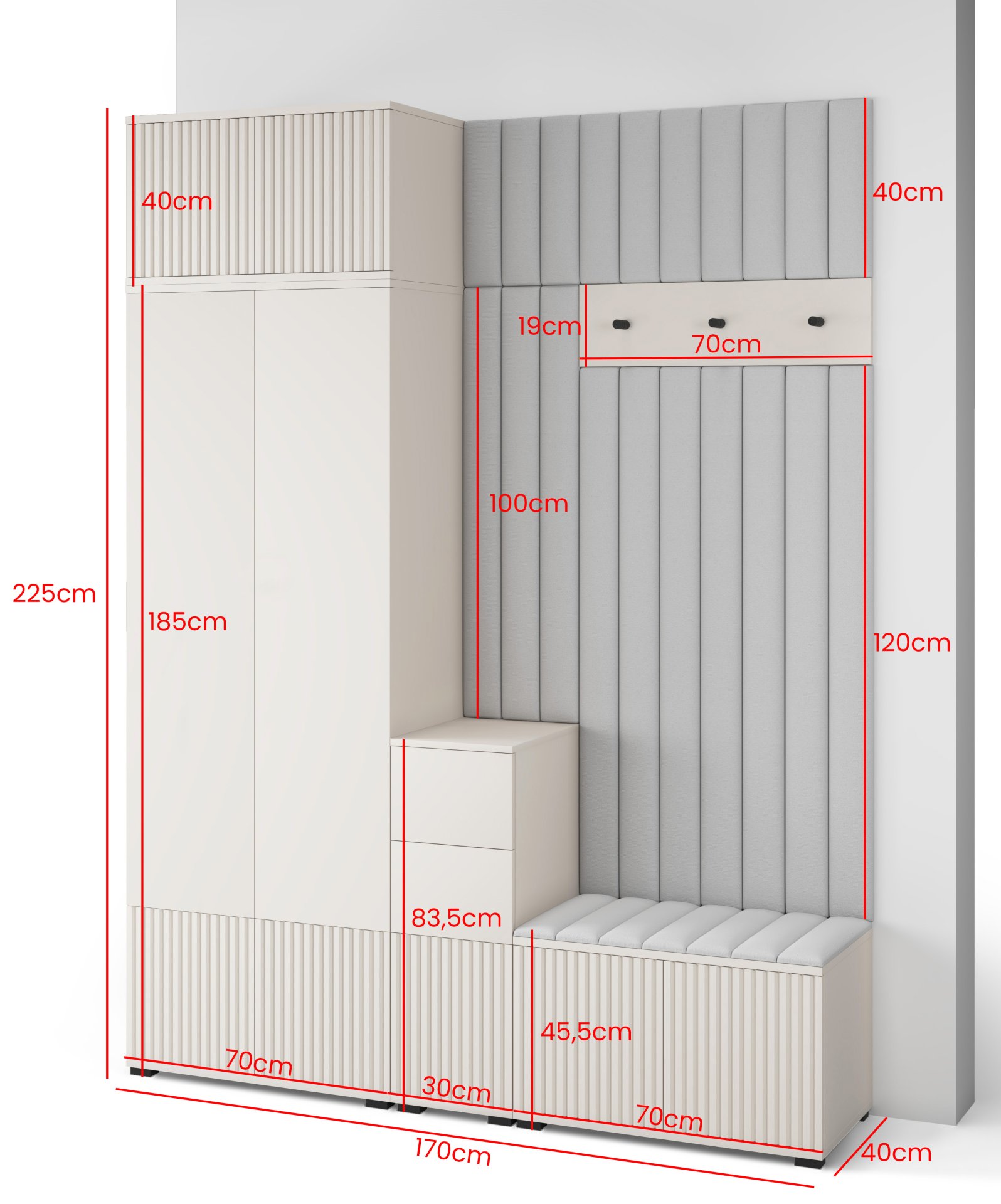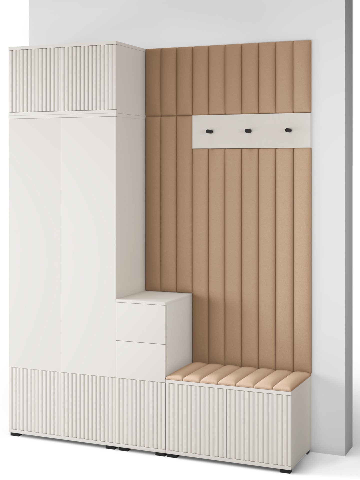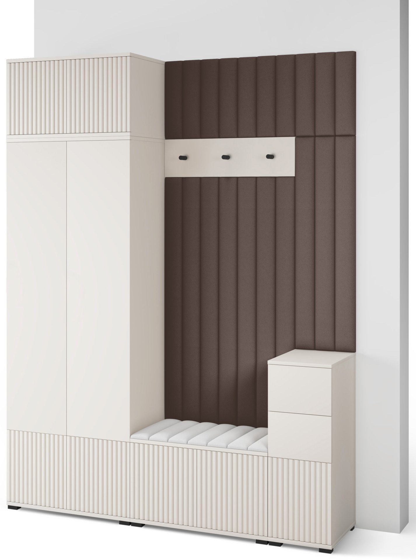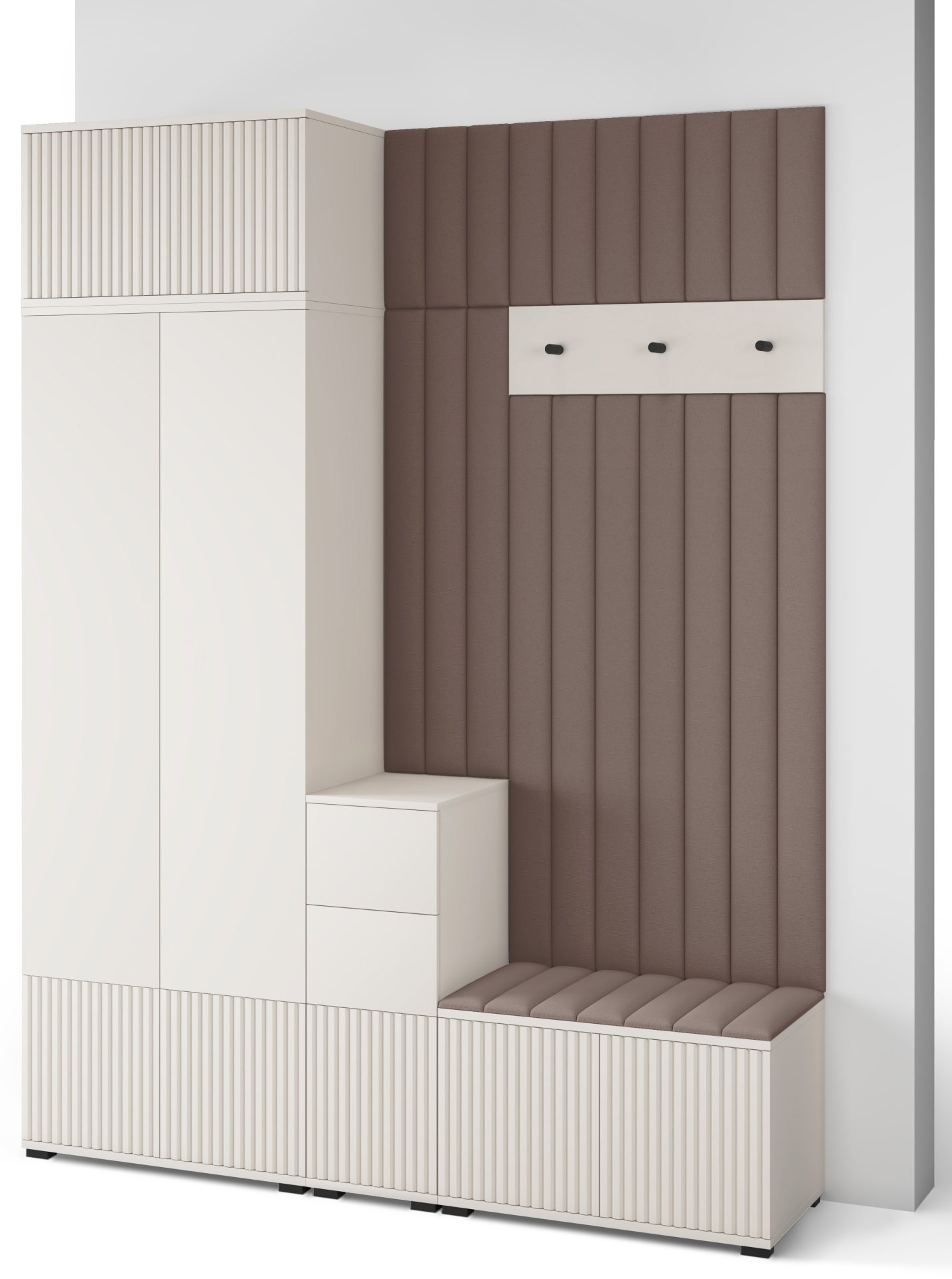 Komplet za hodnik Rayo 8 spaja funkcionalnost, estetiku i kvalitetnu izradu koju osigurava poljski proizvođač PKMebel. Izrađen je od izdržljive laminirane ploče debljine 16 mm, što osigurava dug vijek trajanja i jednostavno održavanje. Boja cashmere (kašmir) u kombinaciji s tapeciranim panelima od tkanine Trinity 02 stvara moderan, a istovremeno topao izgled koji se odlično uklapa u različite interijere.