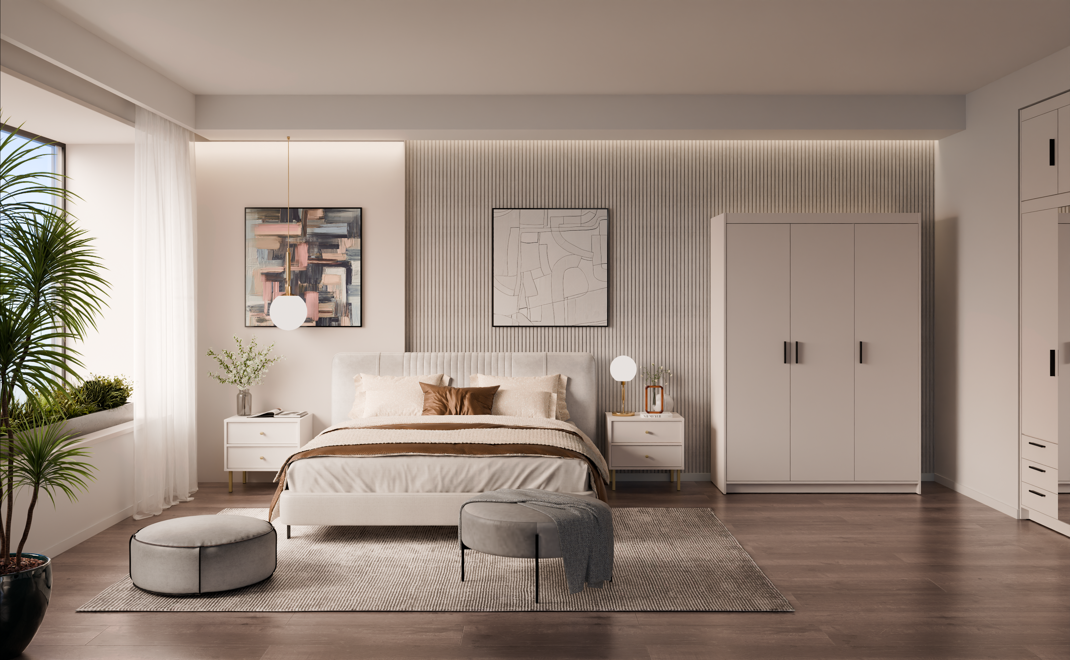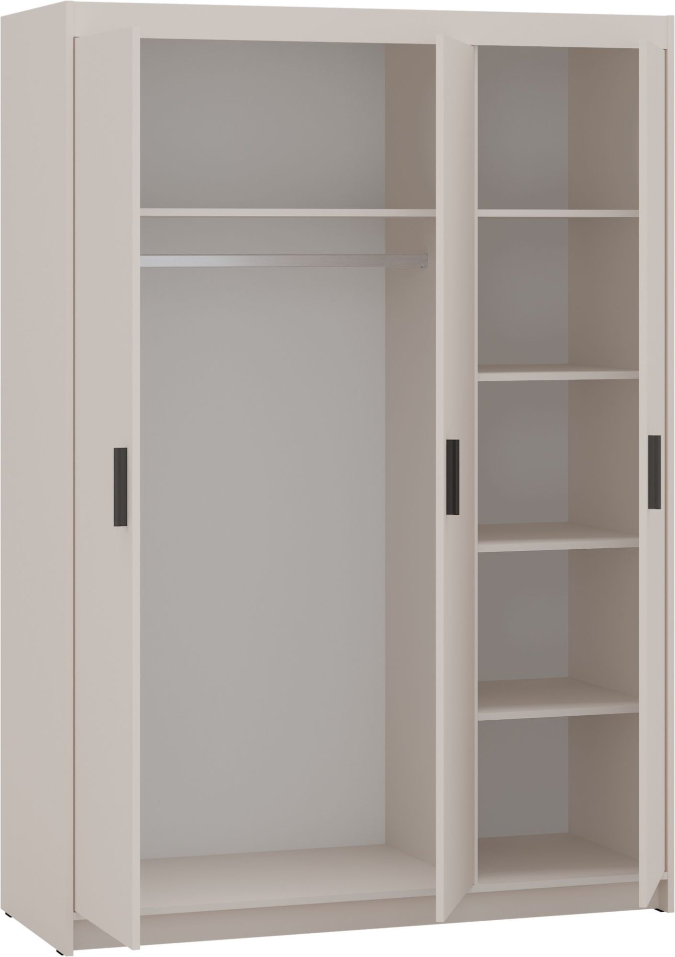 Topla pješčano bež boja stvara ugodnu, prirodnu atmosferu u prostoru. Takva nijansa idealna je za svjetlije interijere, jer dodaje mekoću i vizualno povećava prostor. Bež boja se lijepo slaže s bijelim, sivim ili drvenim tonovima, pa se može jednostavno kombinirati s drugim komadima namještaja, kao što su kreveti, komode ili noćni ormarići. Površina ormara je glatka, s nježnim mat učinkom, koji daje dojam profinjenosti, a istovremeno ostaje praktična za svakodnevnu upotrebu.
