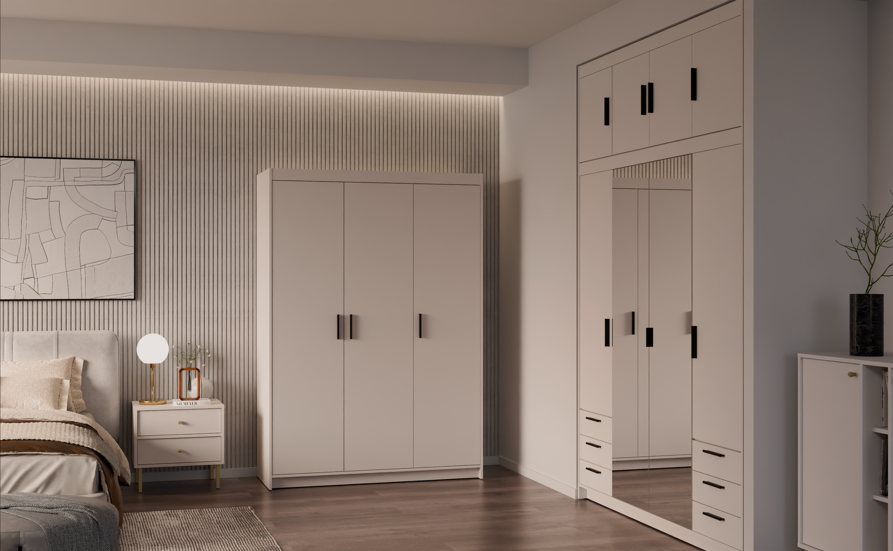 Garderobni ormar je svestrano upotrebljiv – može stajati samostalno kao središnji komad u spavaćoj sobi ili predsoblju, ili se može kombinirati s drugim elementima iz iste linije. Zbog neutralne boje lijepo se nadopunjuje s različitim teksturama i materijalima, poput drva, metala ili tkanine. Njegov jednostavan oblik omogućuje da se usredotočite na funkcionalnost i estetiku prostora, a da pritom ormar ne bude previše dominantan.
