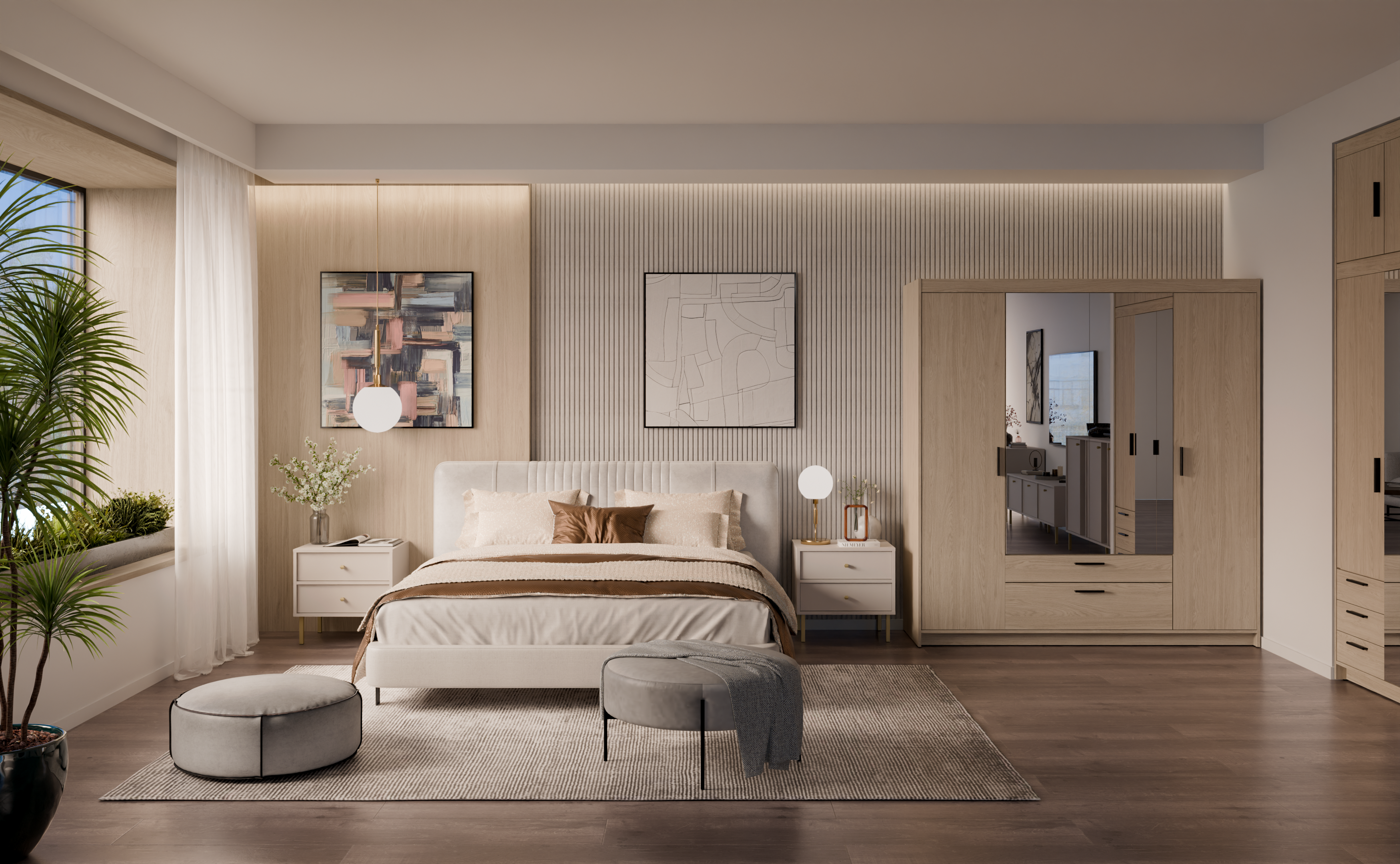 Na jednim vratima ormara postavljeno je veliko ogledalo, koje povećava dojam prostranosti i ujedno omogućuje praktičnu provjeru izgleda prije izlaska iz kuće. Odsjajna površina elegantno je integrirana u dizajn vrata, što doprinosi uravnoteženom izgledu i suvremenoj estetici.