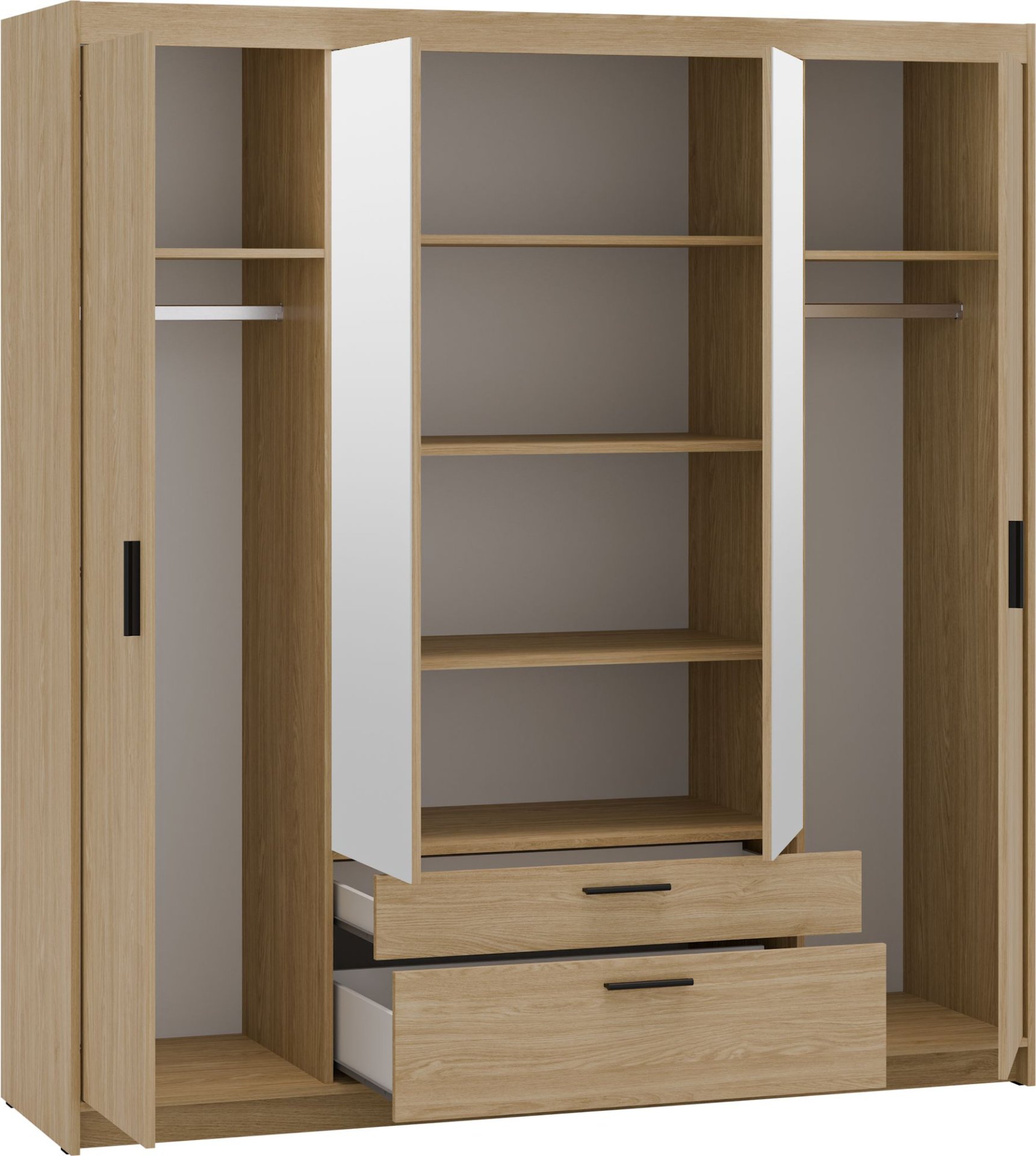 Unutrašnjost garderobnog ormara Elena DO04 osmišljena je za pregledno pohranjivanje. Prostori za vješanje i police omogućuju raspored odjeće po kategorijama, što olakšava svakodnevnu upotrebu. Stabilna konstrukcija od 15-milimetarskih ploča pridonosi dugotrajnoj postojanosti i pouzdanosti, dok glatke površine omogućuju jednostavno čišćenje suhom ili blago vlažnom krpom.