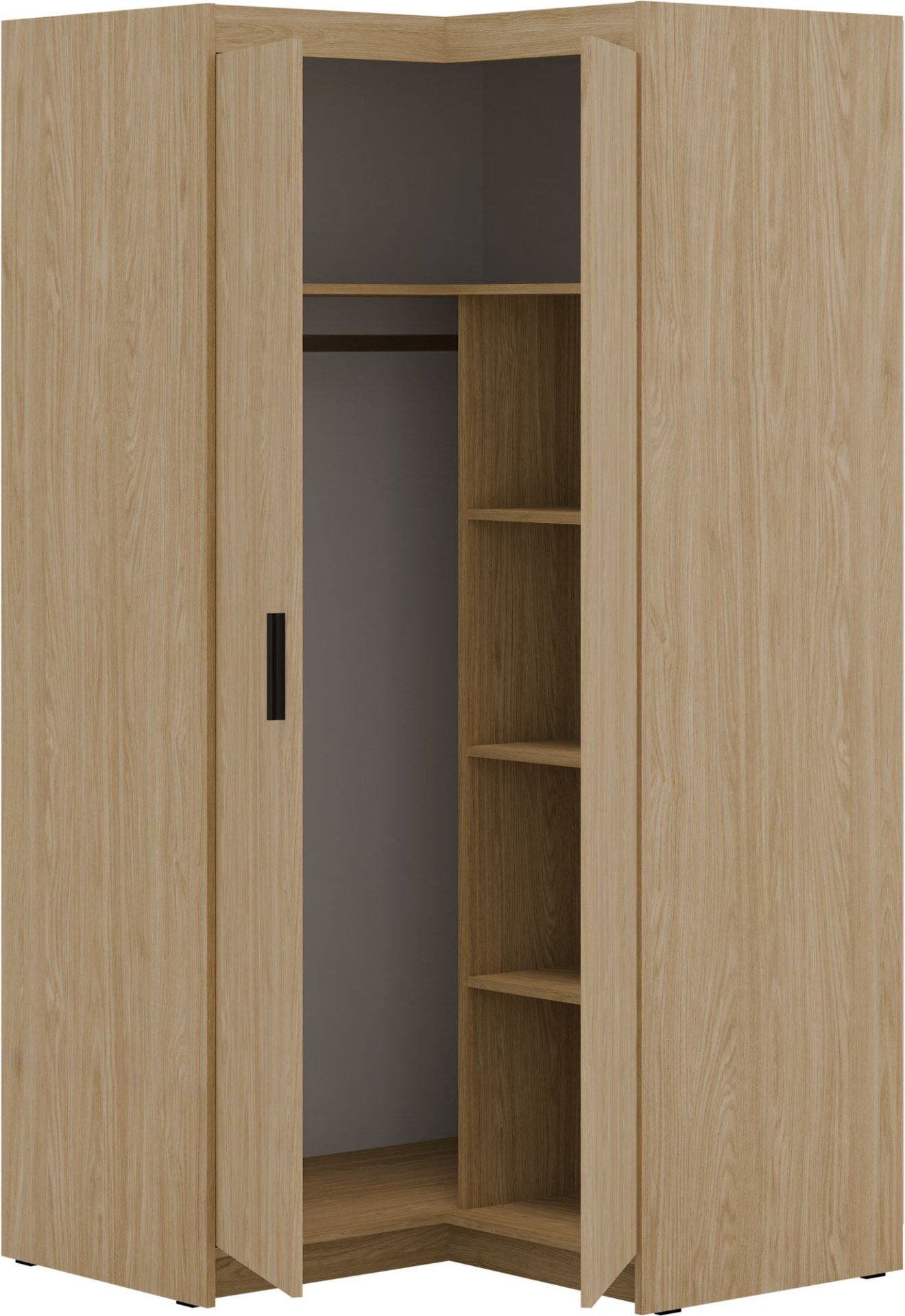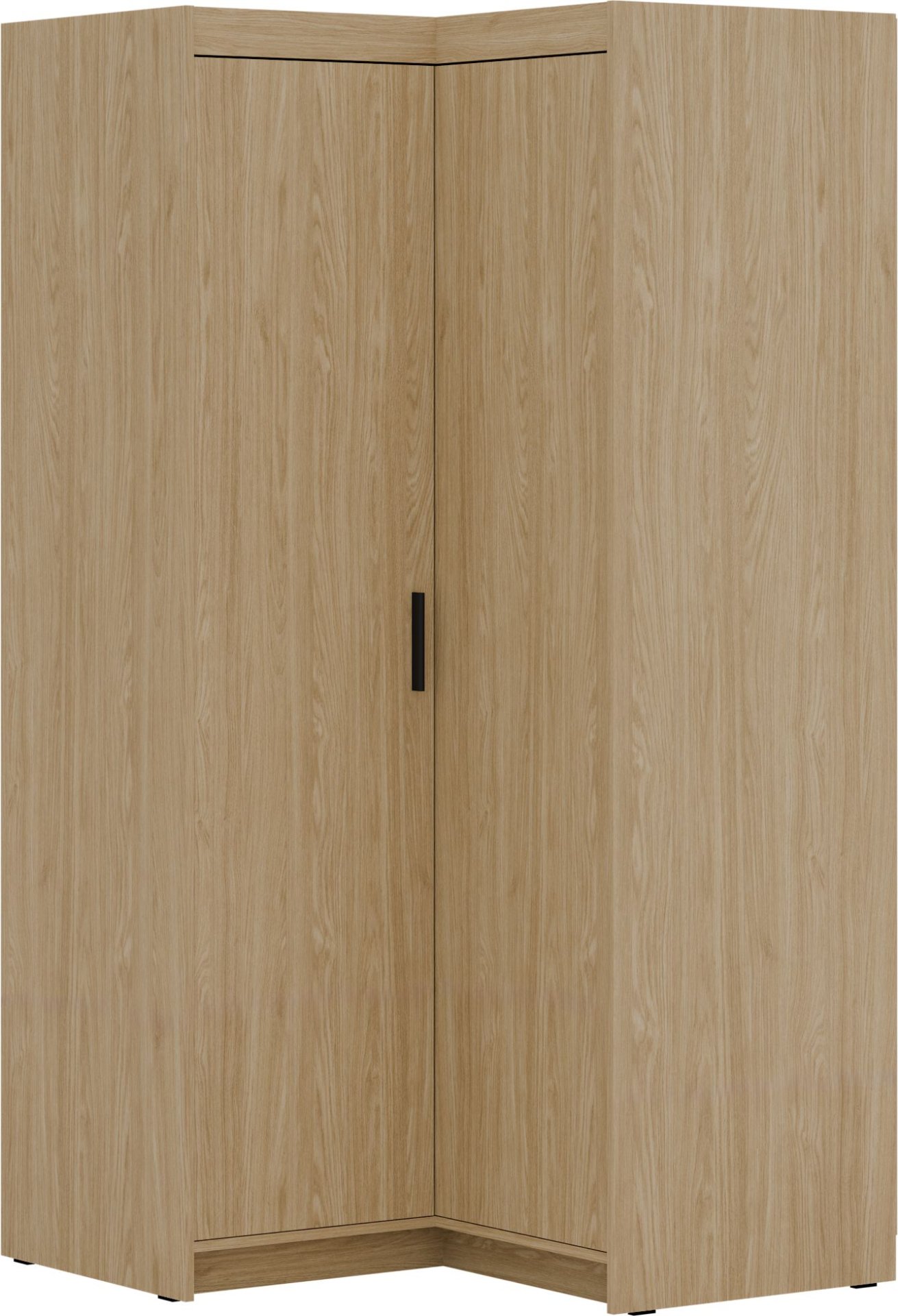 Kutni ormar za garderobu Elena NARDO02 u boji uljenog hrasta promišljeno je rješenje za sve koji žele učinkovito iskoristiti prostor u spavaćoj sobi, hodniku ili garderobi. Izrađen je od kvalitetne laminirane ploče debljine 15 mm, što osigurava čvrstoću, stabilnost i dug vijek trajanja. Njegov moderan izgled u toploj bež nijansi lako se uklapa s ostalim elementima unutarnjeg uređenja, a prostoru daje dojam svjetlosti i smirenosti.