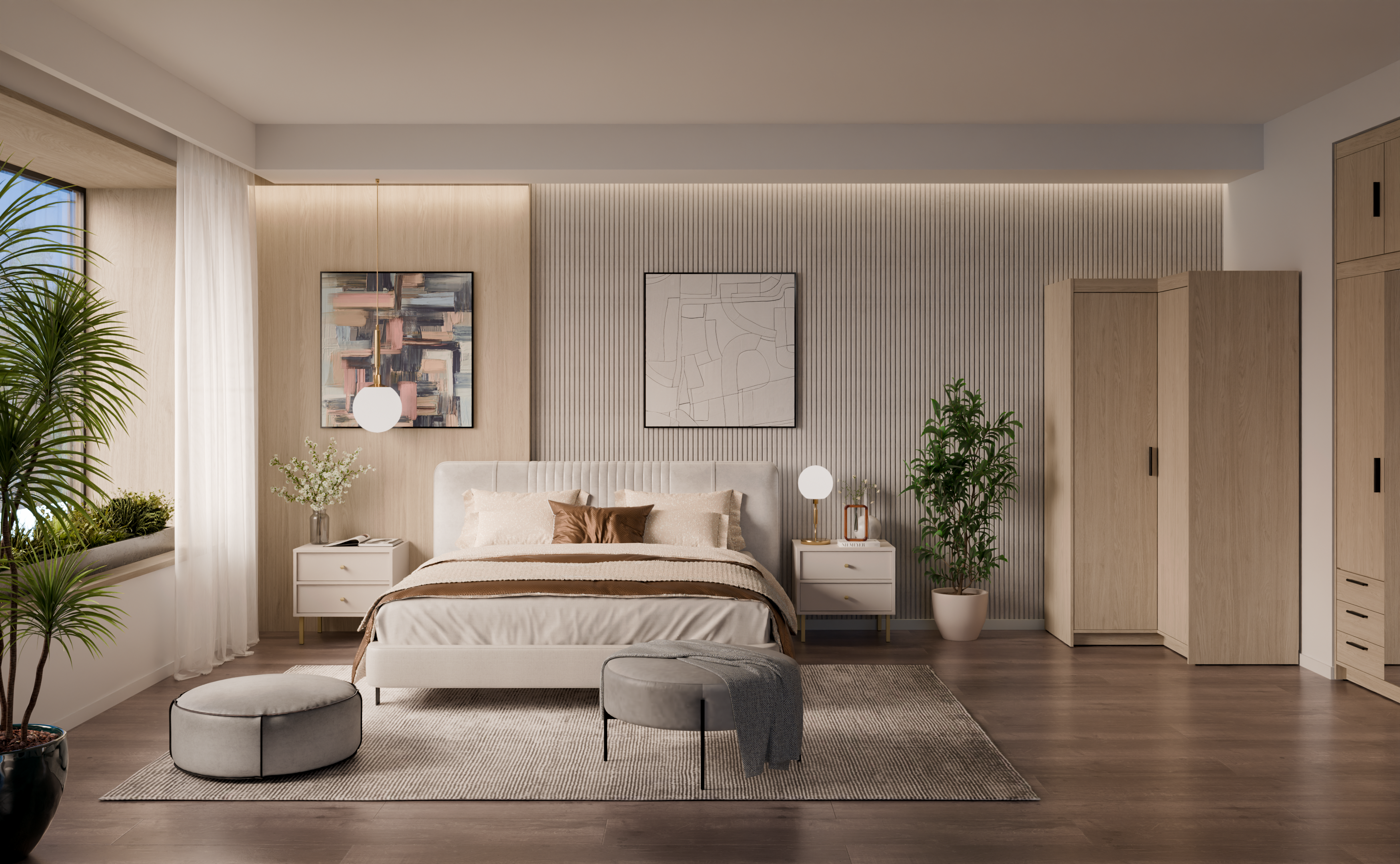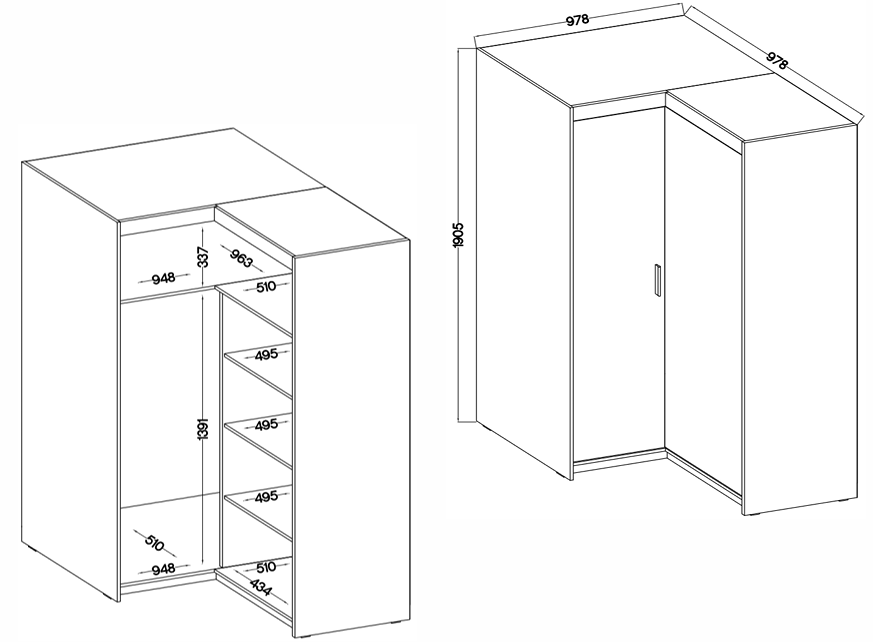 Ormar ima kutni dizajn s dimenzijama 97,8×97,8×190,5 cm, što omogućuje optimalno iskorištavanje prostora, posebno u manjim sobama ili stanovima. Dizajniran je tako da se savršeno uklapa u kut, čime se dobiva dodatna površina za pohranu bez osjećaja skučenosti. Glatke linije i neutralna boja omogućuju da se ormar stapa s različitim stilovima – od klasičnog do suvremenog minimalizma.