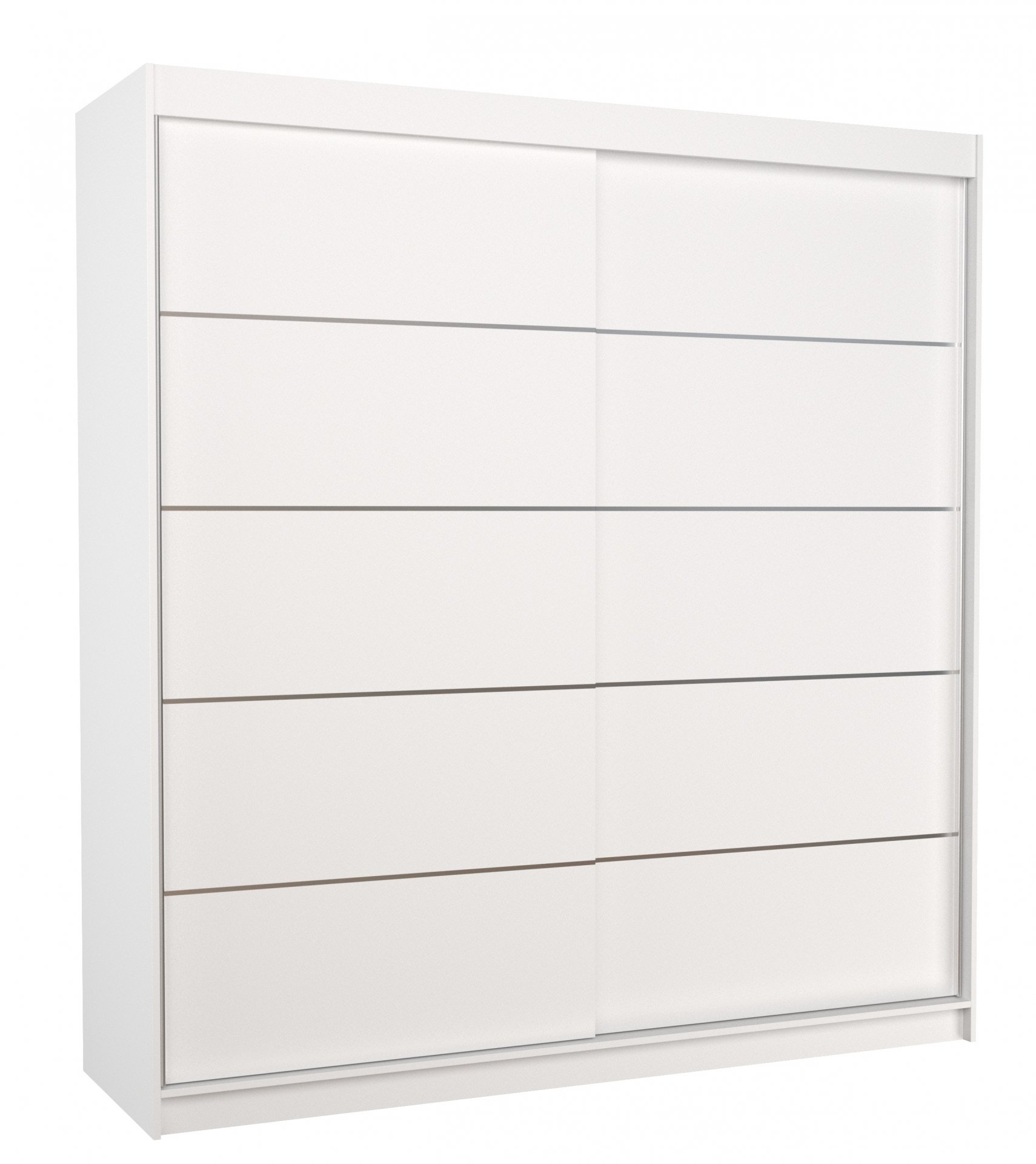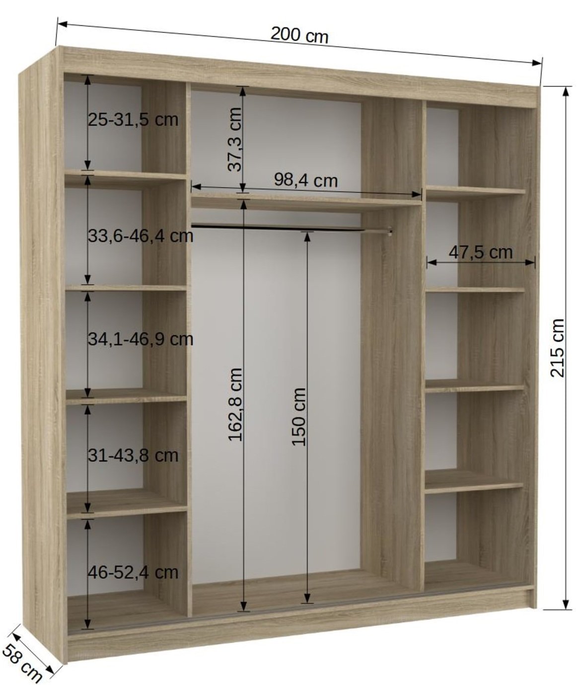 Klizni ormar ESTEVA savršen je način da organizirate svoj prostor. Namještaj je opremljen prostranim policama i šinom na koju možete objesiti haljine, odijela, gornju odjeću ili košulje. Na prednjoj strani nalaze se ukrasne vodoravne srebrne trake koje namještaju daju jedinstveni stil. S obzirom na to da je ormar klizni, ne morate izdvajati dodatni prostor za otvaranje vrata, što ga čini savršenim rješenjem za malu sobu ili uski hodnik.
