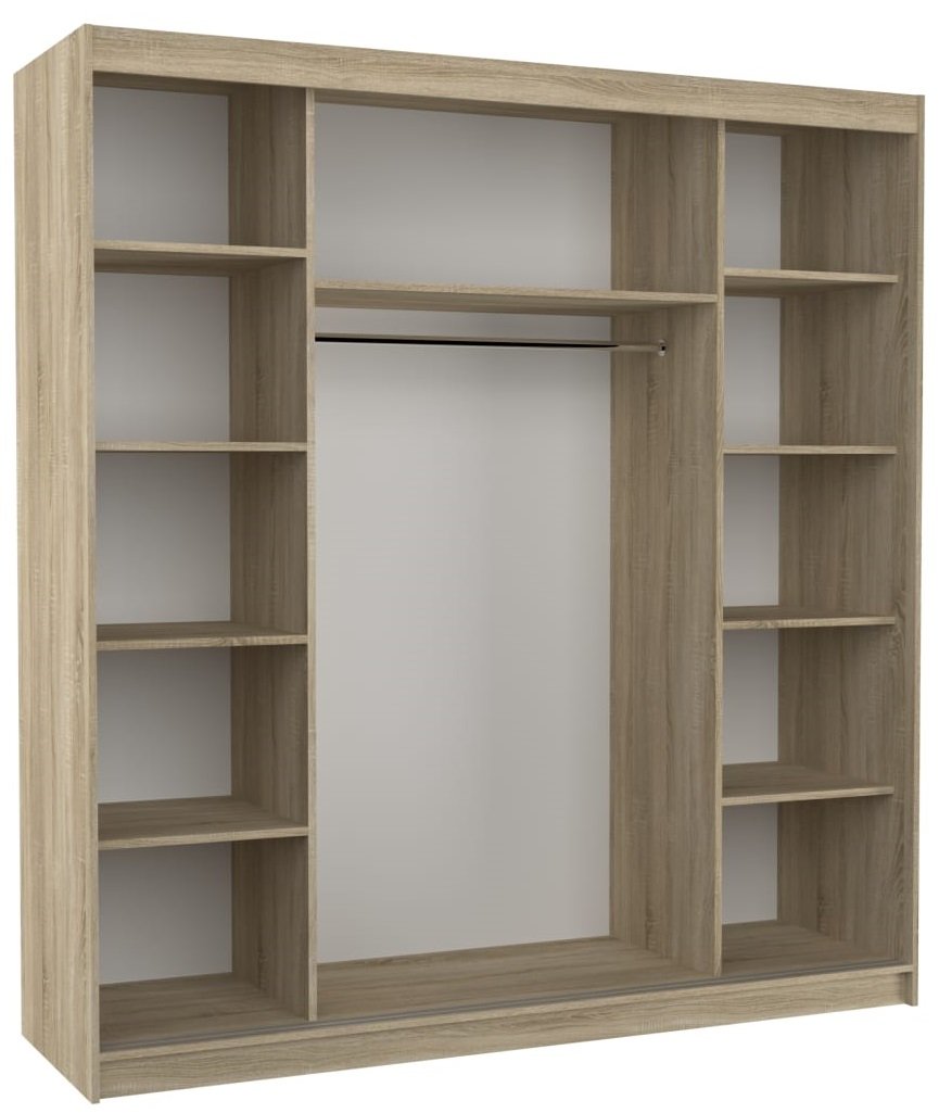 Klizni ormar OLIVER savršen je način organizacije vašeg prostora. Ormar je opremljen prostranim policama i šipkom za vješanje na koju možete objesiti odjeću, odijela i košulje. Na prednjoj strani nalazi se ogledalo i karakteristične vodoravne srebrne linije koje ističu jedinstveni stil ormara. Klizni sustav štedi prostor za otvaranje vrata i odlično je rješenje za malu sobu ili usko predsoblje.