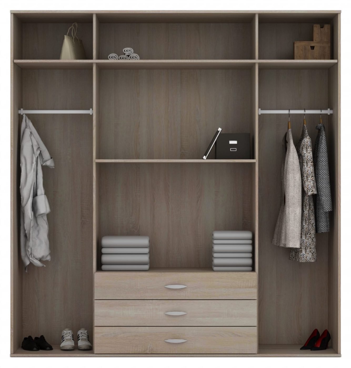 3. Predali: Omara je opremljena z udobnimi predali, ki omogočajo organizirano shranjevanje oblačil, dodatkov ali drugih osebnih predmetov.