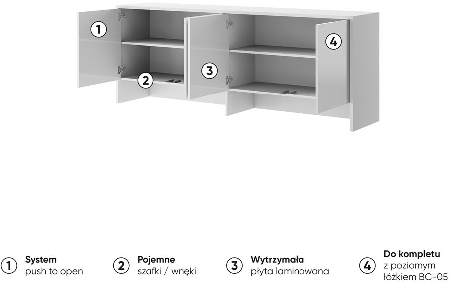 Funkcionalan element s dva ormarića za prostor iznad kreveta možete kombinirati s krevetom u ormaru BC-14. Element štedi prostor i nudi mjesto za dodatno odlaganje predmeta po želji, izrađen je od izdržljive laminirane ploče s ABS rubovima.