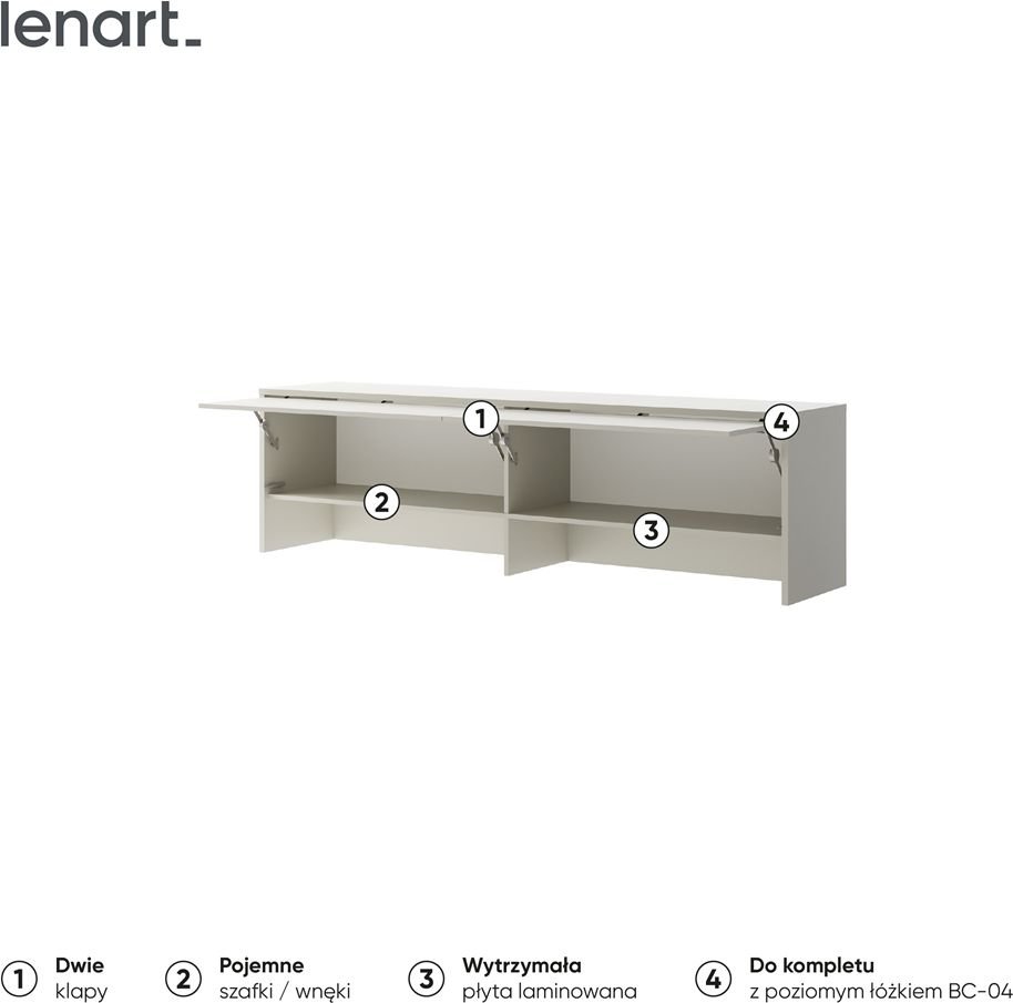 Funkcionalni produžetak s dvije ormariće za kombiniranje s ormarnim krevetom BC-04. U prostranim ormarićima možete pohraniti mnogo stvari. Nadstojnik će stvoriti zanimljiv, moderan izgled i uštedjeti prostor u vašoj sobi.