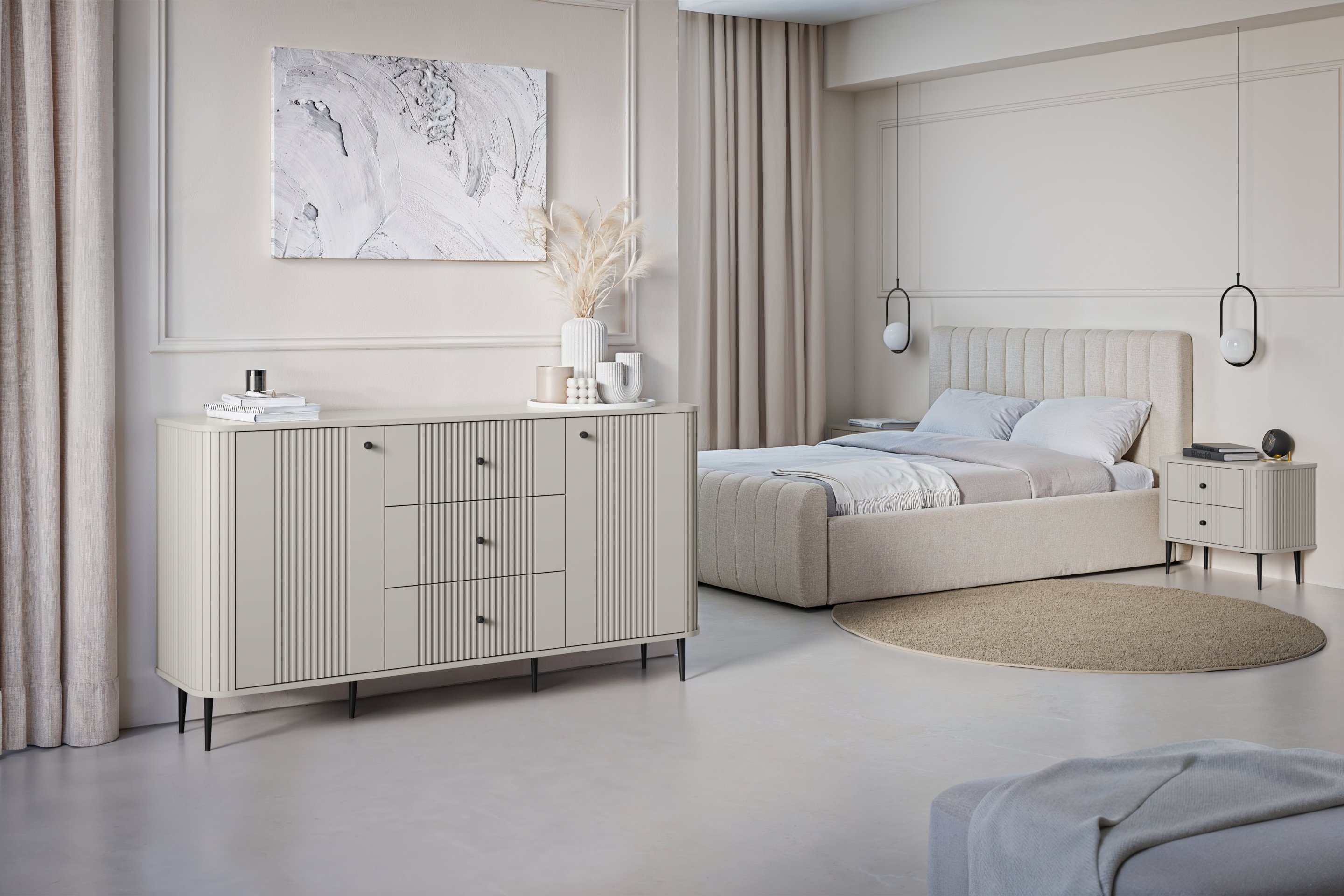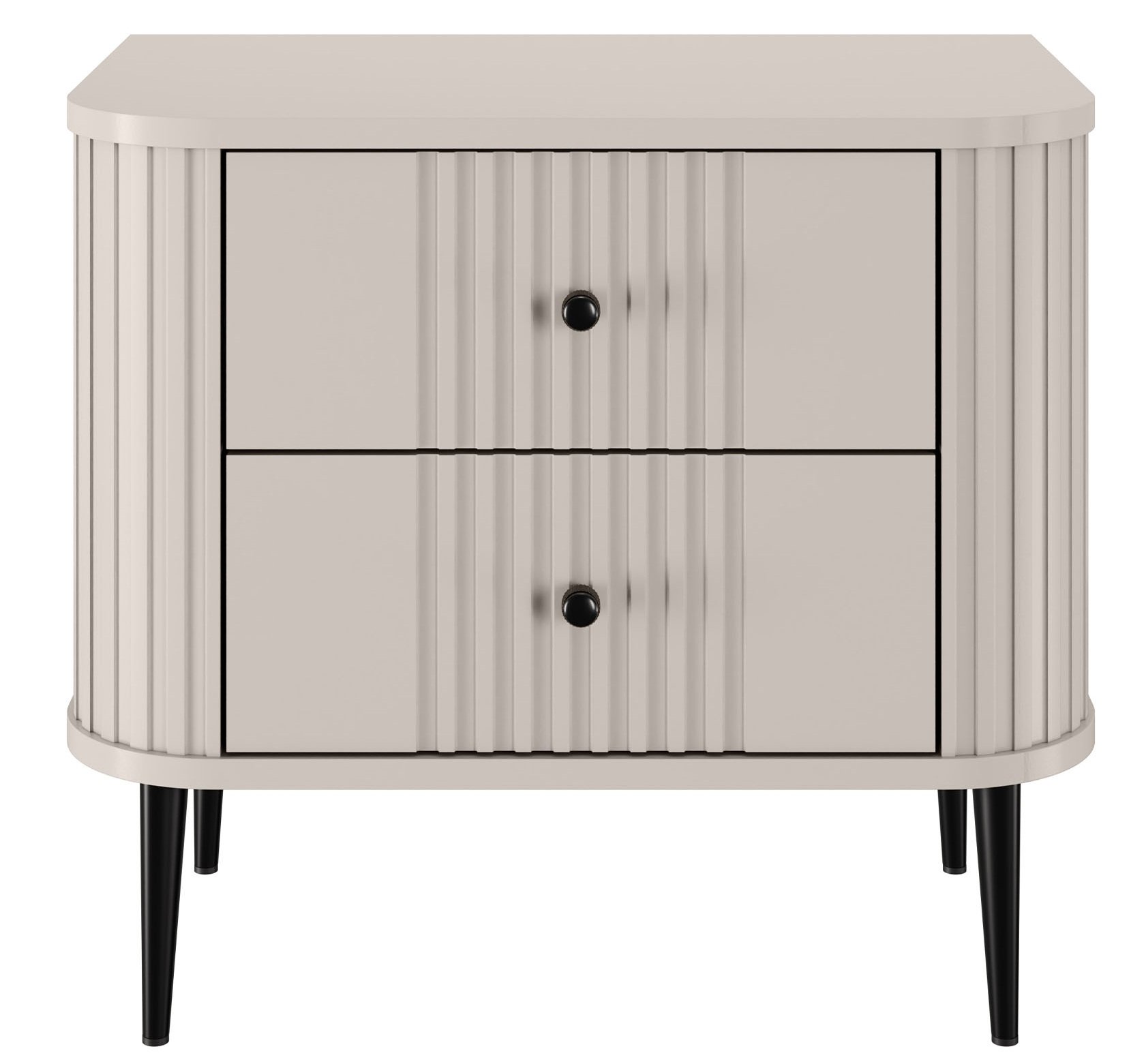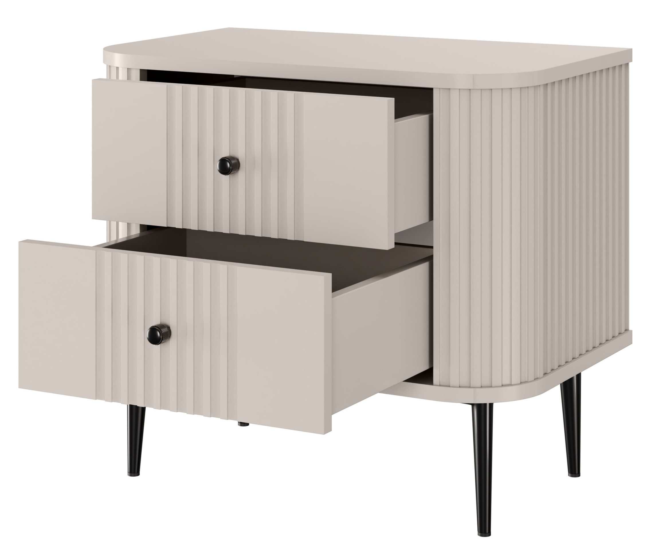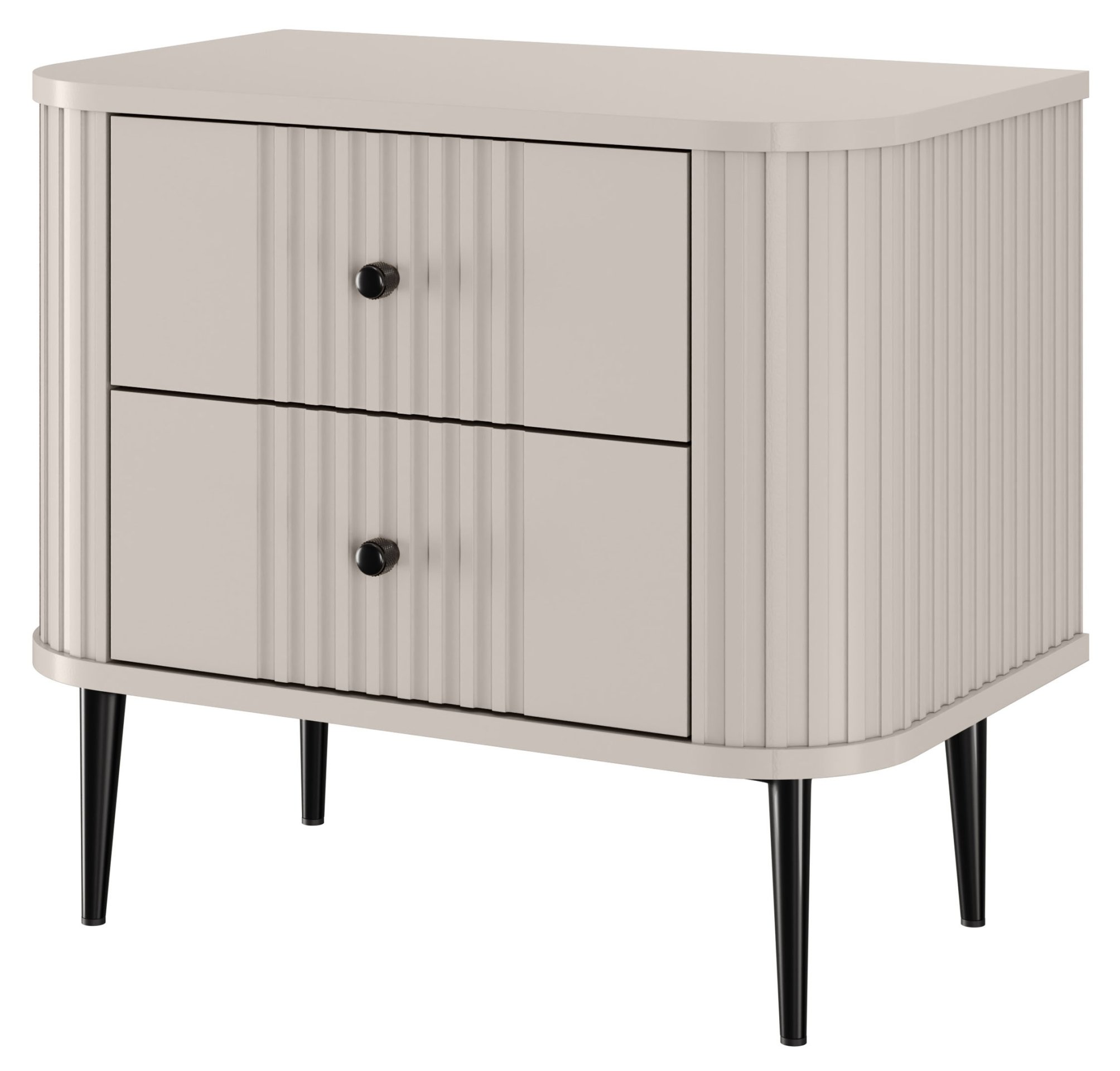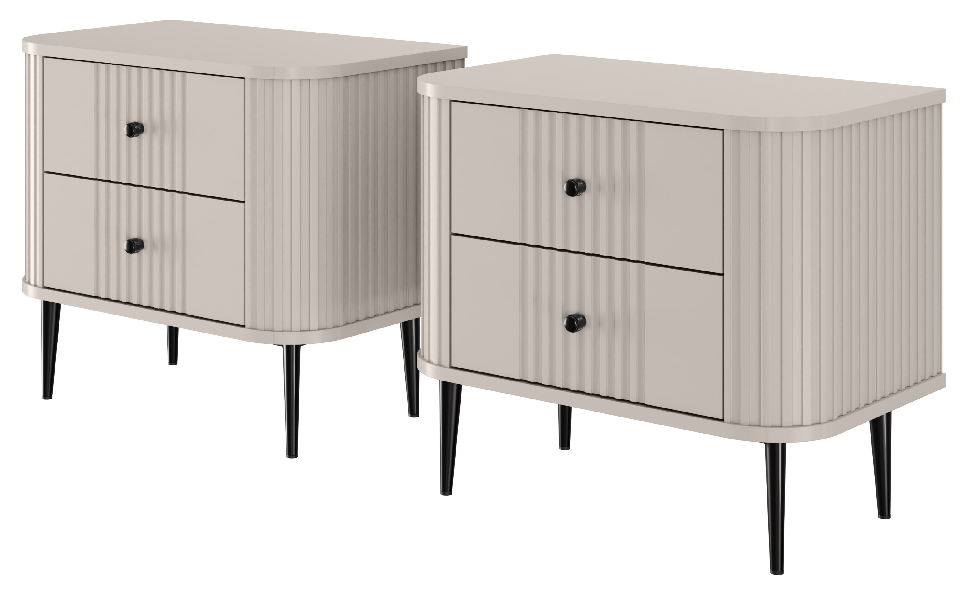 Predstavljamo vam komplet dviju noćnih ormarića Vesper 56 2SZ, koji spaja moderan dizajn i praktičnost te osvježava svaku spavaću sobu. Sa svojom nježnom kašmir bojom i crnim metalnim nogama, ovaj komplet donosi profinjenost koja će oduševiti sve ljubitelje modernog interijera.
