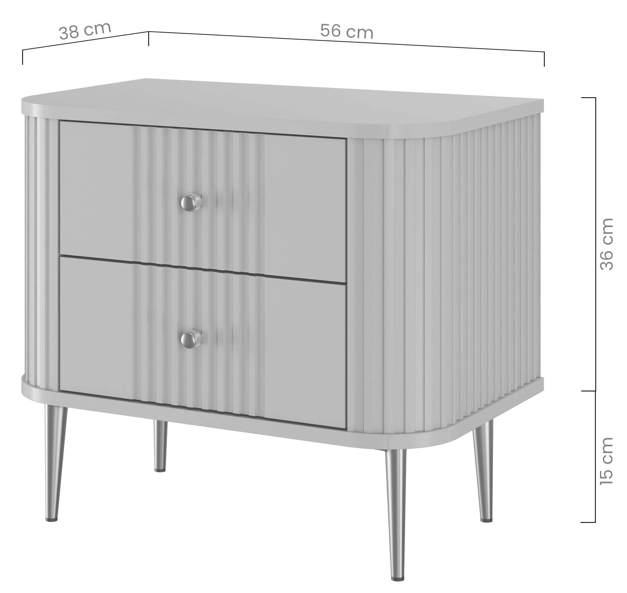 Svaki noćni ormarić izrađen je od visokokvalitetnih materijala koji osiguravaju trajnost i dugoročnu upotrebu. Korpus je napravljen od laminirane ploče debljine 16 mm, što osigurava stabilnost, dok su fronte od MDF ploče obložene PVC folijom, koja daje dodatnu zaštitu i sjaj. Rubovi su obrađeni ABS tehnologijom, što sprječava oštećenja i osigurava dugotrajan lijep izgled.