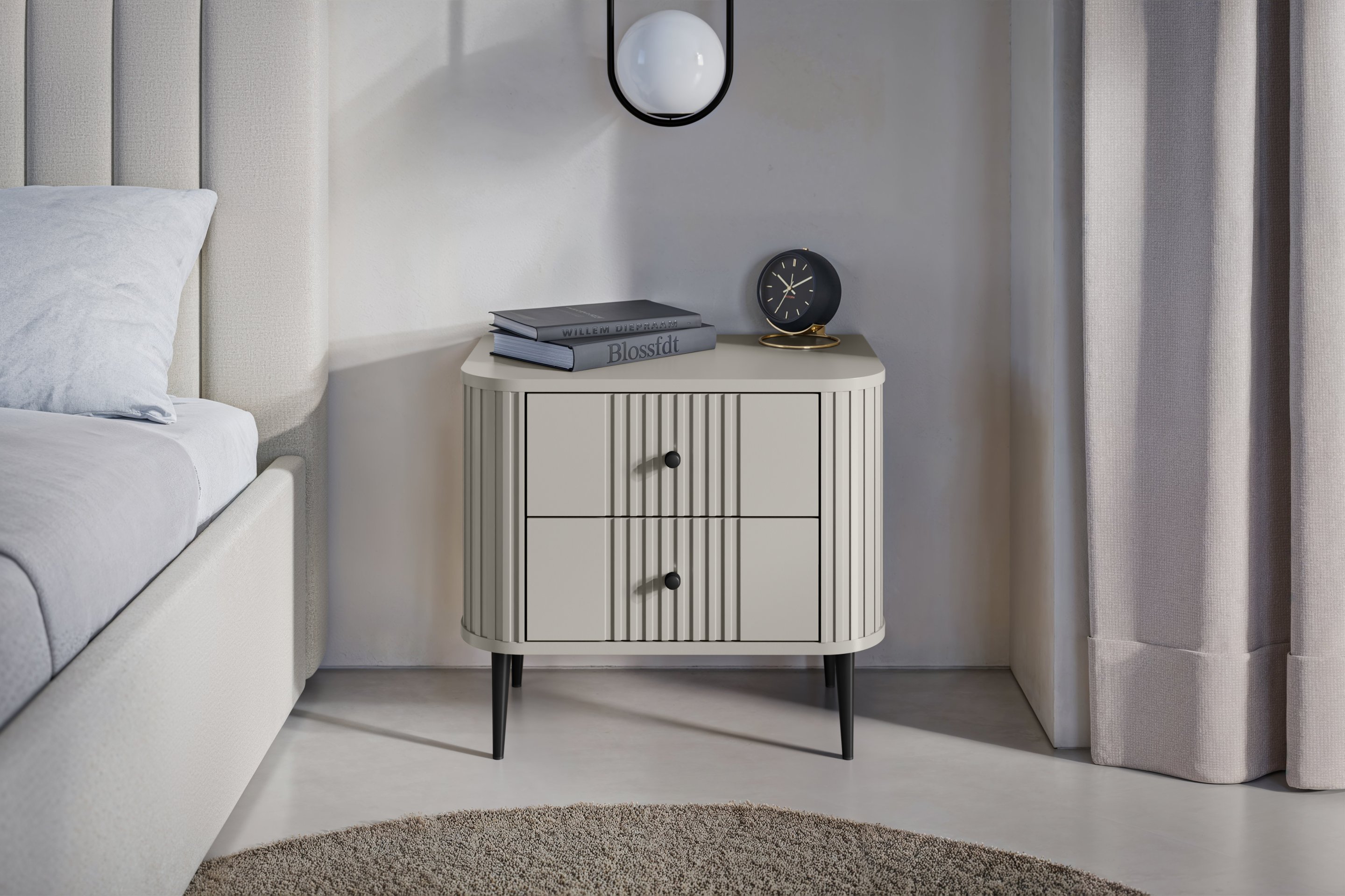 Elegantni dizajn: naglasak na kašmir boji u kombinaciji s crnim elementima daje noćnim ormarićima sofisticiranu notu, koja se lijepo uklapa s različitim stilovima namještaja. Crne metalne noge, visoke 15 cm, dodaju dašak industrijskog dizajna, a istovremeno omogućuju jednostavno čišćenje poda ispod ormarića.