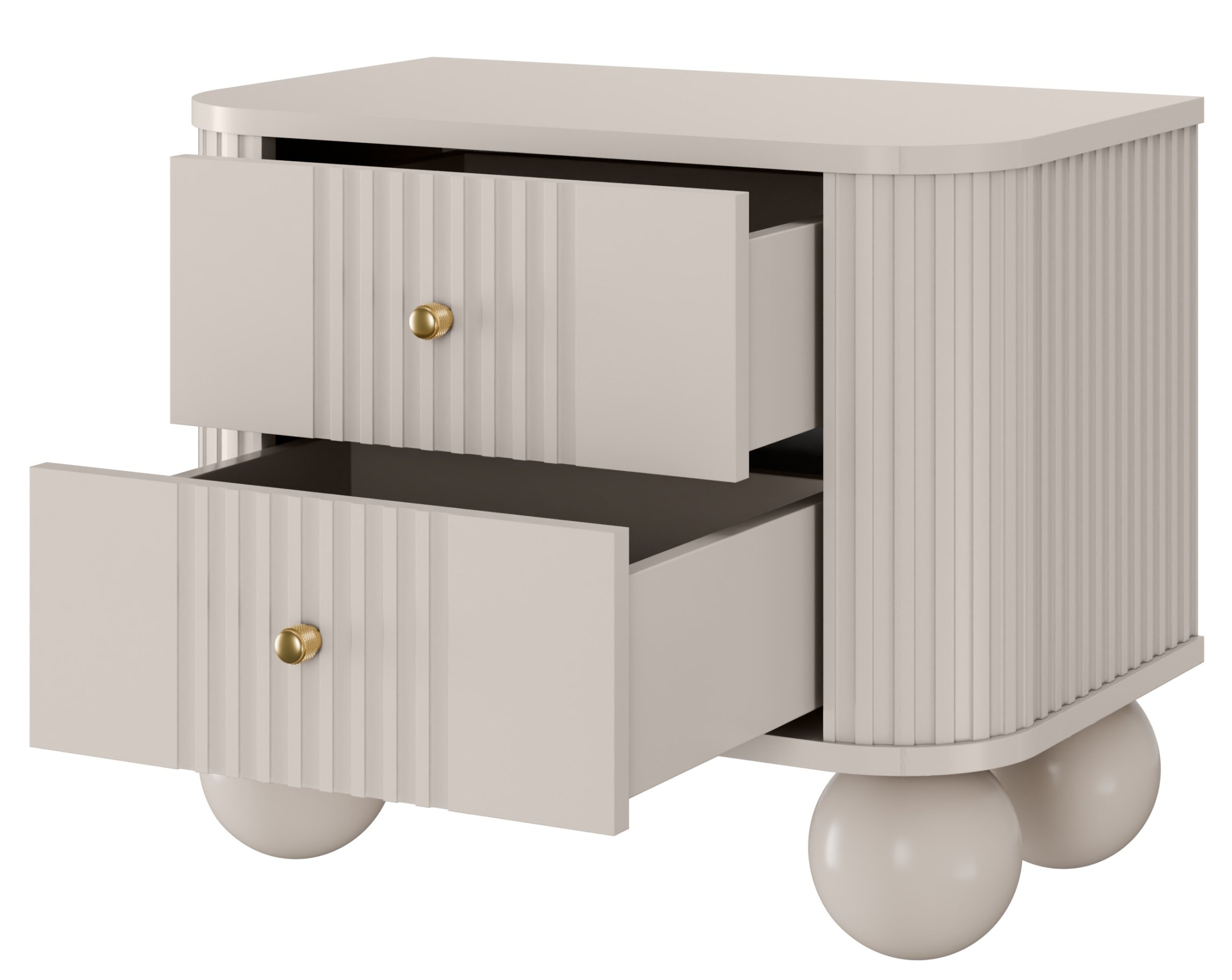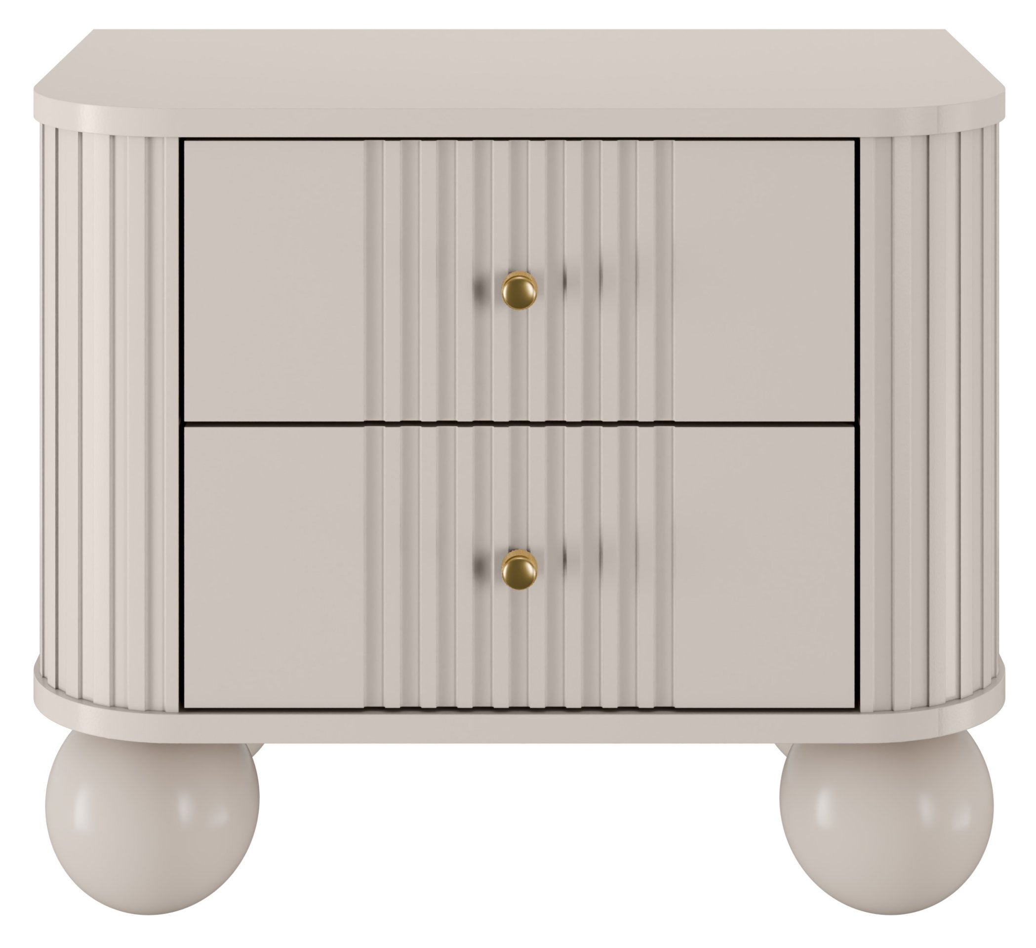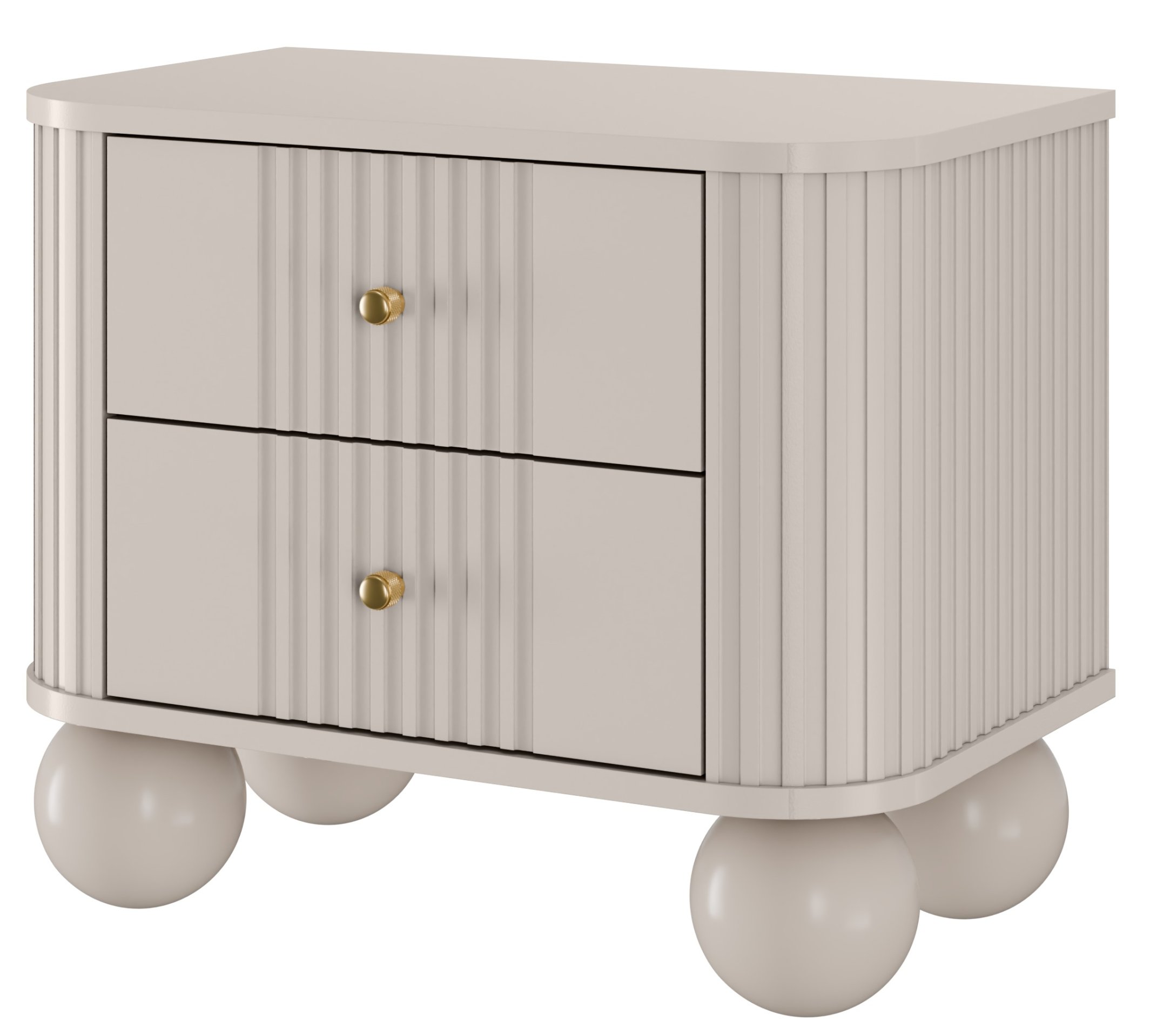 Jedinstvena boja kašmira dodaje dašak profinjenosti, dok okrugle, drvene noge visine 12 cm osiguravaju stabilnost i olakšavaju čišćenje ispod namještaja. Zlatne okrugle ručke su točka na i, dodajući dašak luksuza i usklađujući se s modernom estetikom.
