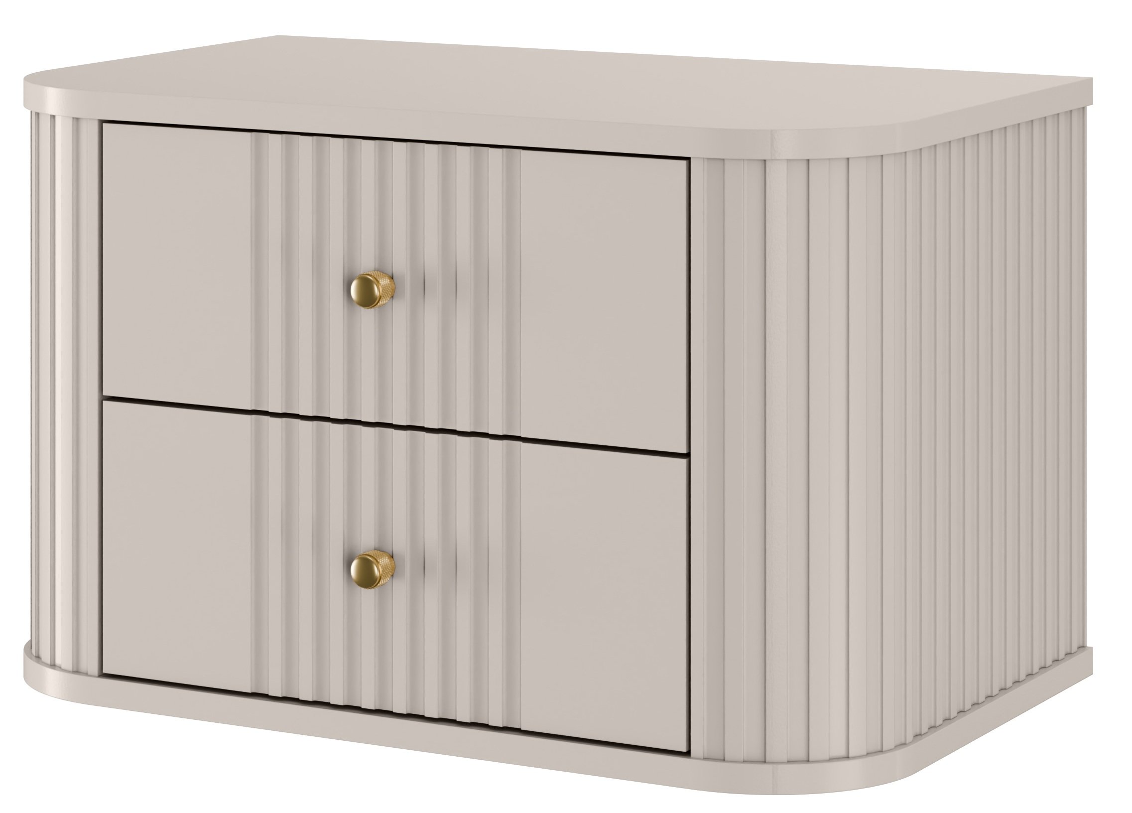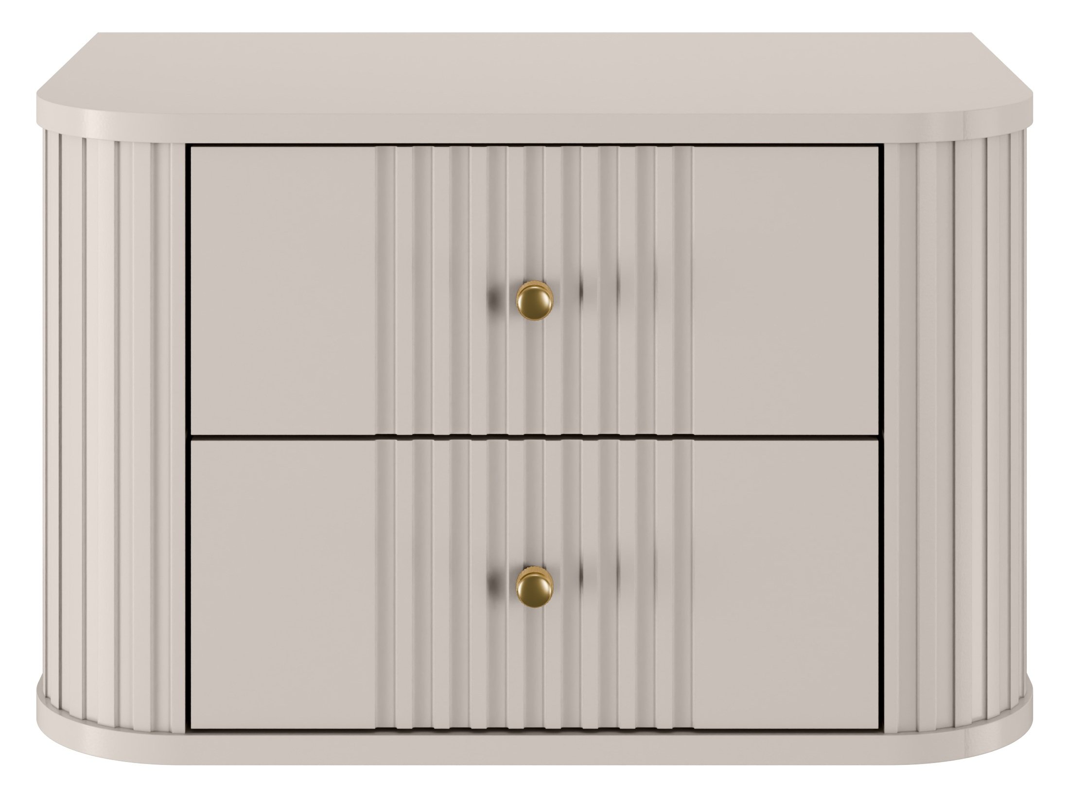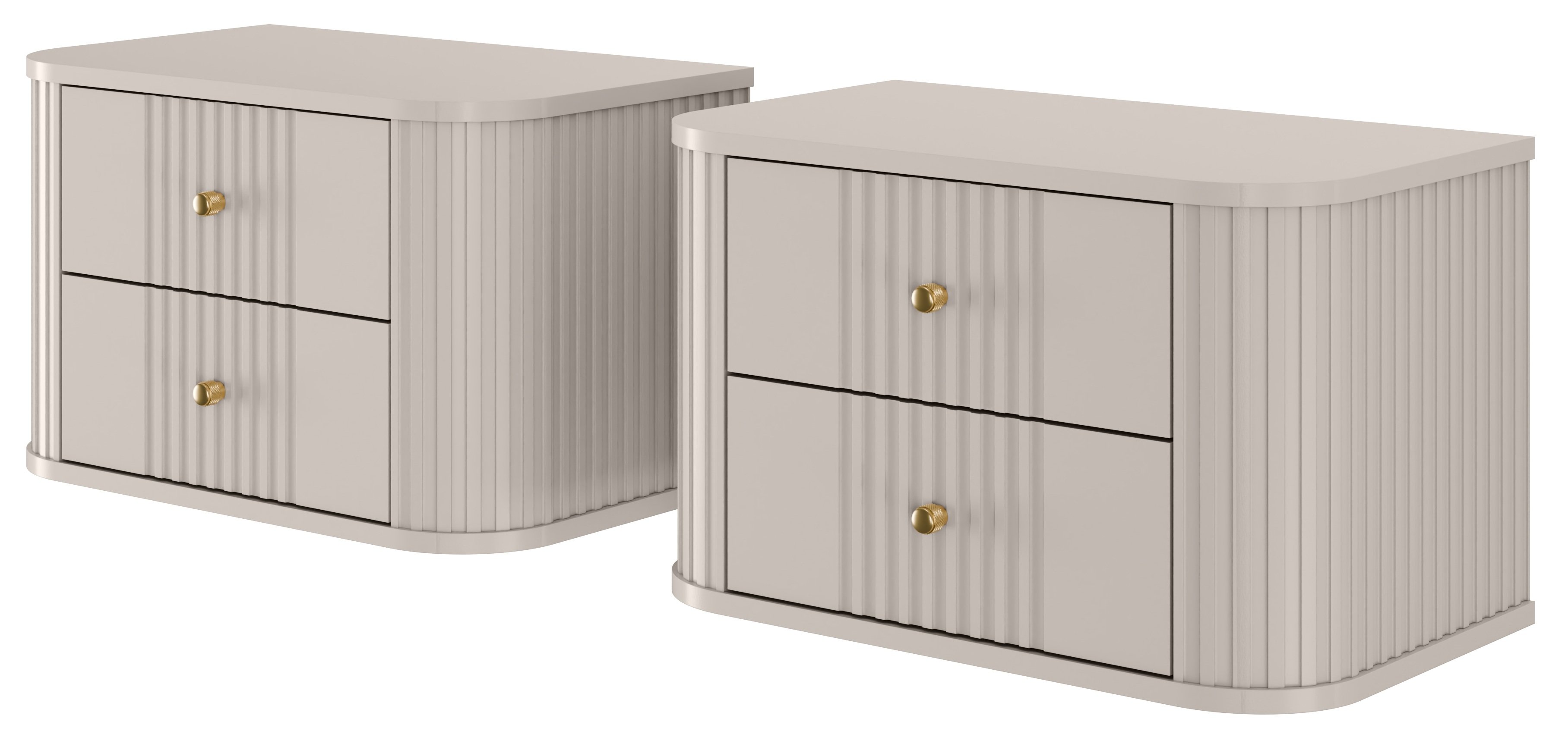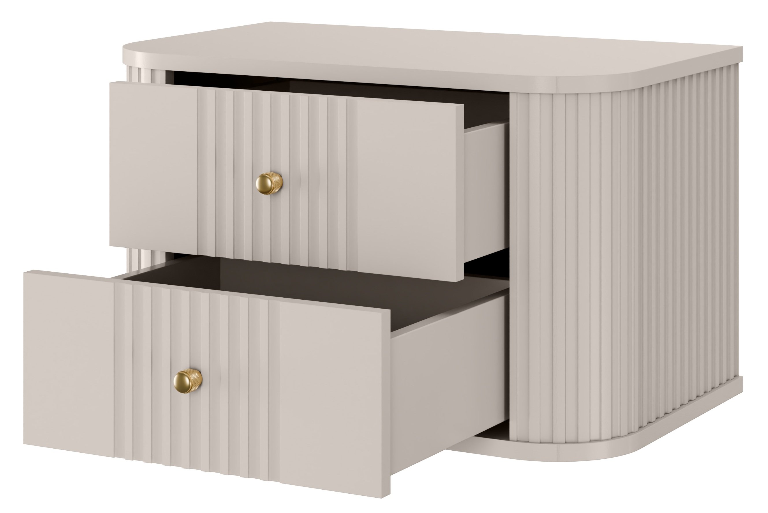 Unesite dašak profinjenosti u svoju spavaću sobu s prekrasnim zidnim kompletom dvaju noćnih ormarića Vesper. Ovaj pomno osmišljen komplet, odjeven u nježnu kašmir boju i ukrašen elegantnim zlatnim ručkama, savršena je kombinacija funkcionalnosti i estetike. Vesper ormarići dizajnirani su tako da vašem prostoru dodaju dašak luksuza, a istovremeno nude praktično rješenje za pohranu.