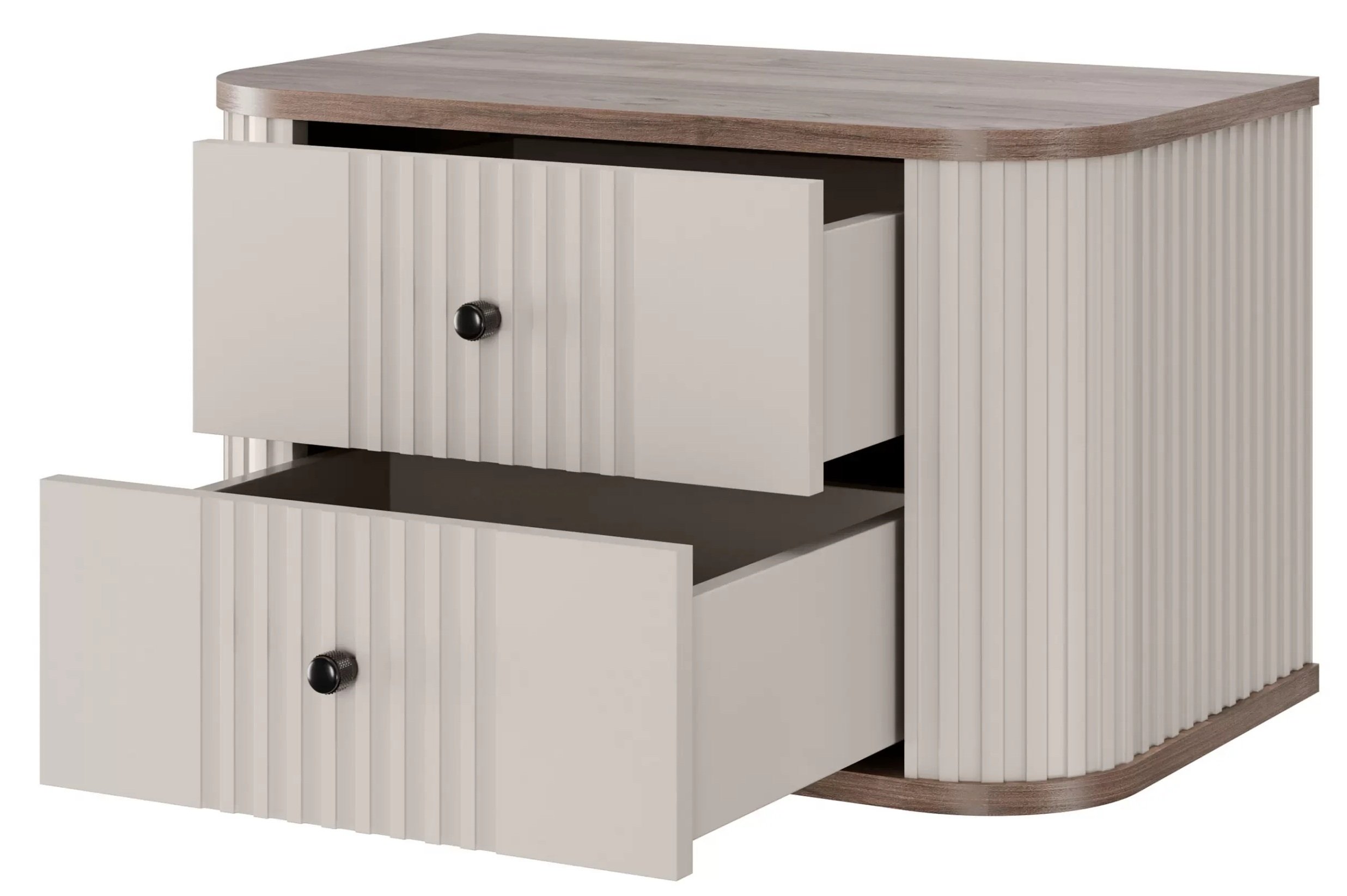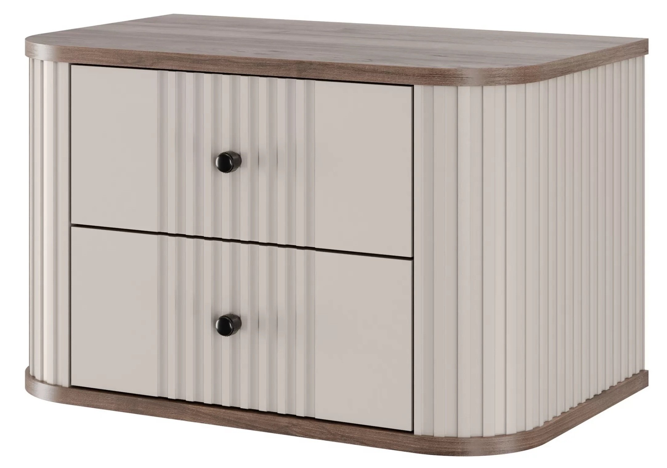 Komplet noćnih ormarića Vesper odlikuje se profinjenim dizajnom koji uključuje kombinaciju boja kašmir i orah. Upotreba visokokvalitetnih materijala, poput laminirane ploče i MDF ploče, osigurava izdržljivost i dugotrajnu upotrebu. Površina je obrađena PVC folijom koja dodatno štiti i naglašava prirodan izgled drva.