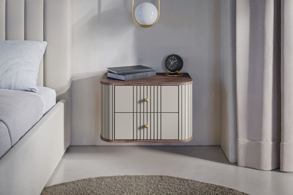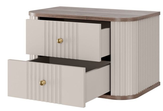Otkrijte profinjenost i praktičnost sa zidnim kompletom dviju noćnih ormarića Vesper u prekrasnoj kombinaciji kašmira i oraha, koji će zasigurno privući pažnju u vašoj spavaćoj sobi. Svaki detalj ovog kompleta osmišljen je s mislima na moderan dizajn i bezvremensku estetiku, koja će upotpuniti svaki prostor.