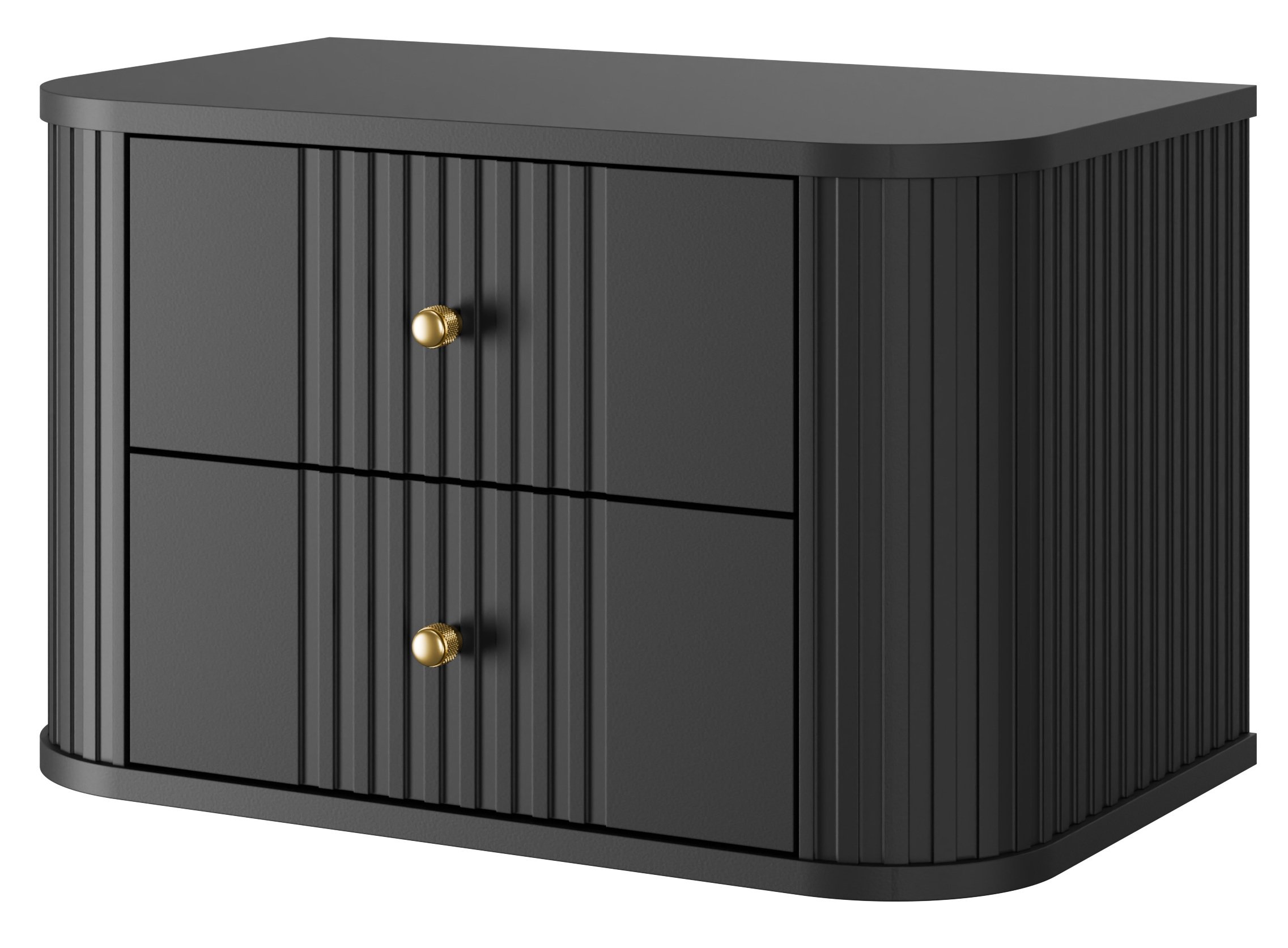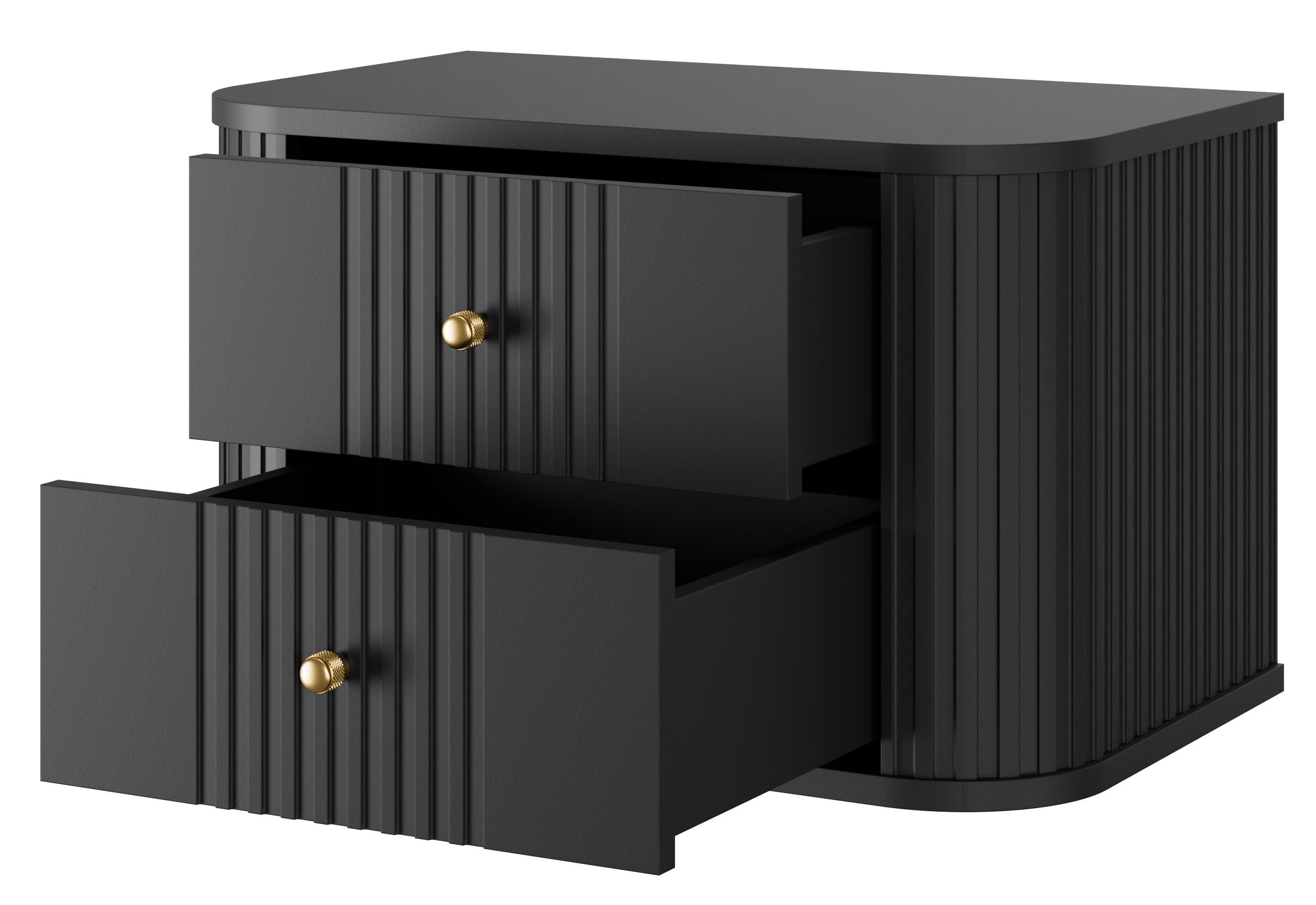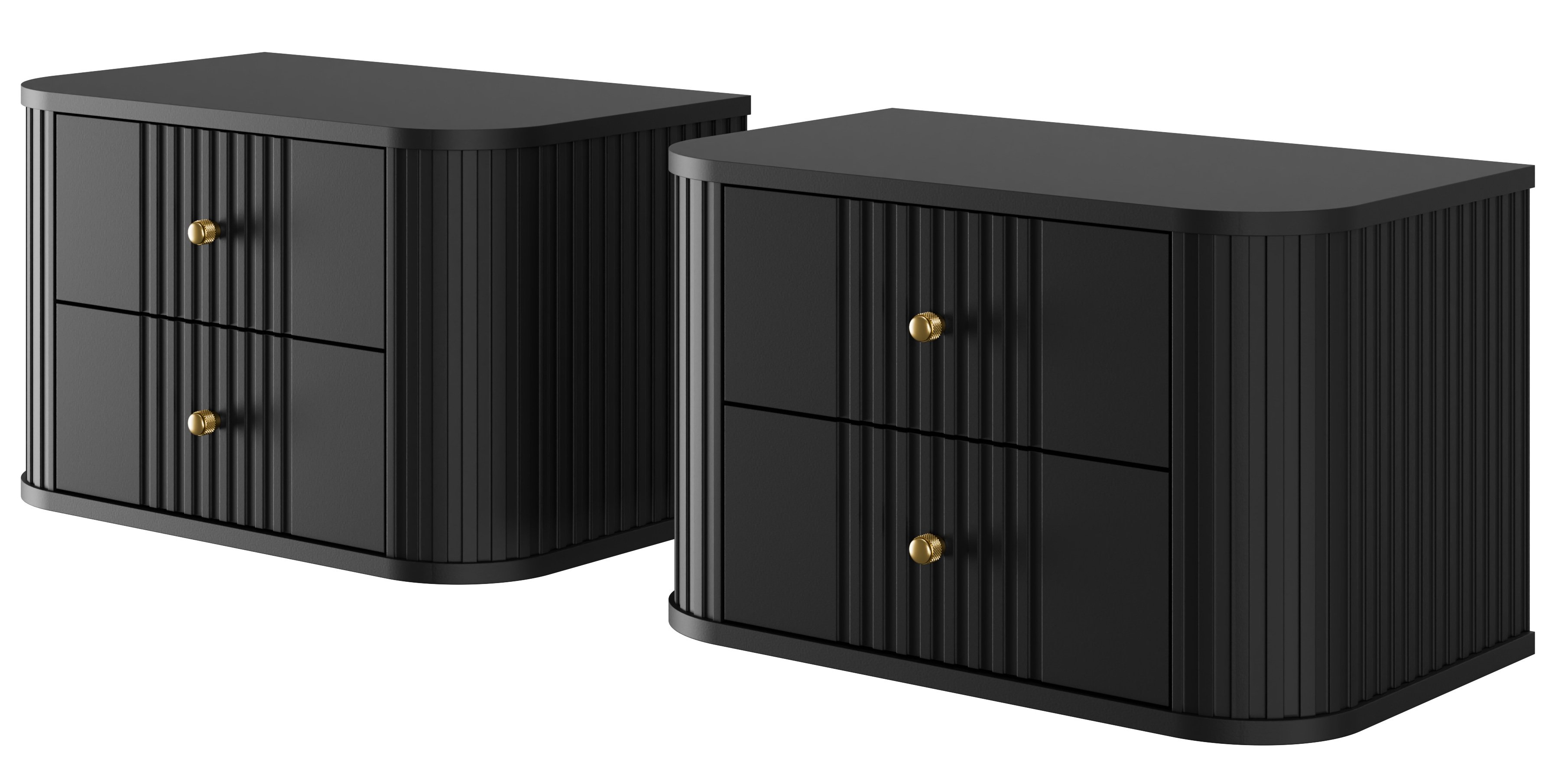 Predstavljamo vam zidni komplet od dva noćna ormarića Vesper 56 2SZ, koji će vašem spavaćem prostoru dodati dašak profinjenosti i elegancije. Svojim minimalističkim dizajnom i kontrastom između crne boje i zlatnih ručki, ovi ormarići ne služe samo kao praktično rješenje za pohranu, već i kao dekorativni element koji će privući poglede.
