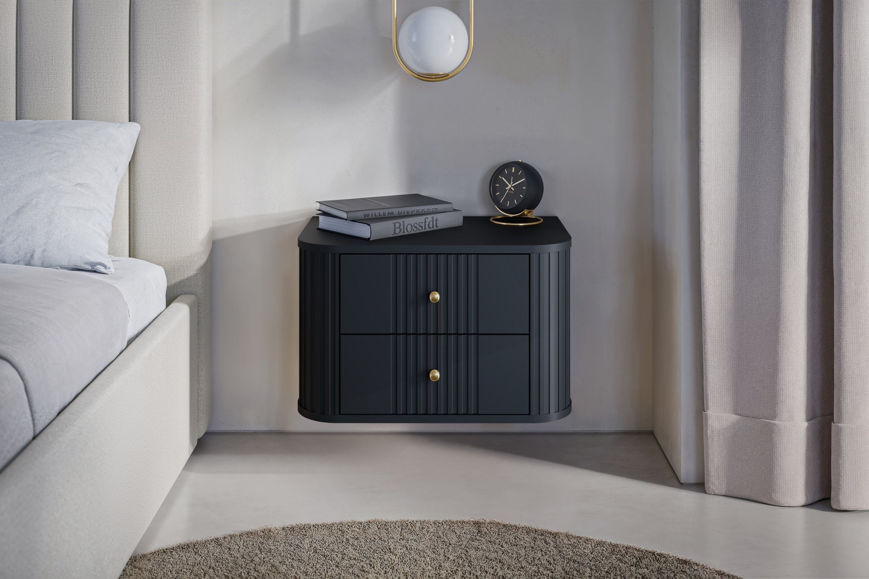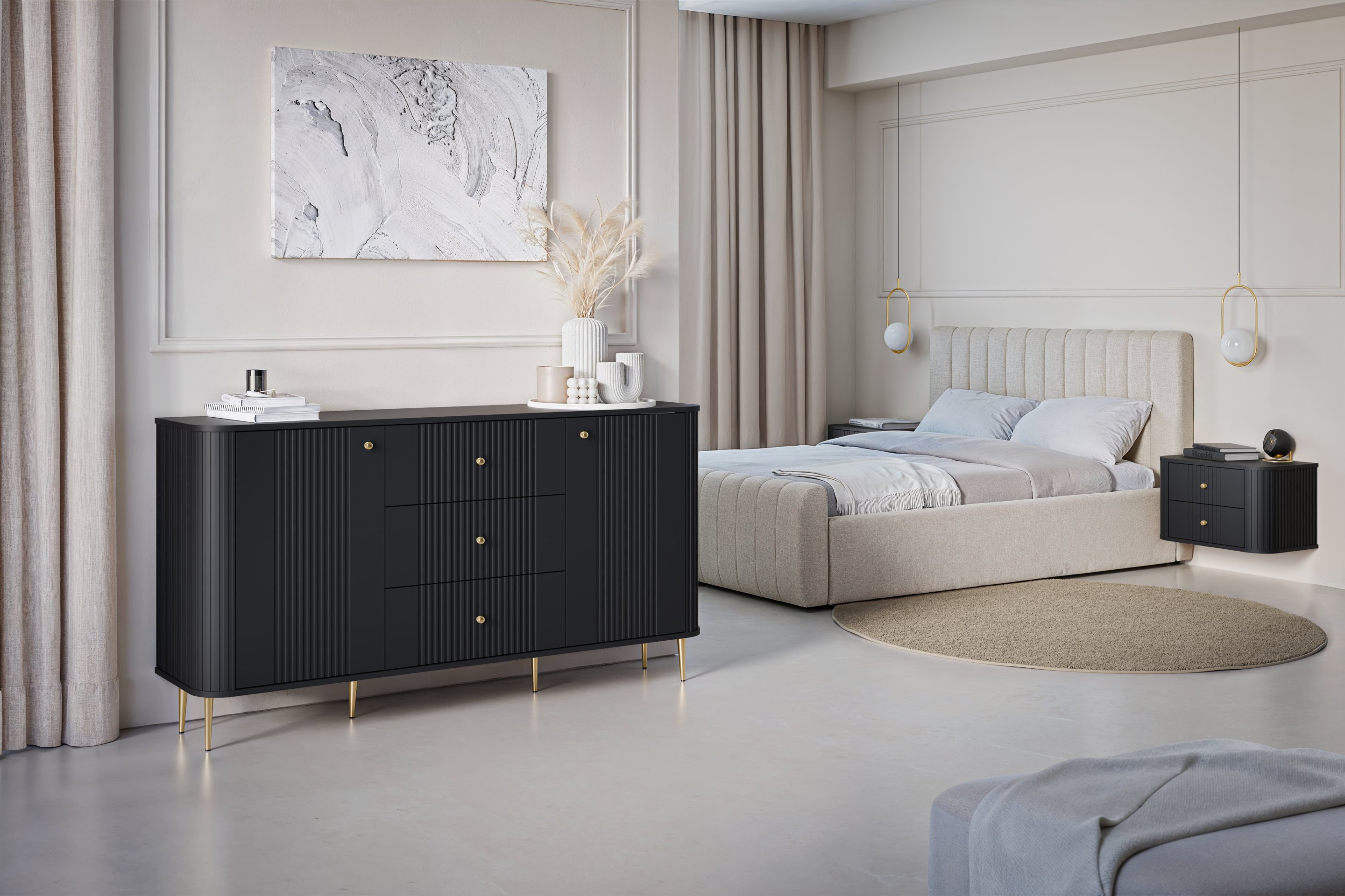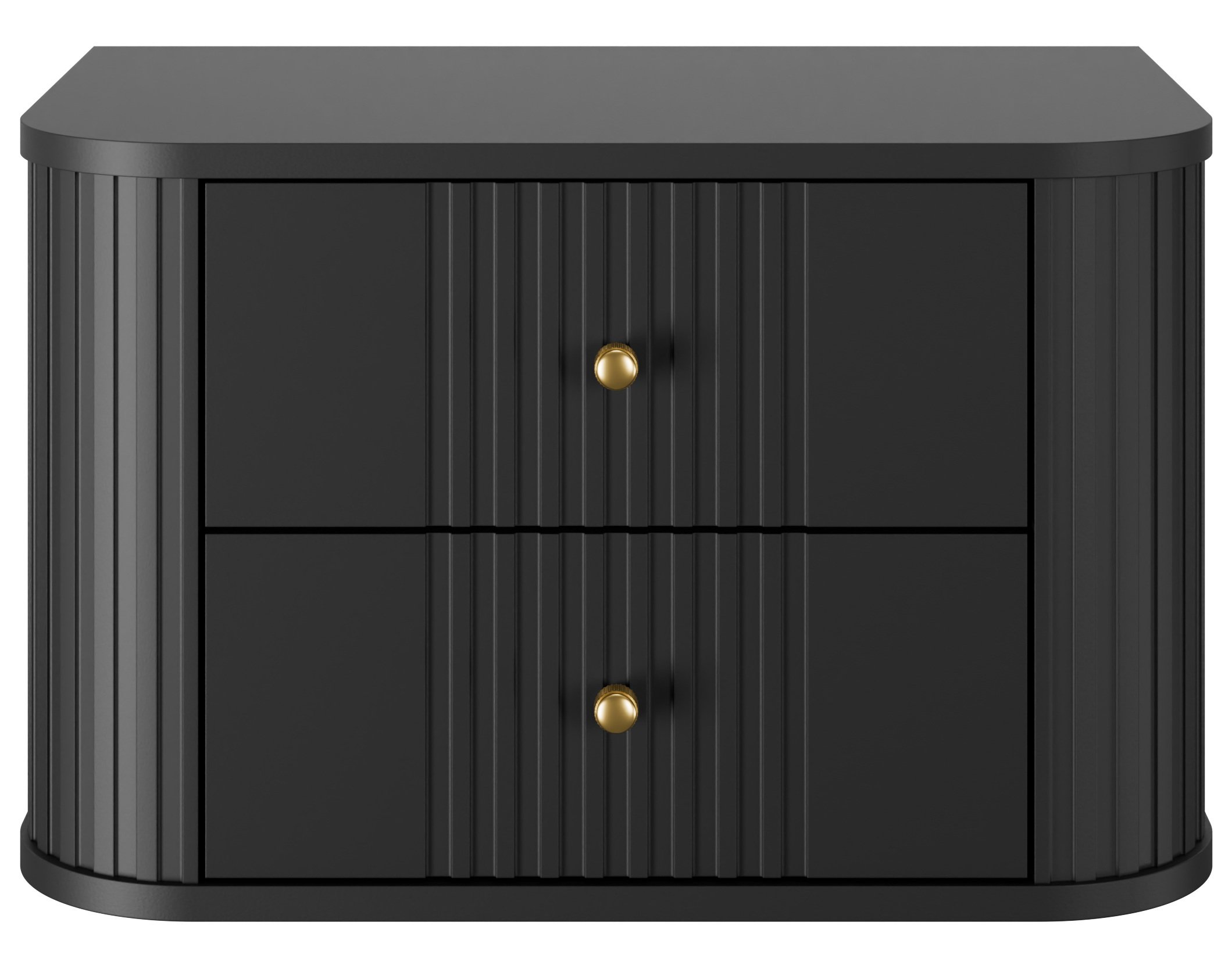 Predstavljamo vam zidni komplet od dva noćna ormarića Vesper 56 2SZ, koji će vašem spavaćem prostoru dodati dašak profinjenosti i elegancije. Svojim minimalističkim dizajnom i kontrastom između crne boje i zlatnih ručki, ovi ormarići ne služe samo kao praktično rješenje za pohranu, već i kao dekorativni element koji će privući poglede.