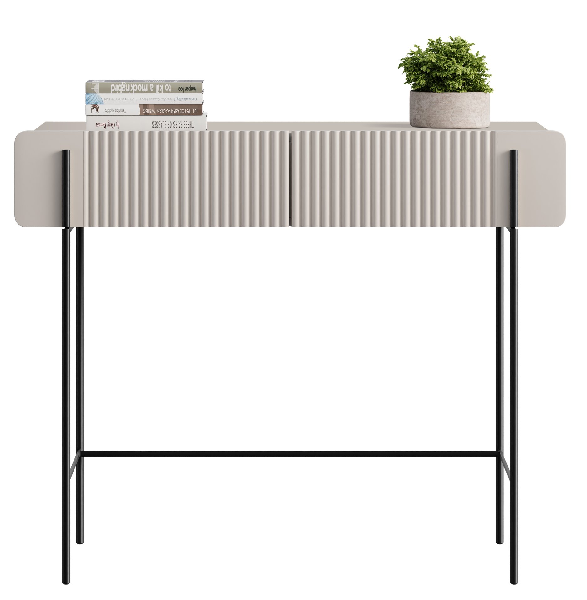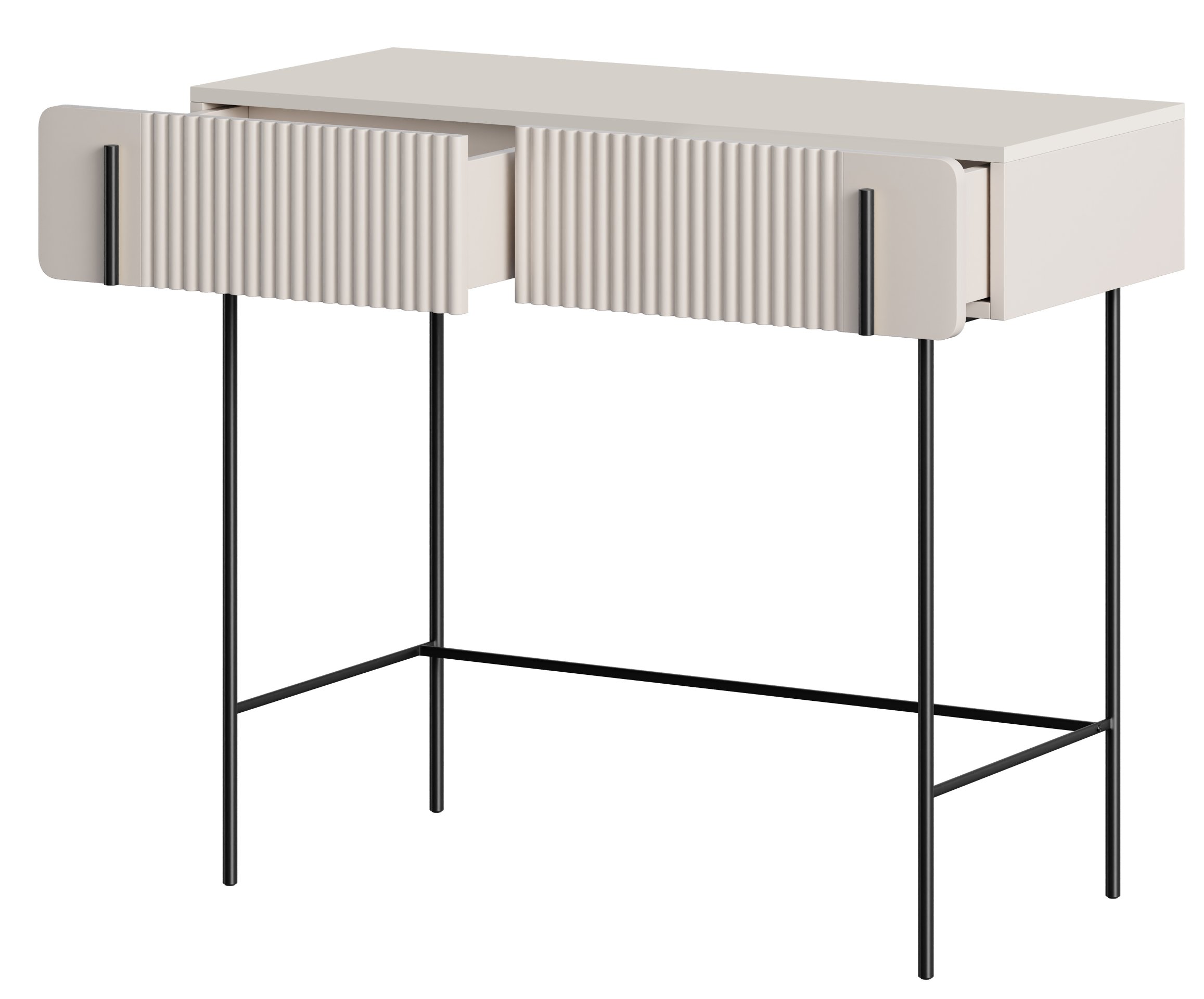 Toaletni stolić Malmi izrađen je s vrhunskom preciznošću, što se odražava u kvalitetnim materijalima i promišljenom dizajnu. Korpus je napravljen od ploče debljine 16 mm, koja osigurava trajnost i stabilnost. Fronte od MDF ploče, obložene PVC folijom, dodaju dašak suvremenosti i elegancije. Rubovi su zaštićeni ABS trakom, što dodatno povećava otpornost na svakodnevna opterećenja. Kombinacija kašmira i krem bijele boje unosi nježnost i toplinu u svaki prostor. Praškasto lakirani metalni okvir nogu osigurava čvrstoću i moderan izgled, koji se savršeno uklapa u svaki interijer.