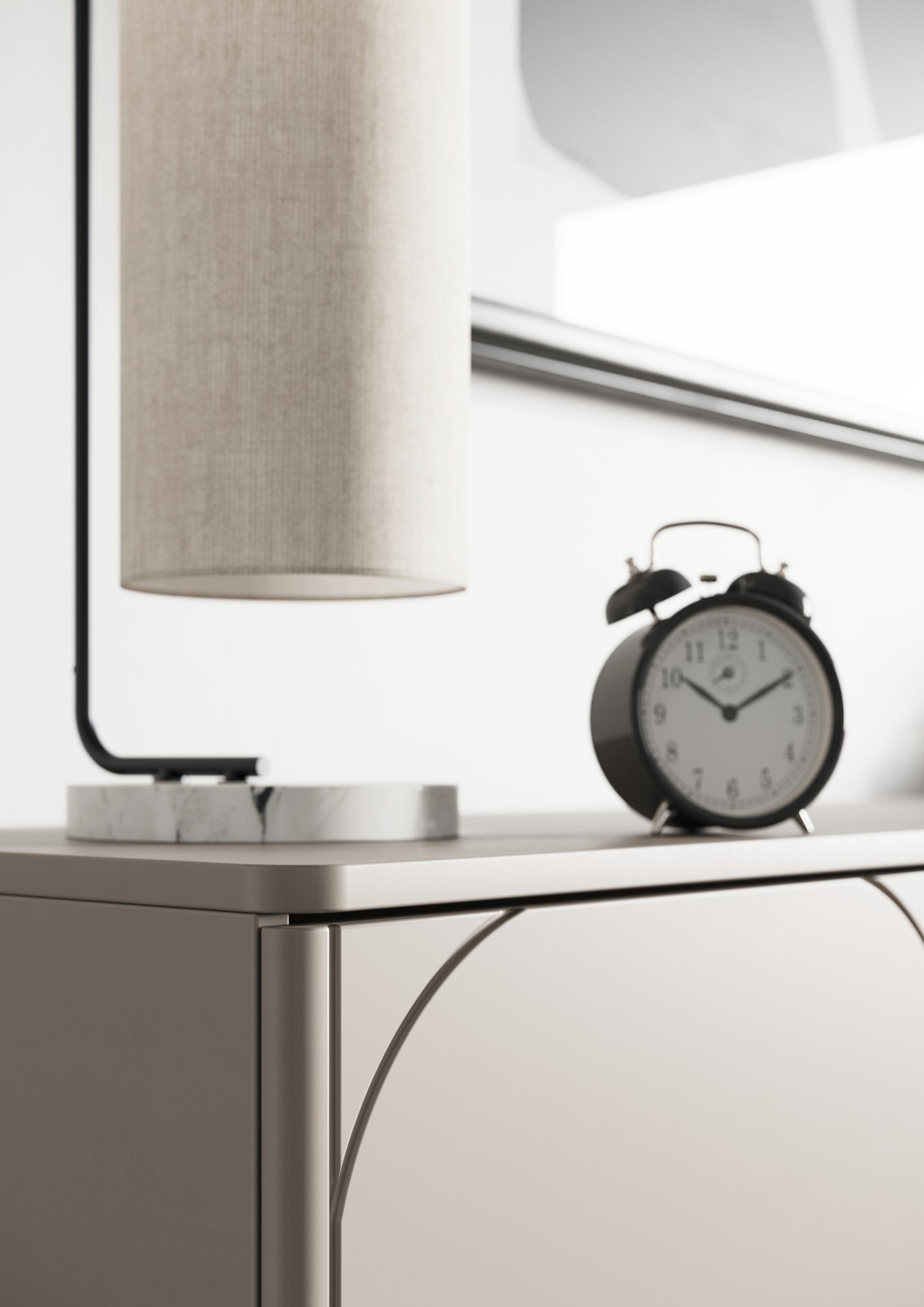 Izrađen je od visokokvalitetne ploče za namještaj debljine 18 mm, što osigurava iznimnu izdržljivost i dug vijek trajanja. Površina je prekrivena super mat PVC folijom koja je otporna na ogrebotine i jednostavna za čišćenje. Crna boja dna, polica i središnjih elemenata dodaje dašak suvremene elegancije koja se lako uklapa u različite spavaće ambijente.