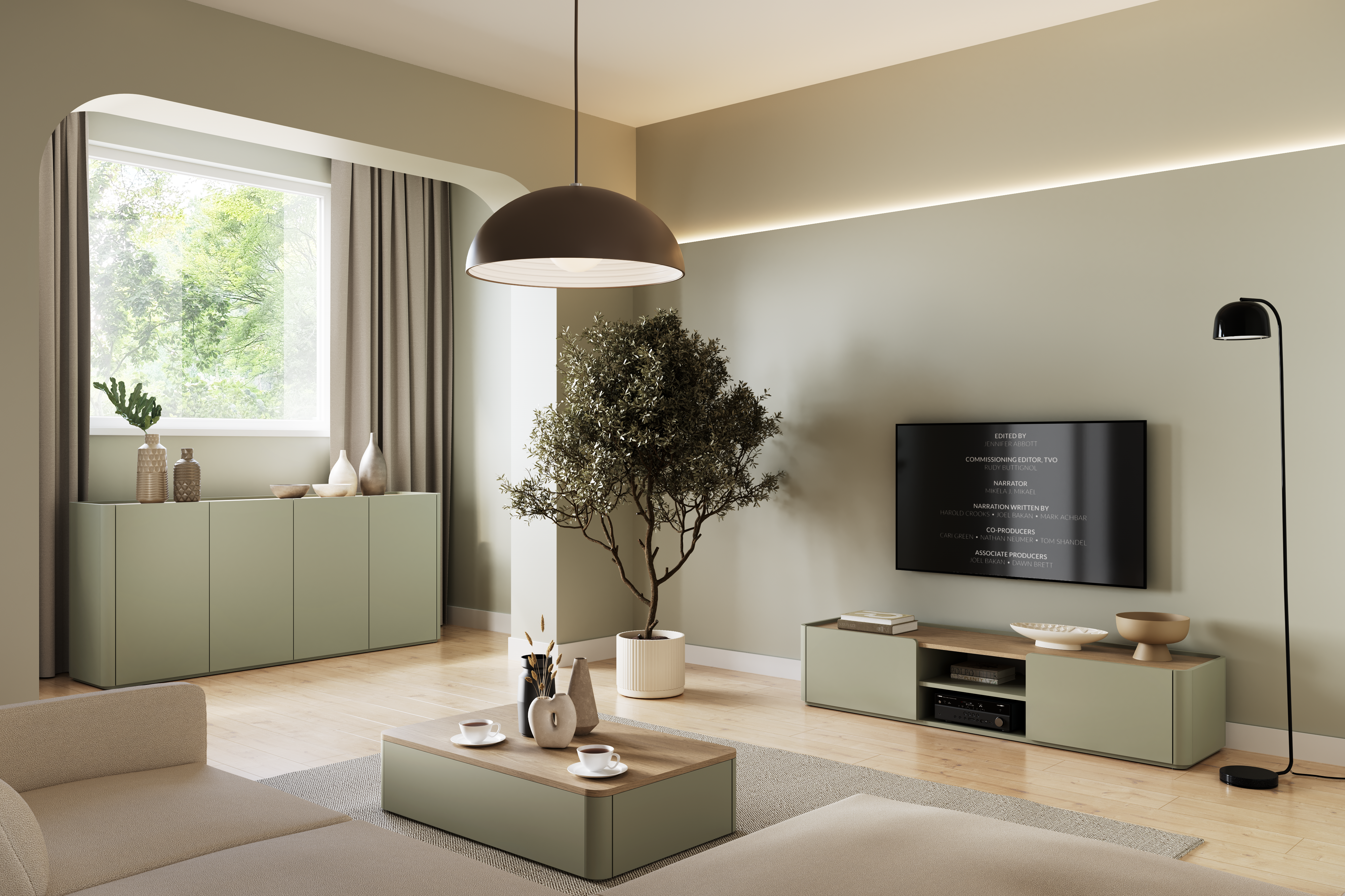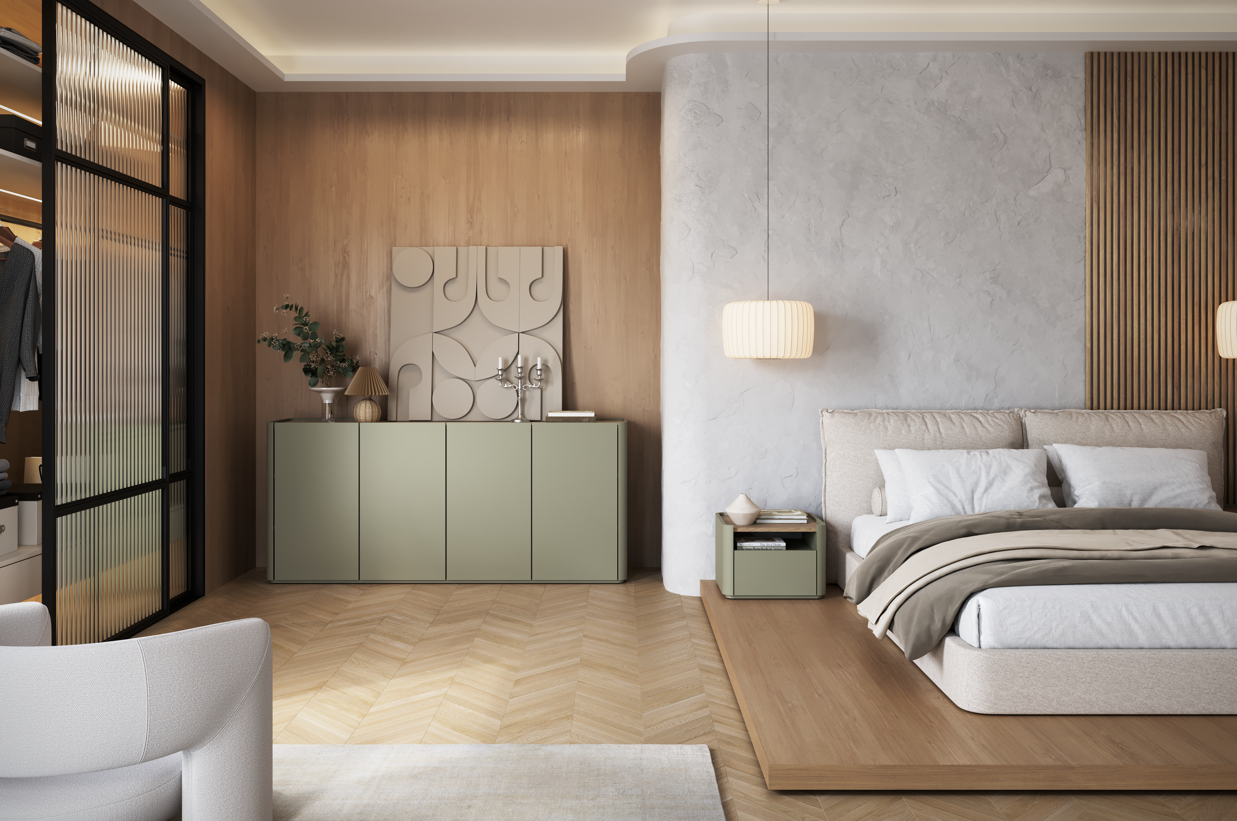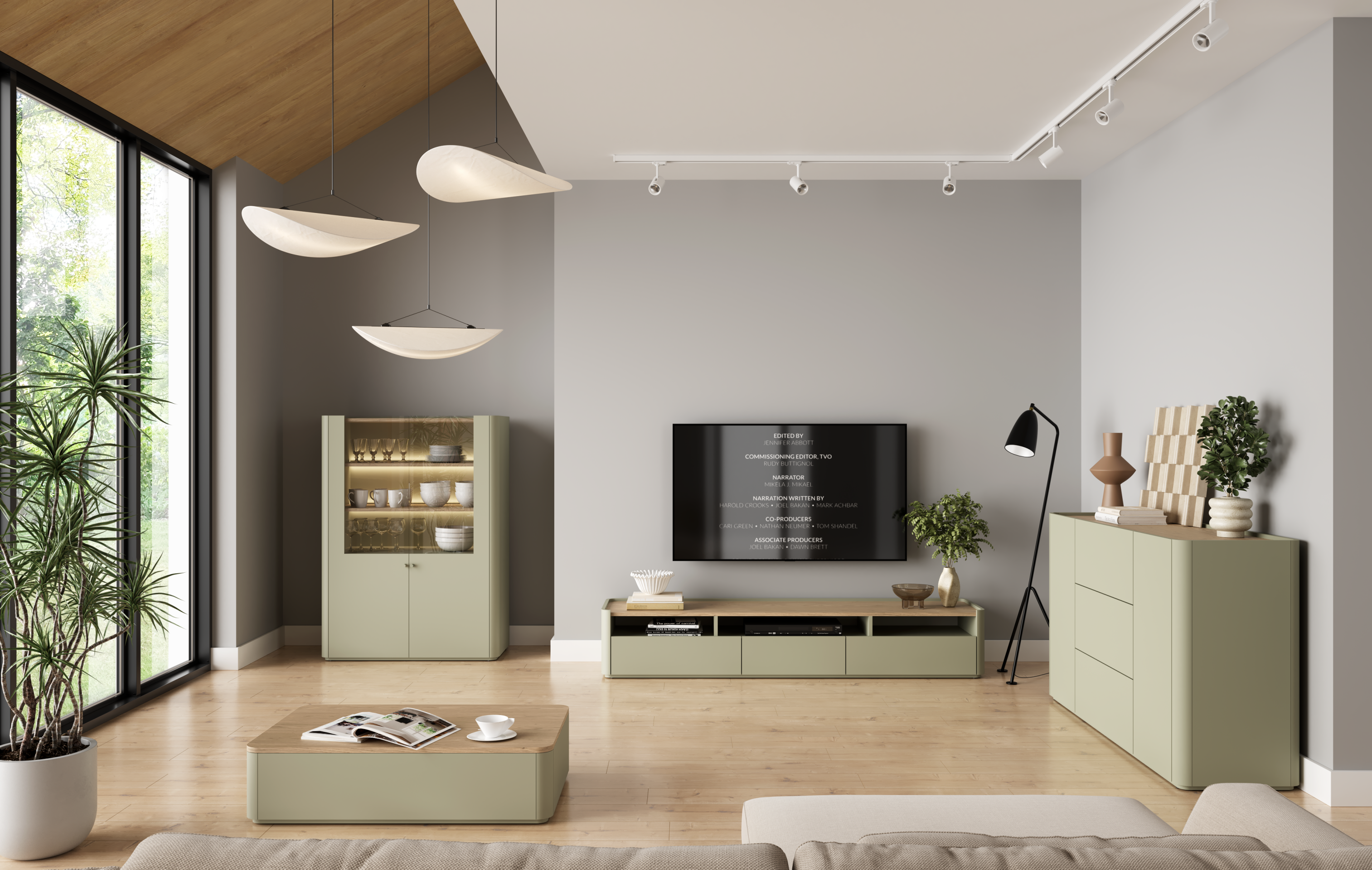 Model Elivo ističe se svojom svestranošću. Dizajniran je tako da se savršeno uklapa i u dnevni boravak i u spavaću sobu. U dnevnom prostoru dijelovi kolekcije mogu služiti kao središnji element za pohranu knjiga, dekoracija ili multimedijskih uređaja, dok se u spavaćoj sobi mogu koristiti kao garderobni ili pomoćni elementi. Kombinacija eukaliptusa i svijetlog hrasta vizualno povećava prostor i daje mu osjećaj svježine.