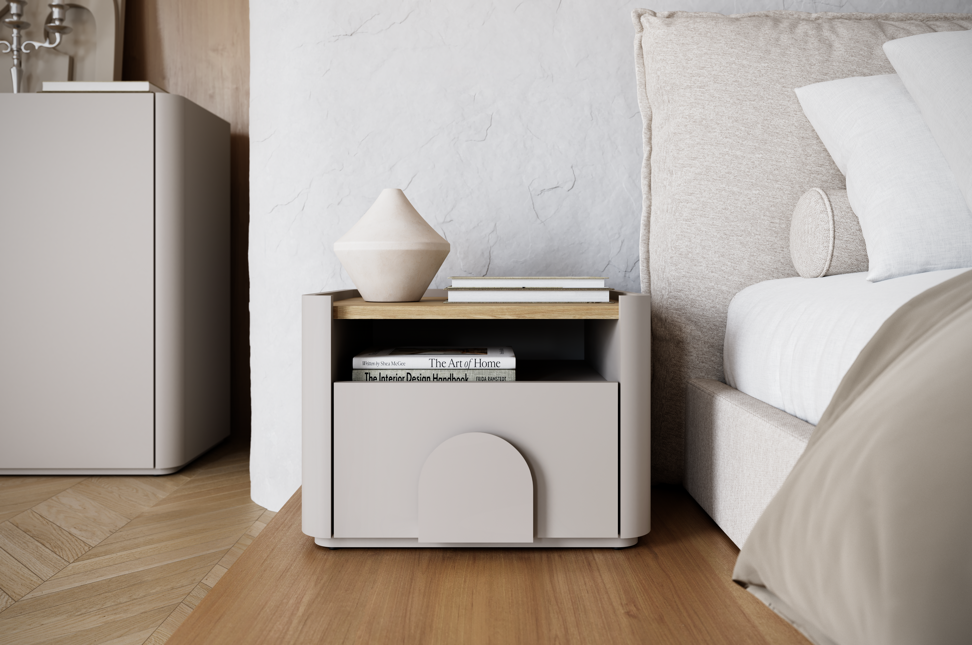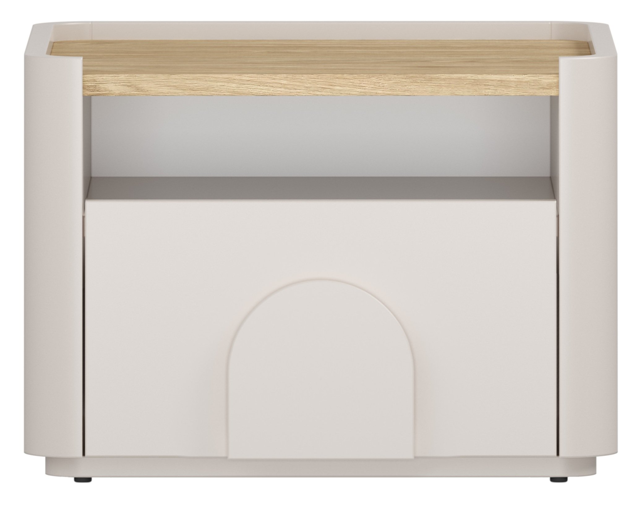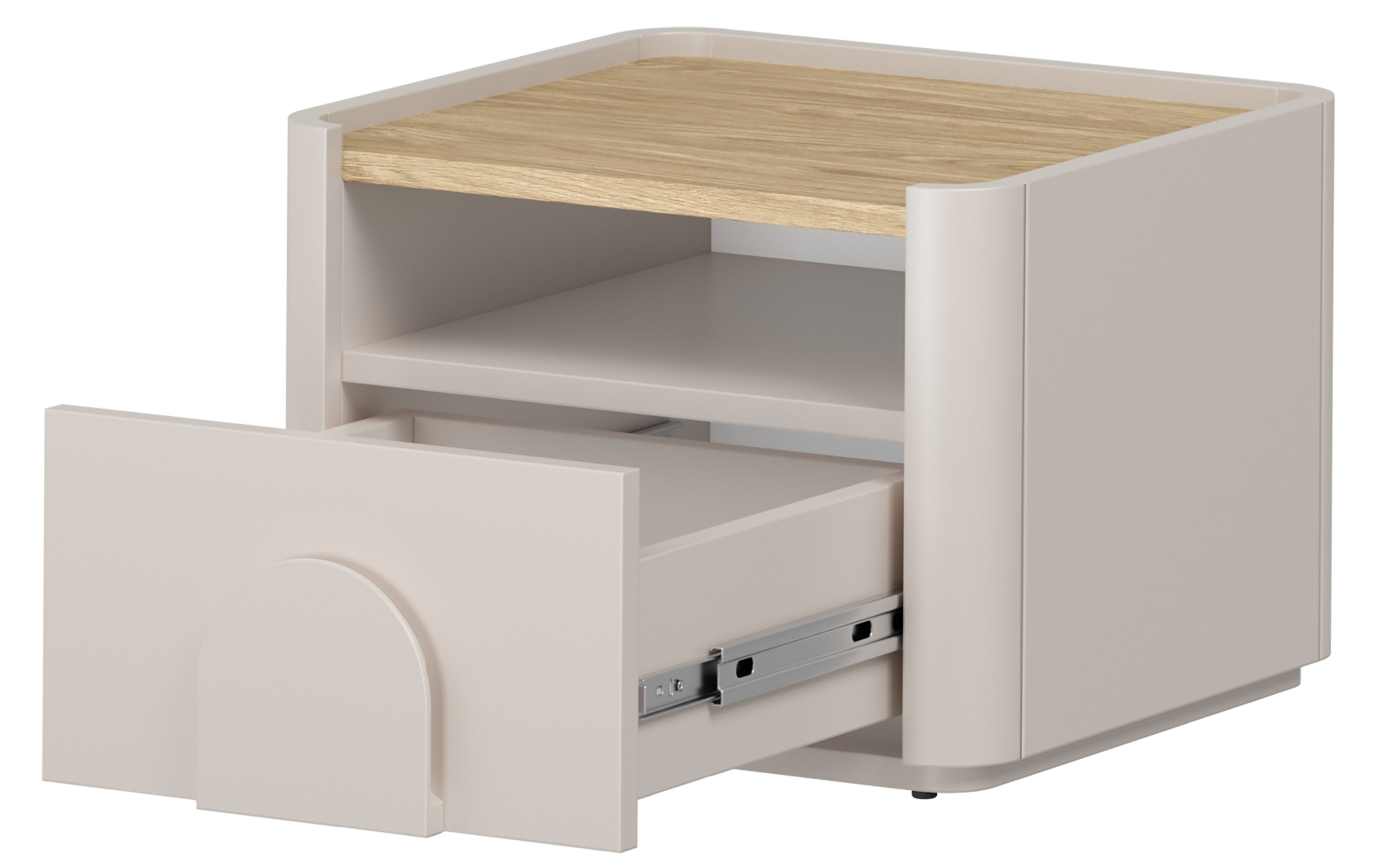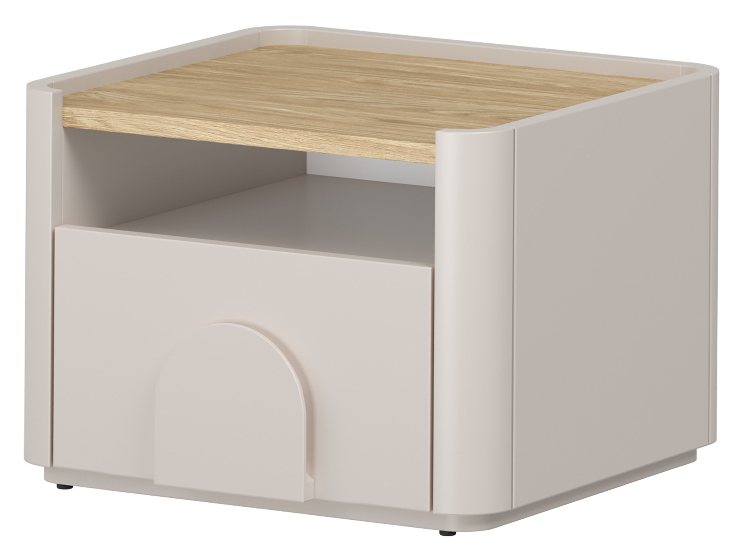 Ormarić je dizajniran u nijansi kašmir, koju nadopunjuje gornja ploča u uljenom hrastu. Ova kombinacija boja djeluje smireno i prirodno, a ujedno se lijepo uklapa s različitim tonovima namještaja i tekstila. Površina s nježnim sjajem naglašava strukturu drveta, dok zaobljeni rubovi i minimalističke ručkice u boji kašmira dodaju dašak suvremene elegancije. Takav dizajn omogućuje da se noćni ormarić Amilio 50 1SZ bez poteškoća uklopi u različite stilove unutarnjeg uređenja – od skandinavskog do modernog ili rustikalnog.