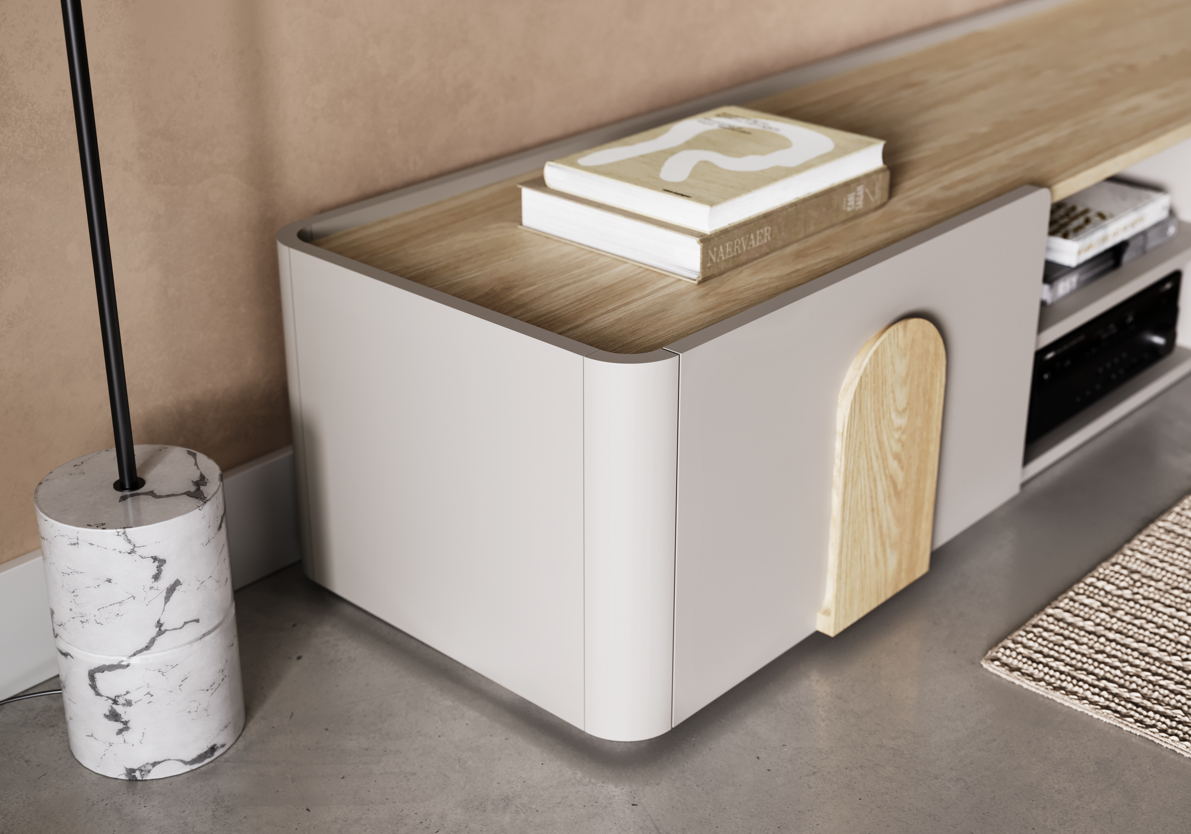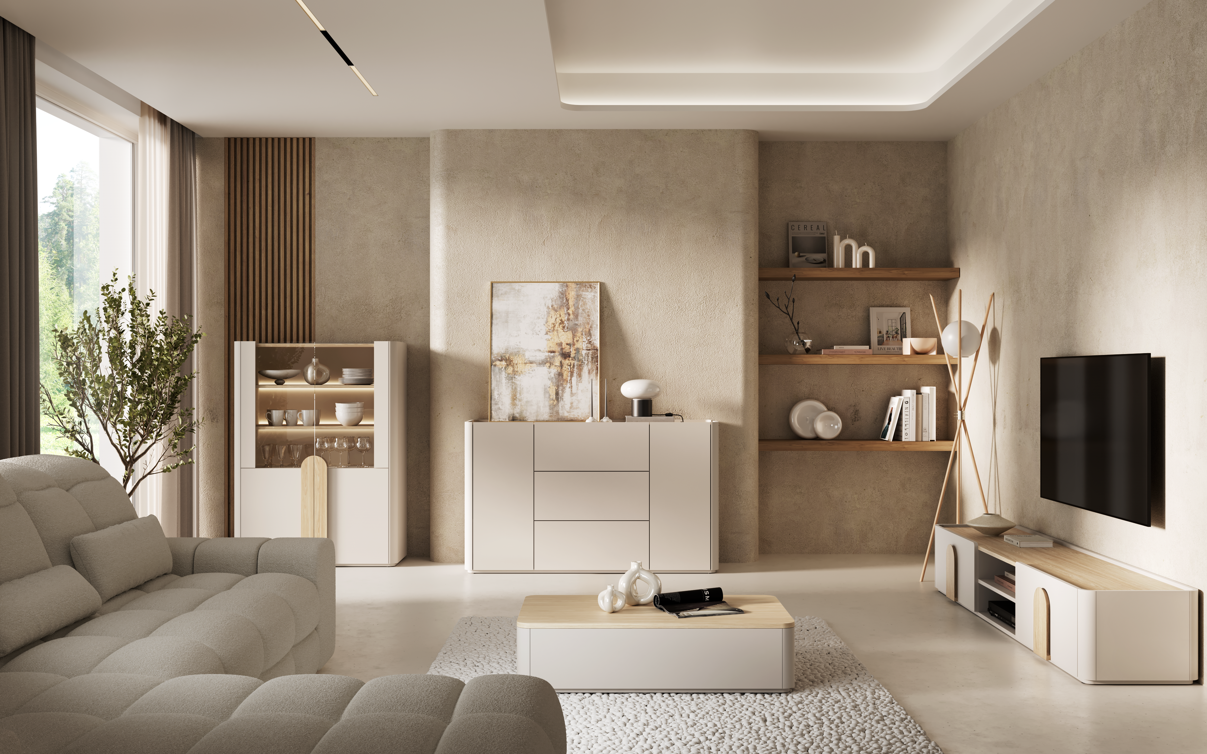 Jedinstvena linija dizajna omogućuje kombiniranje različitih elemenata – od niskih komoda i vitrina u dnevnom prostoru do garderobnih ormara i noćnih ormarića u spavaćoj sobi. Tako možete stvoriti cjelovit, estetski dovršen i funkcionalan interijer.