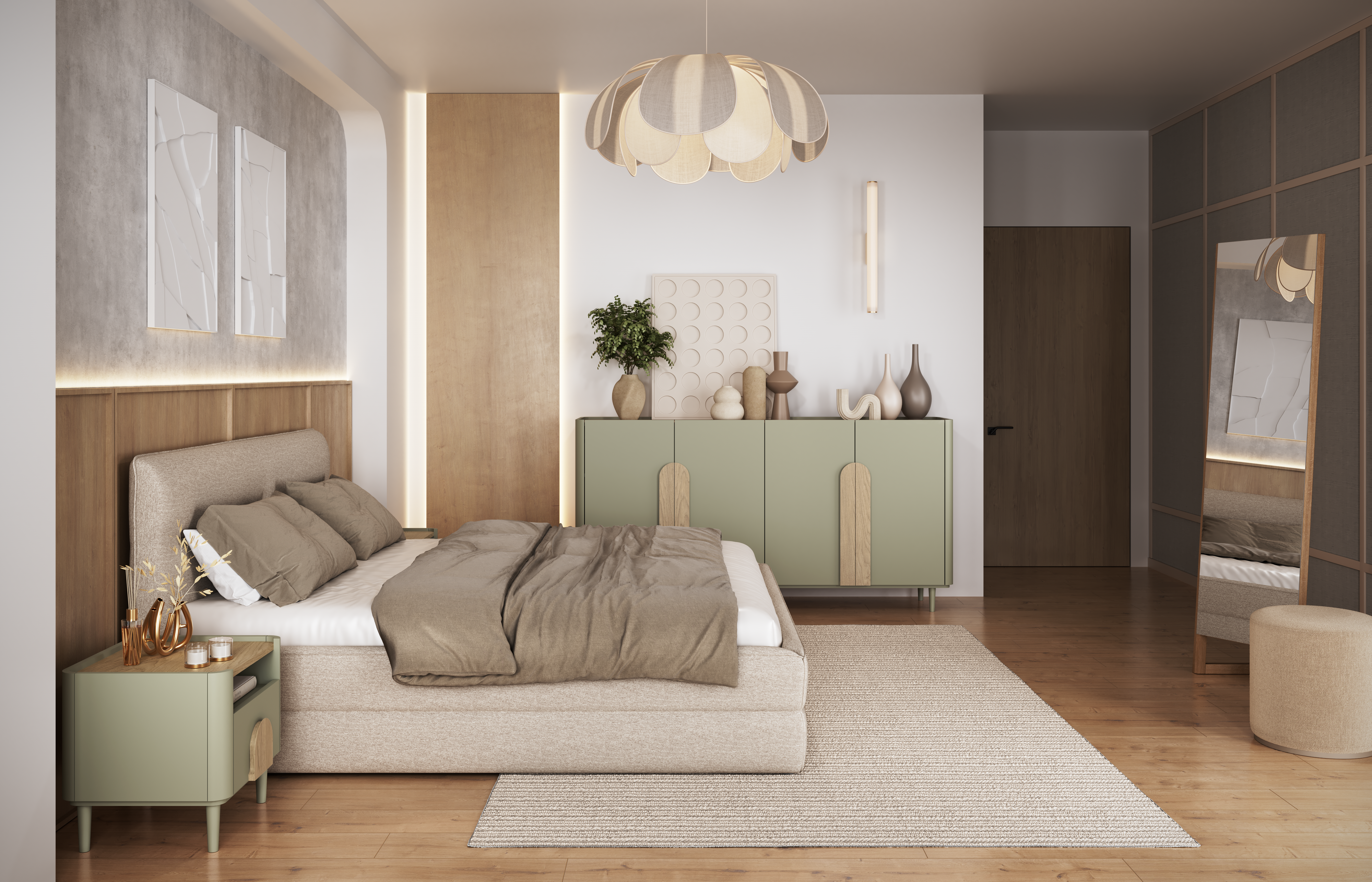 Vizualna prepoznatljivost kolekcije proizlazi iz kombinacije triju toplih, ali suvremenih tonova: eukaliptus kao osnovna boja, baltski dune hrast kao nježno kontrastna ploča i ručke od prirodnog hrasta kao završni detalj. Ta kombinacija stvara osjećaj prirodne ravnoteže, prikladan za svijetle ili neutralne interijere. Mekani prijelazi između nijansi doprinose ugodnom ambijentu koji se lako prilagođava i dnevnim i spavaćim prostorima.