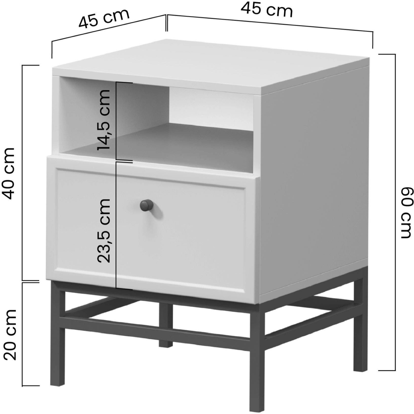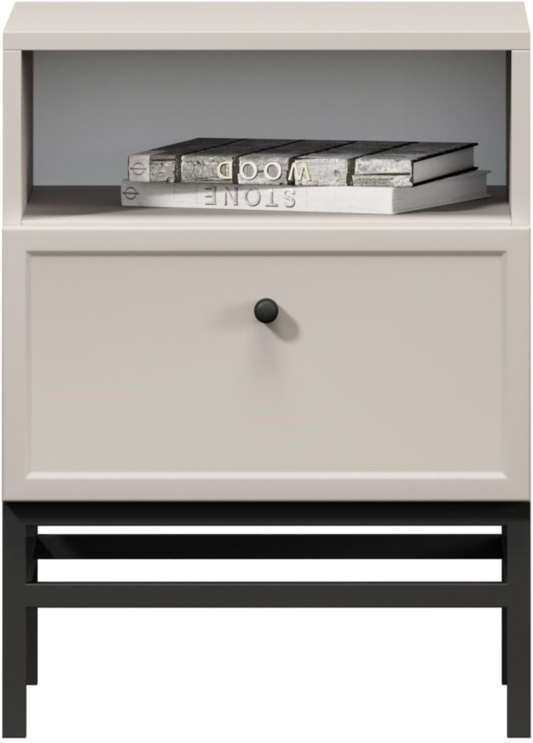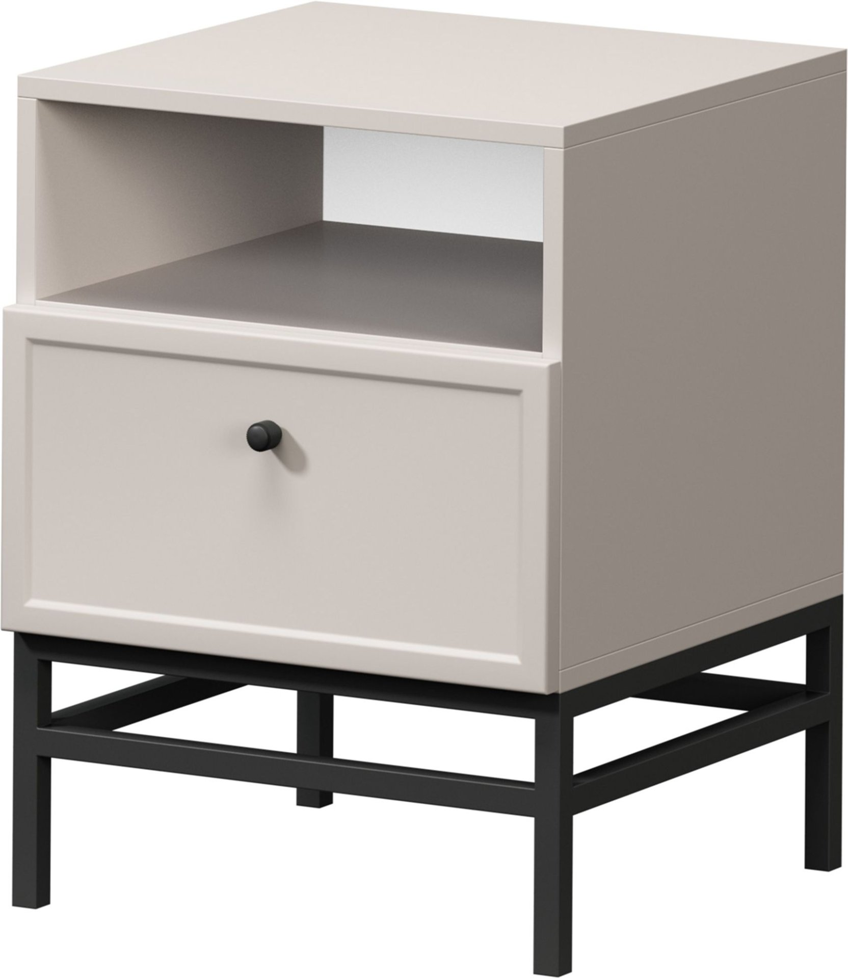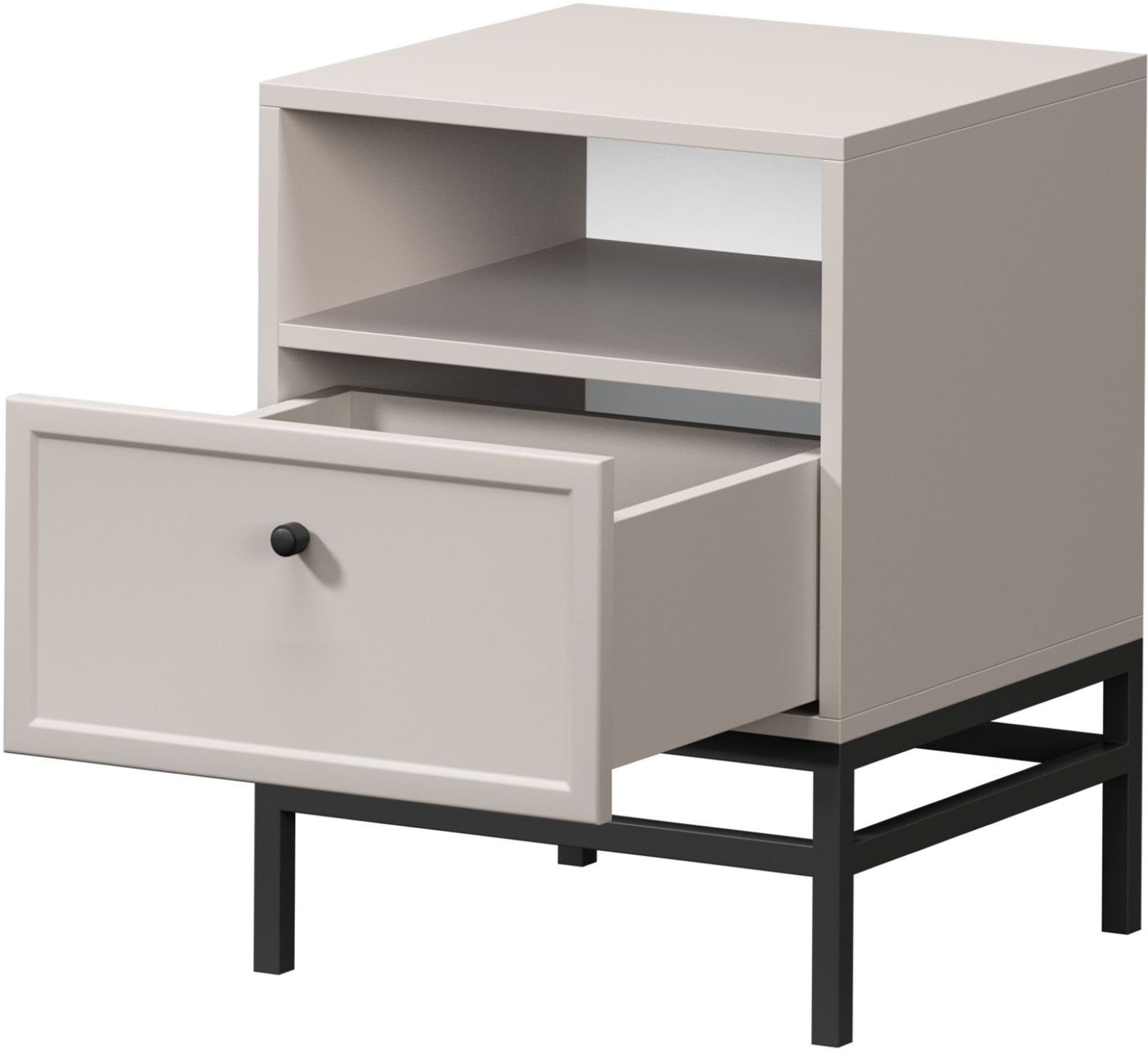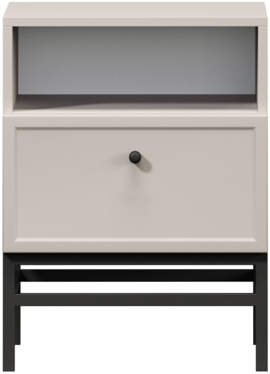 Noge ormarića izrađene su od metala i oblikovane u okvir koji naglašava moderan dizajn. Visina nogu iznosi 20 cm, što omogućuje jednostavno čišćenje prostora ispod namještaja i daje ormariću vizualnu lakoću. Crna boja nogu stvara kontrast s nježnom kašmir površinom i istodobno osigurava stabilnu potporu cijeloj konstrukciji.