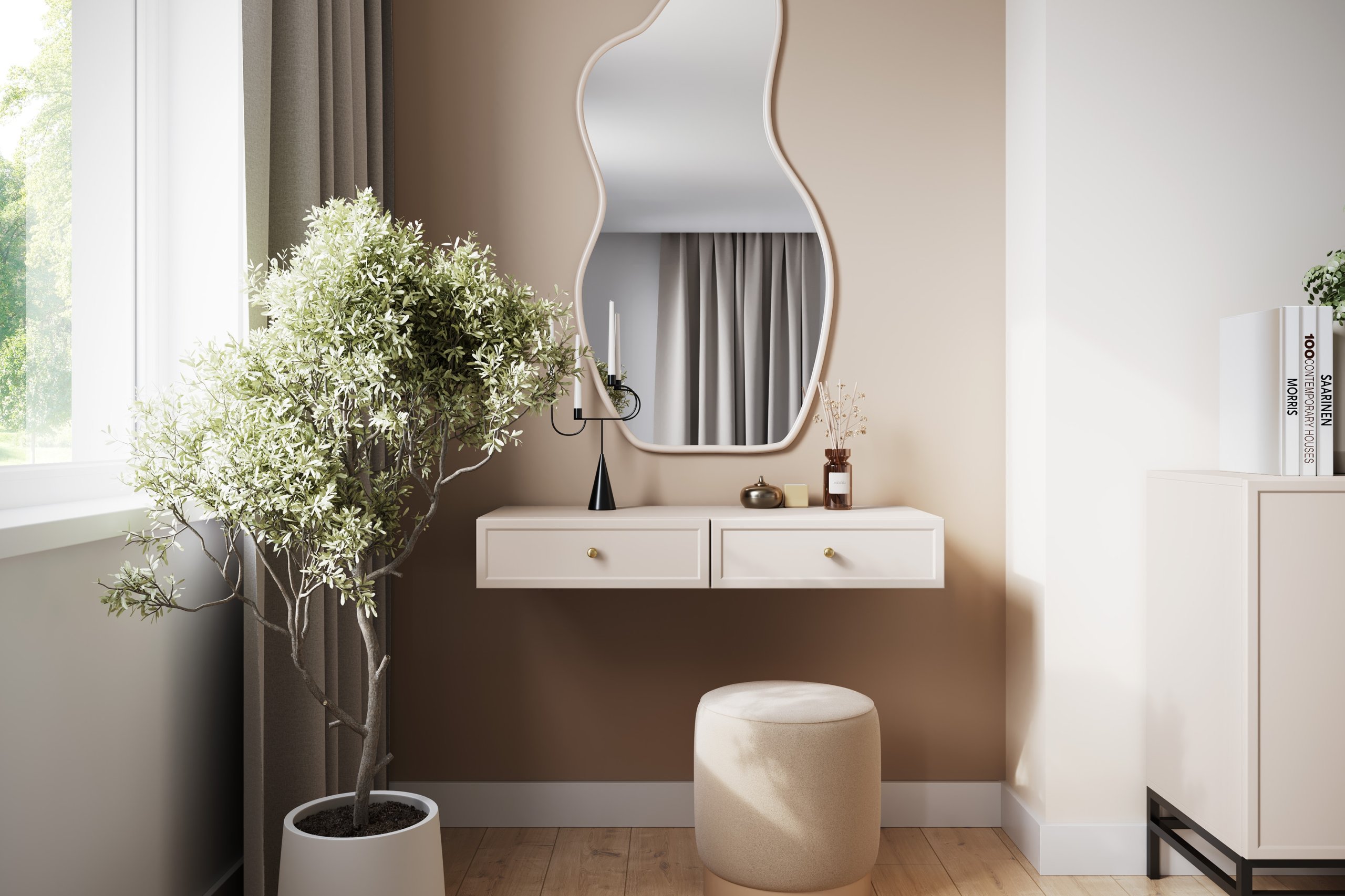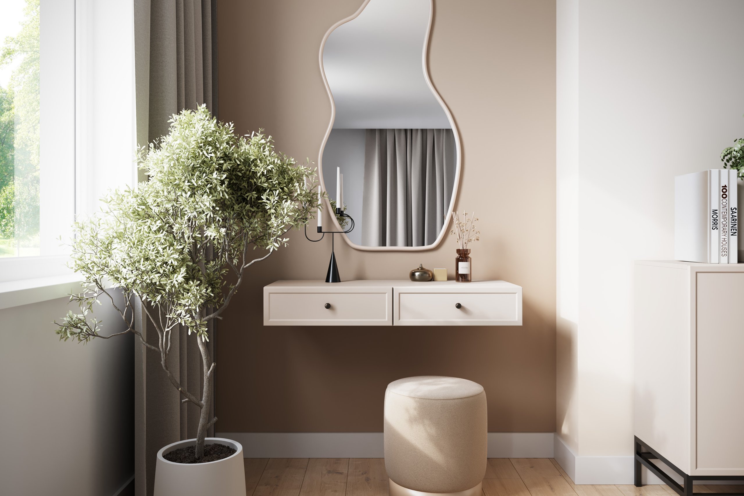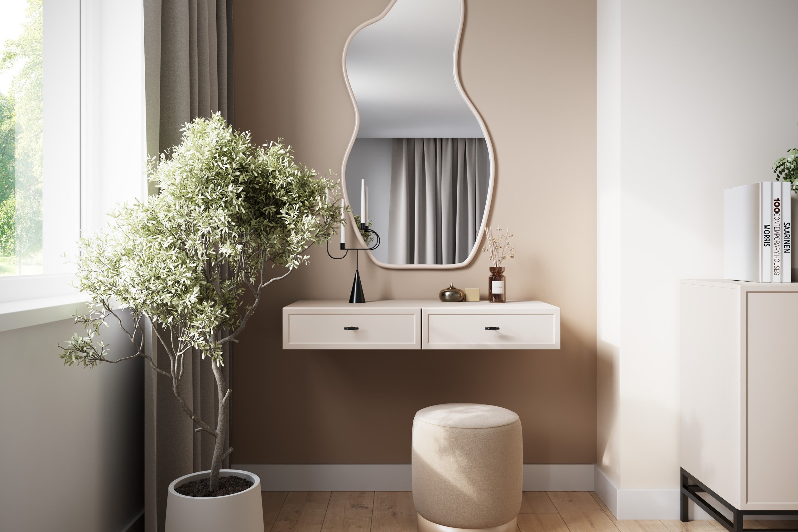 Zidni stol Lorini je svestran – djeluje kao toaletni stolić, ali se može koristiti i kao konzolna polica ili dodatna površina za odlaganje. Njegov jednostavan, ali profinjen oblik savršeno se uklapa u moderne, skandinavske i minimalističke interijere. Zbog male dubine pogodan je i za uske prostore, gdje je svaki centimetar dragocjen.