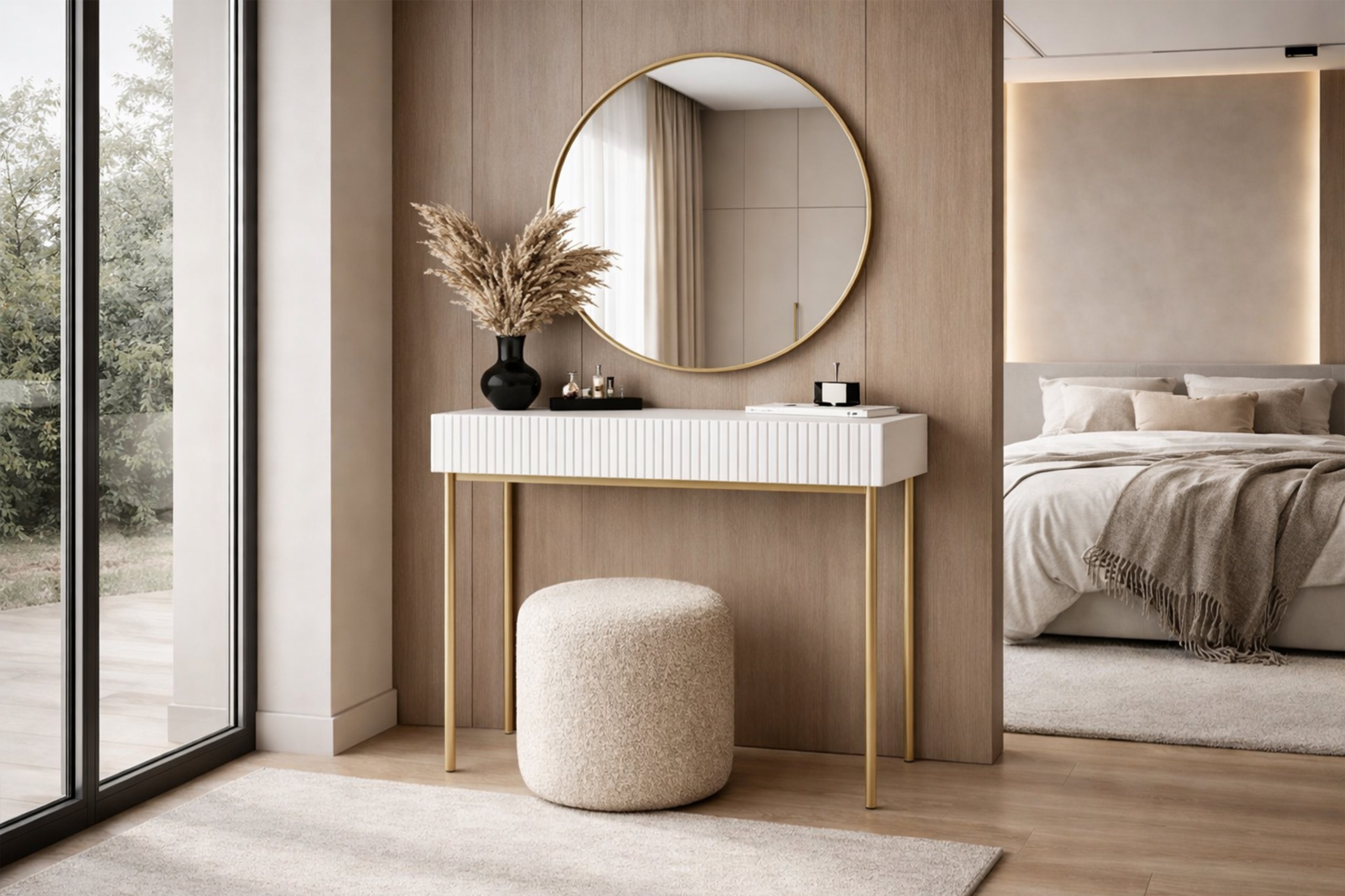 Toaletni stolić Nicole nudi dvije prostrane ladice koje se otvaraju na pritisak. Ovo rješenje omogućuje glatko i tiho otvaranje bez ručkica, čime se zadržava čist, moderan izgled. Vodilice su postavljene na donjoj strani i uključuju sustav mekog zatvaranja, pa se ladice zatvaraju nježno i bez trzaja. Unutrašnjost ladica dovoljno je duboka za pohranu kozmetike, nakita ili manjih dodataka.