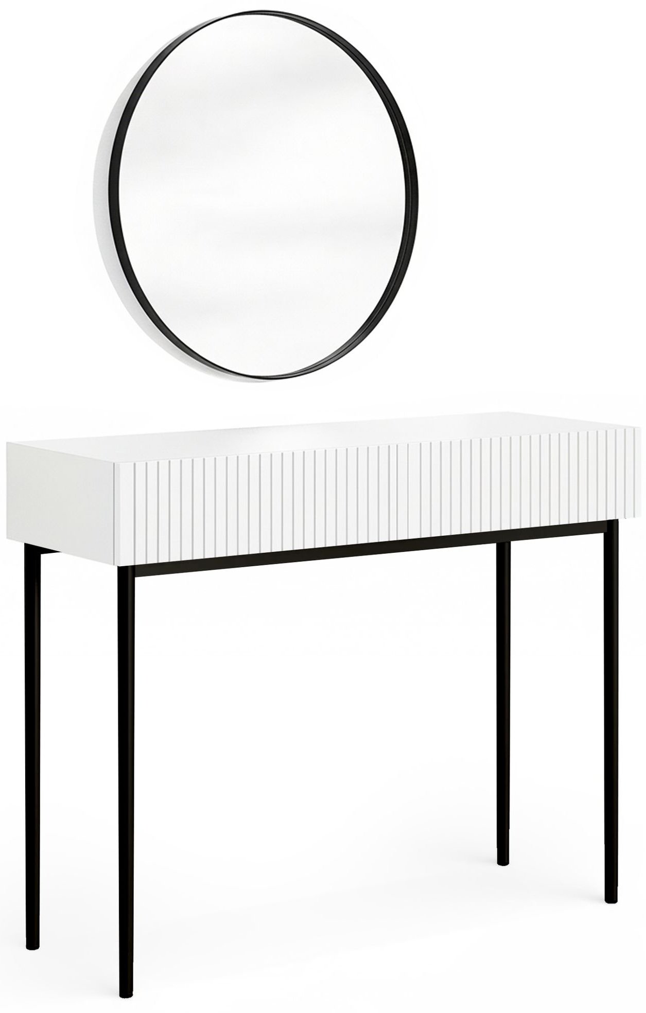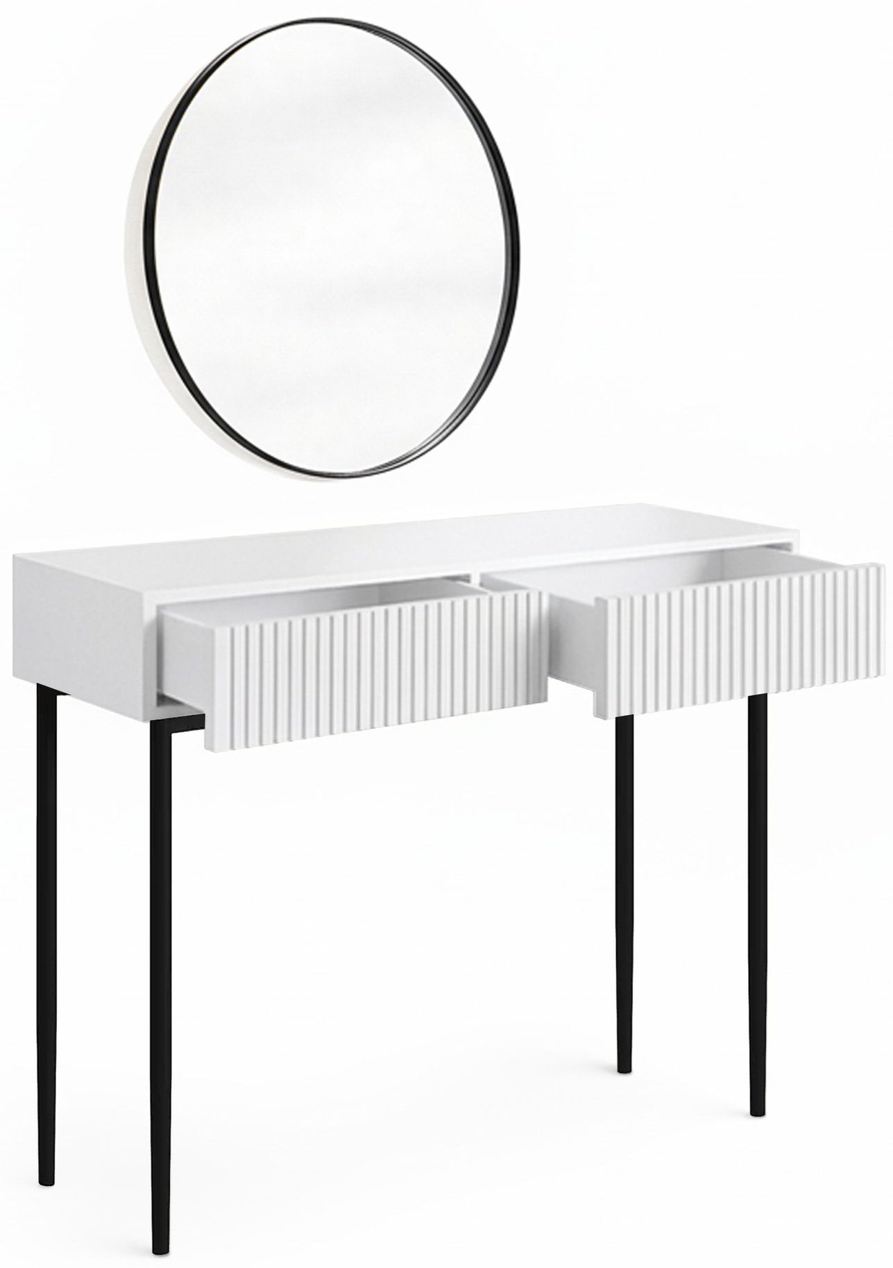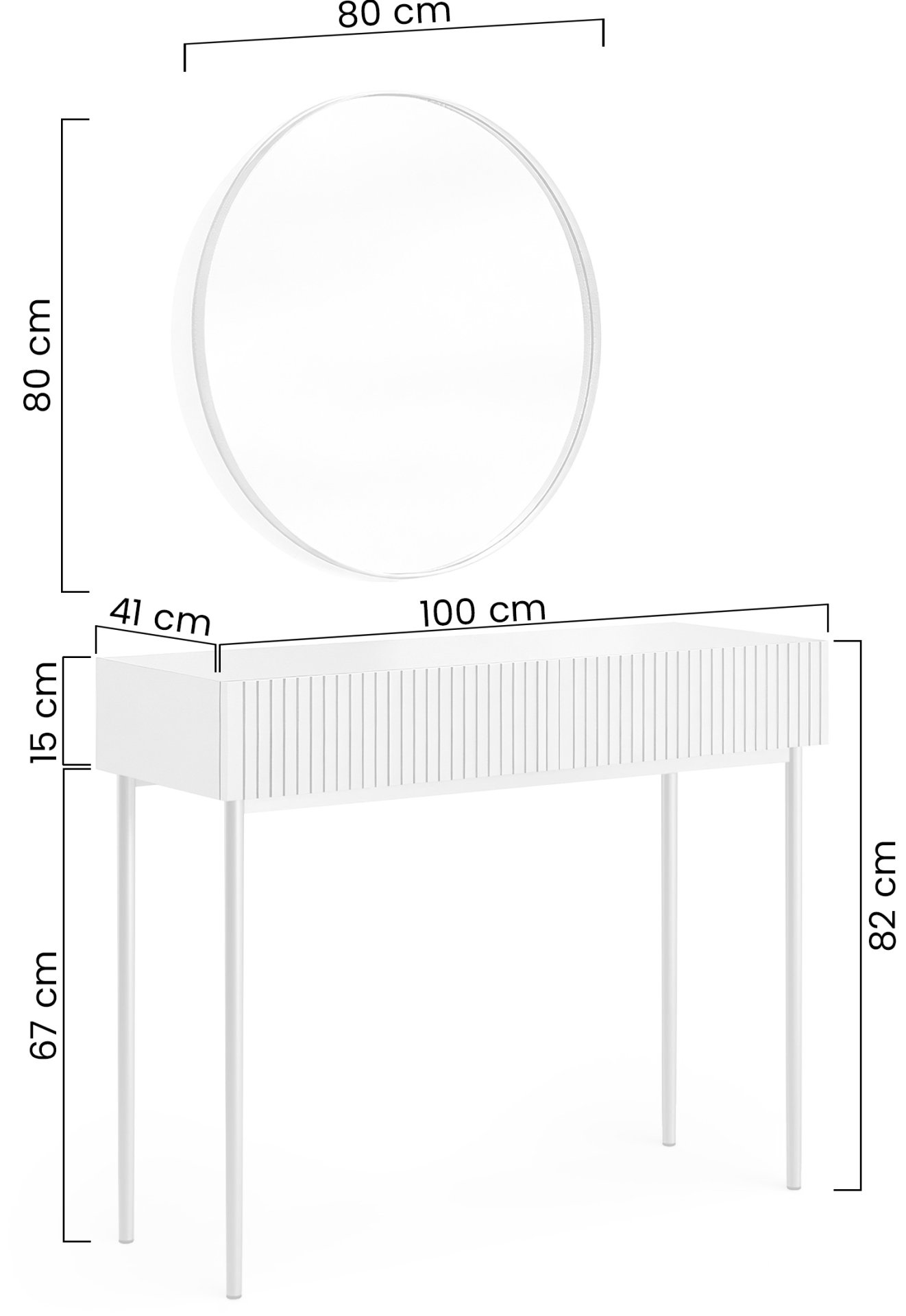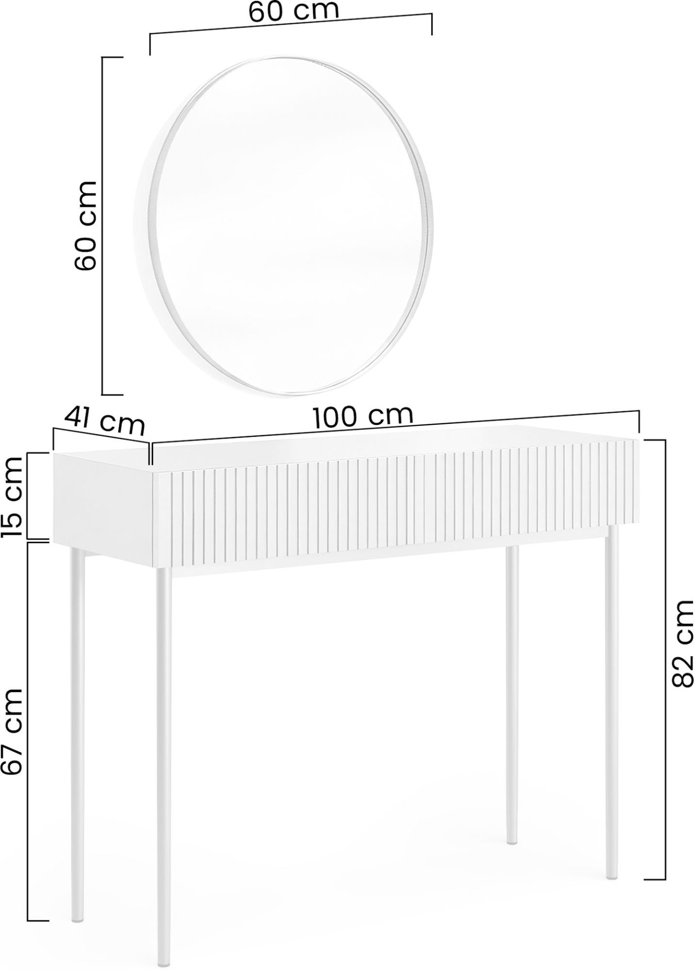 Priloženo ogledalo mjeri 80x80x4 cm i svojom jednostavnom formom savršeno se uklapa u linije stolića. Može se postaviti neposredno iznad ploče ili po želji koristiti s lančićem za viseće postavljanje, pri čemu ukupna visina iznosi 82 cm. Takav raspored omogućuje udobno korištenje pri svakodnevnom šminkanju i njezi lica.