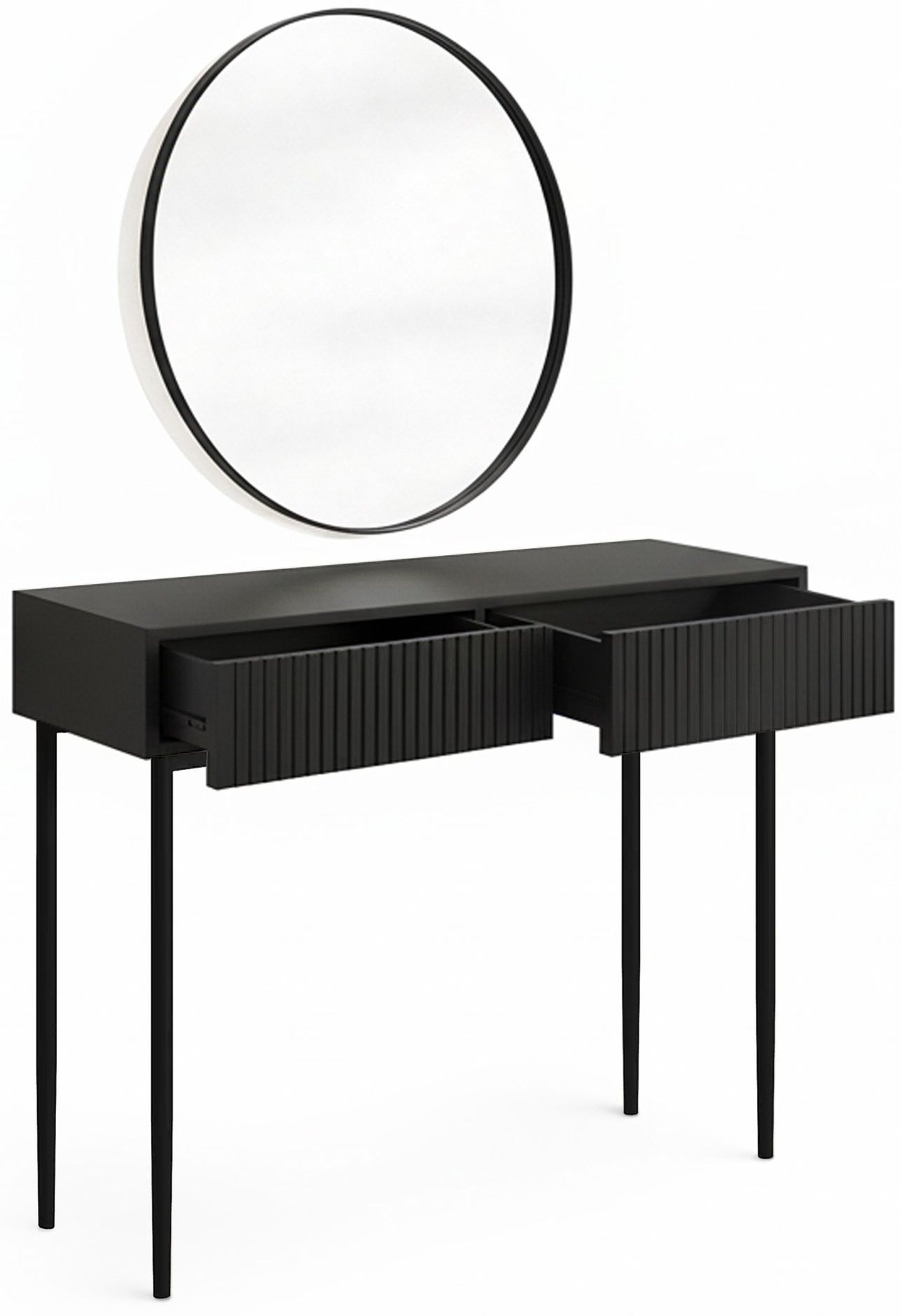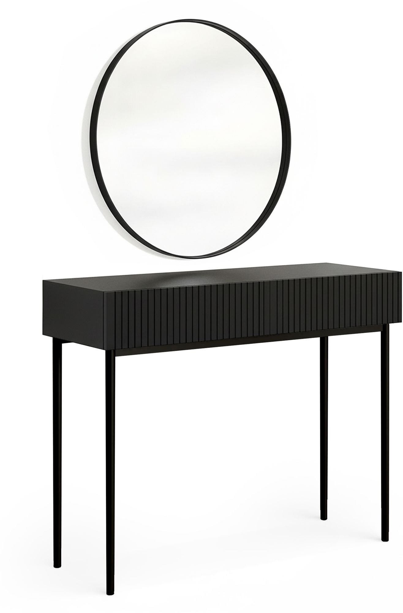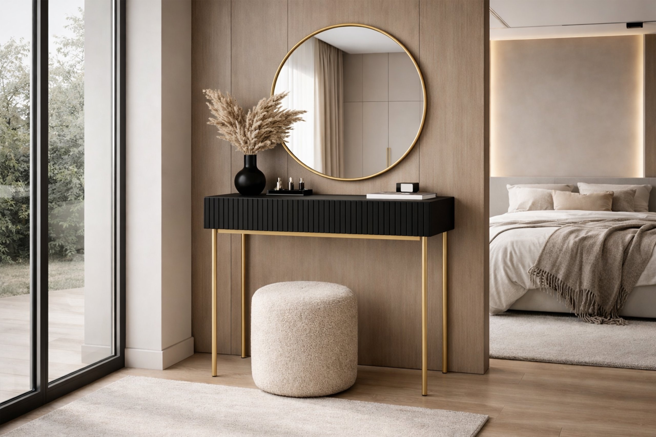 Stolić Nicole dizajniran je za korisnike koji cijene moderno oblikovanje, ali ne žele žrtvovati praktičnost. Mat crna površina elegantna je i jednostavna za održavanje, a rebrasta tekstura stvara zanimljivu igru svjetla i sjene. Mogućnost izbora između crnih ili zlatnih nogu omogućuje prilagodbu ambijentu – crna varijanta unosi minimalističku eleganciju, a zlatna toplinu i dašak glamura. Zbog uravnoteženih proporcija, stol se lijepo uklapa s ostalim komadima namještaja u spavaćoj sobi ili garderobi.
