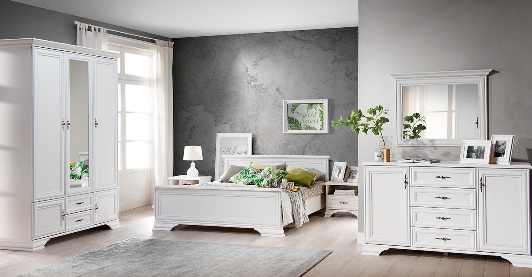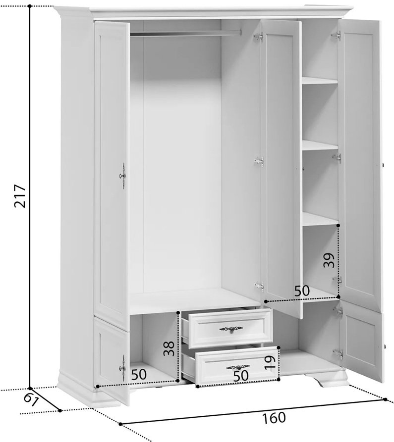 Prostrani ormar u gornjem dijelu sadrži prostor za vješanje odjeće i police za odlaganje odjeće. U donjem dijelu ormara se nalaze 2 ladice s vratima i 2 ladice s metalnim vodilicama.