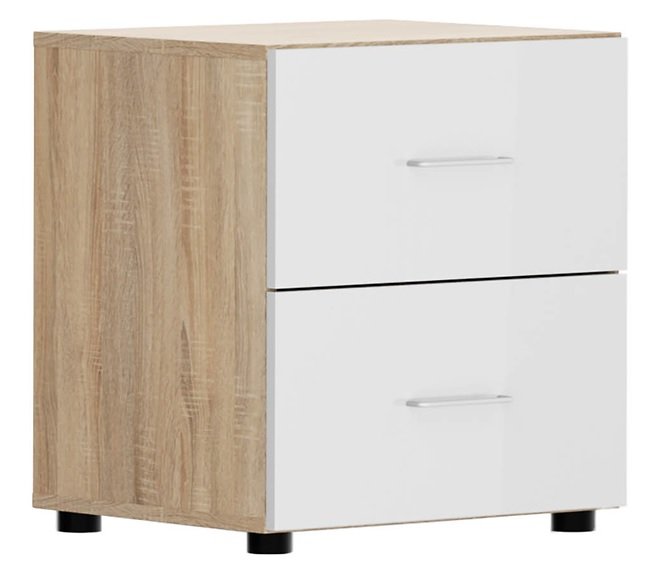 Noćni ormarić Modeo u imitaciji sonoma hrasta predstavlja investiciju u vječnu ljepotu. Ova nijansa hrasta ne zastarijeva, ostaje relevantna kroz vrijeme i zadržava svoju estetsku privlačnost. Visoki bijeli sjaj unosi prozračnost u interijer.