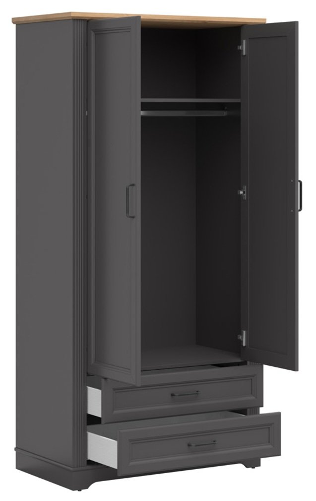 S dimenzijama 100x42x200 cm ormar se idealno uklapa u spavaću sobu, garderobu, predsoblje ili čak sobu za mlade. Njegova visina omogućuje jednostavno spremanje duže odjeće, poput kaputa i haljina, dok praktična širina osigurava da ormar ne zauzima previše prostora. Unutrašnjost je osmišljena tako da pruža preglednost i red – vješalica omogućuje pohranu viseće odjeće, a dvije prostrane ladice savršene su za rublje, dodatke ili manje predmete koje želite uvijek imati pri ruci.