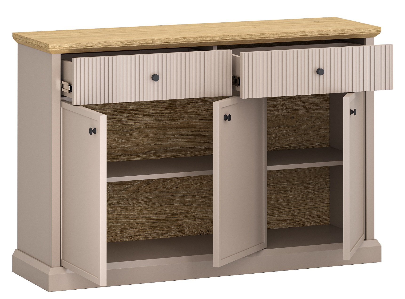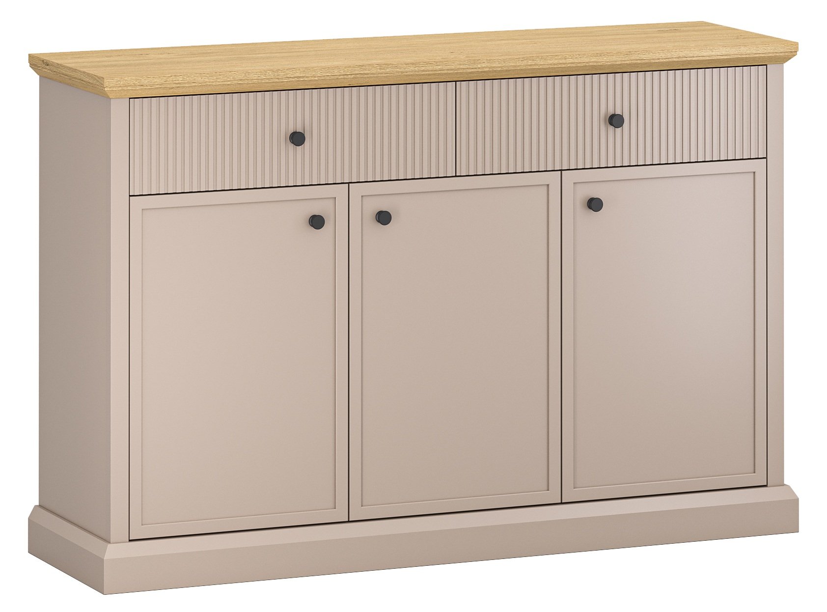 Vizualna jednostavnost komode Idello 3d2s omogućuje korisniku da je kombinira s različitim vrstama dekora. Boja taupe djeluje neutralno i umirujuće, pa se lijepo slaže s bijelim, sivim ili drvenim tonovima u prostoru. Dekor kamenog hrasta na gornjoj ploči daje osjećaj topline i prirodnosti. Takva kombinacija idealna je za stvaranje ugodne i domaće atmosfere bez nepotrebnog vizualnog opterećenja.