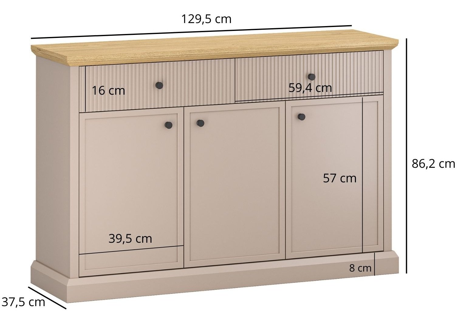 Korpus komode izrađen je od laminirane iverice debljine 16 mm, što osigurava dobru stabilnost i jednostavno održavanje. Gornja ploča dodatno je ojačana i doseže debljinu od 38 mm, što joj daje čvrstoću i vizualno snažniji dojam. Površina u nijansi taupe upotpunjena je gornjom pločom u dekoru kamenog hrasta, koja dodaje prirodan kontrast i toplinu. Kombinacija ove dvije boje stvara uravnotežen izgled koji se lijepo slaže s neutralnim zidovima ili metalnim dodacima u prostoru.