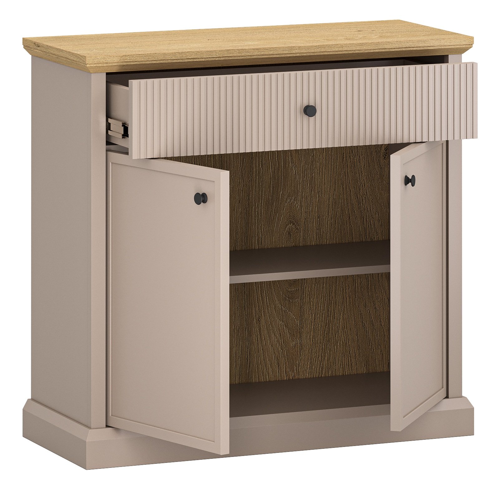 Komoda ima dvoja vrata i jednu ladicu, što omogućuje praktično pohranjivanje različitih predmeta. Iza vrata skriva se prostrani unutarnji dio, pogodan za pohranu tekstila, posuđa ili dokumenata, dok je ladica idealna za manje komade ili svakodnevne potrepštine. Ukupna struktura namještaja oblikovana je tako da osigurava stabilnost i jednostavan pristup sadržaju.