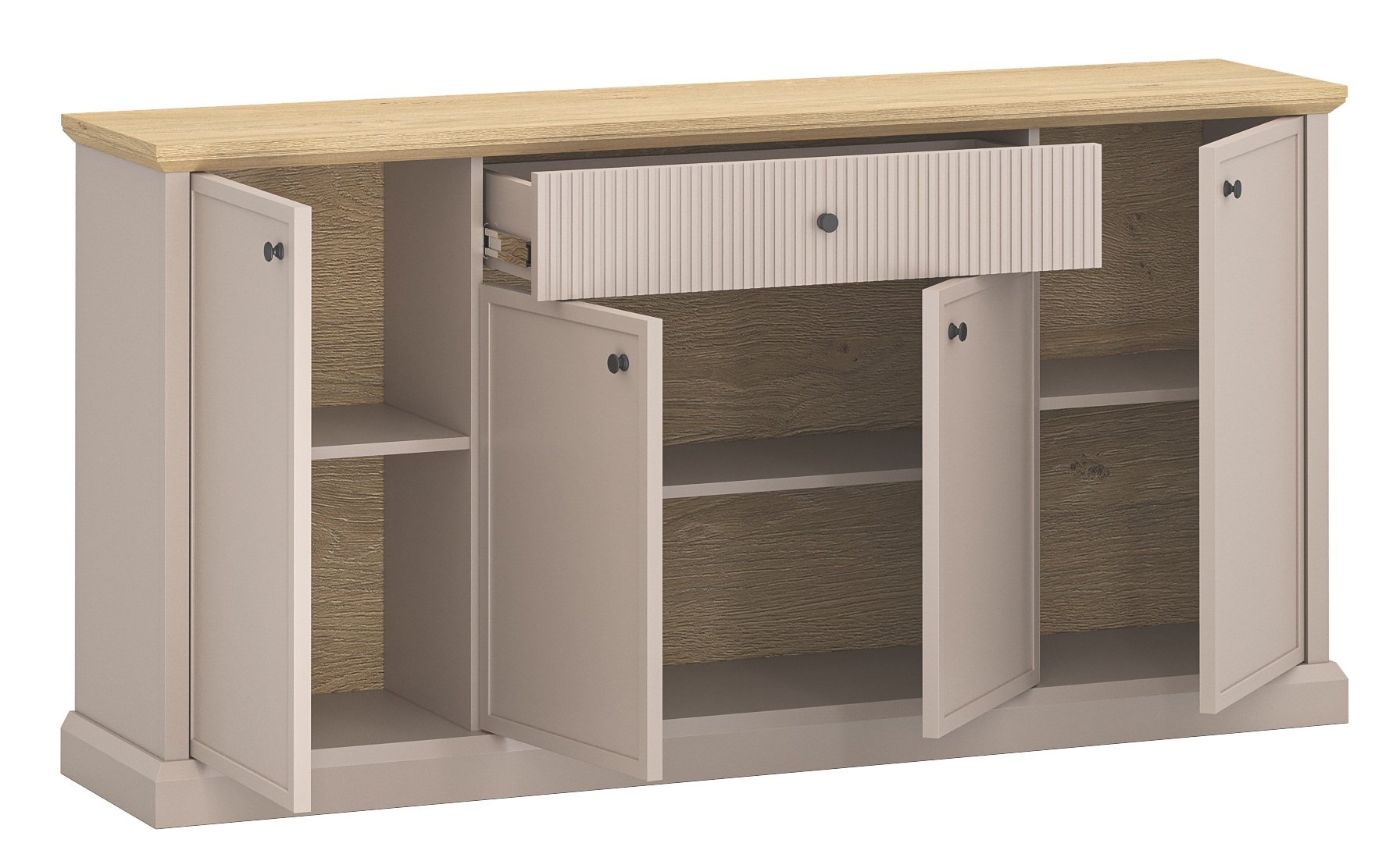 Komoda Idello 4d1s nudi optimalan raspored prostora. Četiri vrata skrivaju prostrane police, pogodne za pohranu većih predmeta poput posuđa, tekstila ili knjiga. Jedna ladica idealna je za manje predmete koje želite imati pri ruci – od dokumenata do osobnih dodataka. Takav dizajn omogućuje preglednost i organiziranost, što je ključno za ugodan životni prostor.
