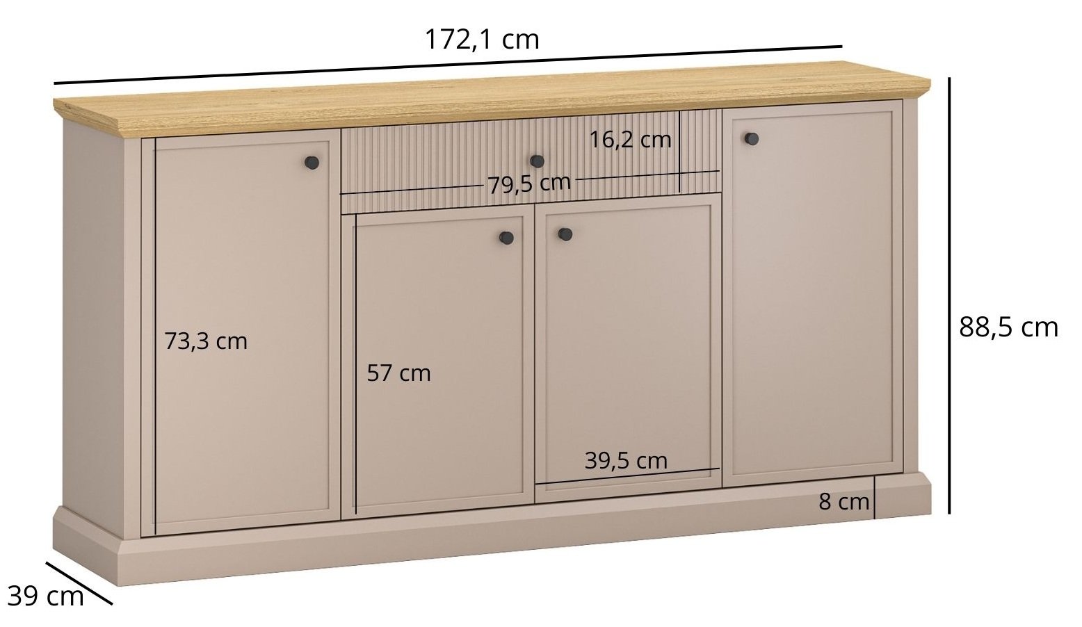 Kompaktna širina omogućuje da komodu postavite kako u prostrane dnevne sobe, tako i u uže hodnike ili spavaće sobe. Visina od 88,5 cm osigurava udobno korištenje gornje površine, koja može poslužiti za dekoraciju, svjetiljku ili pohranu svakodnevnih predmeta.