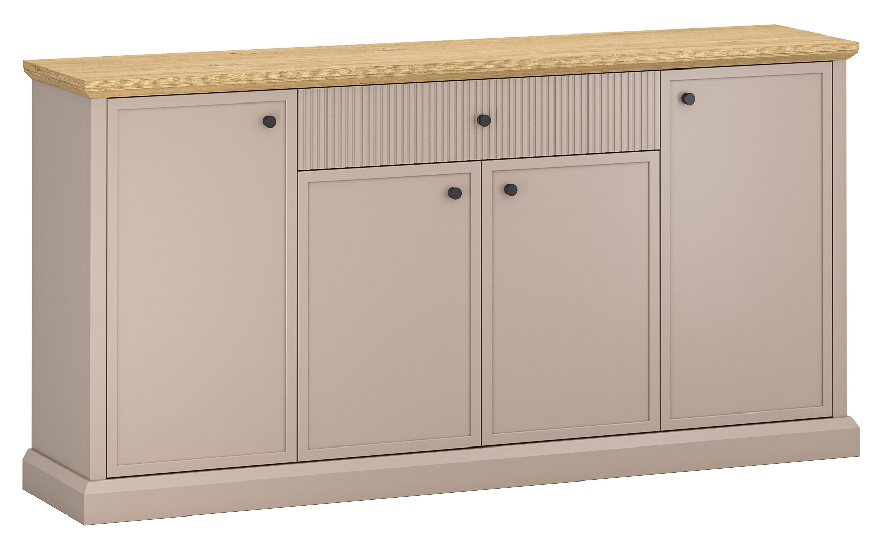 Komoda Idello 4d1s – Black Red White spaja moderan izgled, funkcionalnost i kvalitetnu izradu koju osigurava priznati poljski proizvođač Black Red White. Dizajnirana je za one koji cijene uredan prostor i estetski dotjeran namještaj. Komoda u kombinaciji boja taupe i hrasta kamnitog stvara ugodnu toplinu koja se lako uklapa u različite stilove unutarnjeg uređenja – od modernog do klasičnog. Njezina prostrana unutrašnjost omogućuje pohranu različitih predmeta, od odjeće do dokumenata, pritom zadržavajući elegantan izgled prostora.