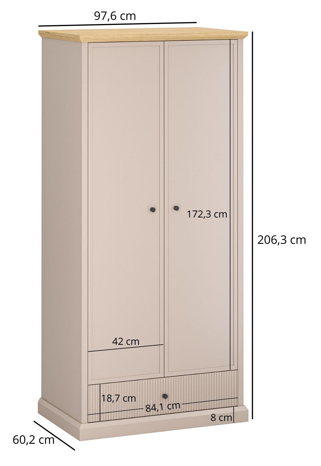 Ormar ima dvoja klasična zakretna vrata i jednu prostranu ladicu u donjem dijelu, što omogućuje učinkovitu raspodjelu odjeće, rublja ili dodataka. Izrađen je od laminirane iverice debljine 16 i 38 mm, što osigurava stabilnu konstrukciju i dobru otpornost na habanje. Metalni elementi – ručke i vodilice – upotpunjuju cjelinu te omogućuju glatko otvaranje i zatvaranje vrata i ladice. Površina u boji taupe lijepo se slaže s dekorom hrasta kamena, što naglašava prirodni karakter namještaja.