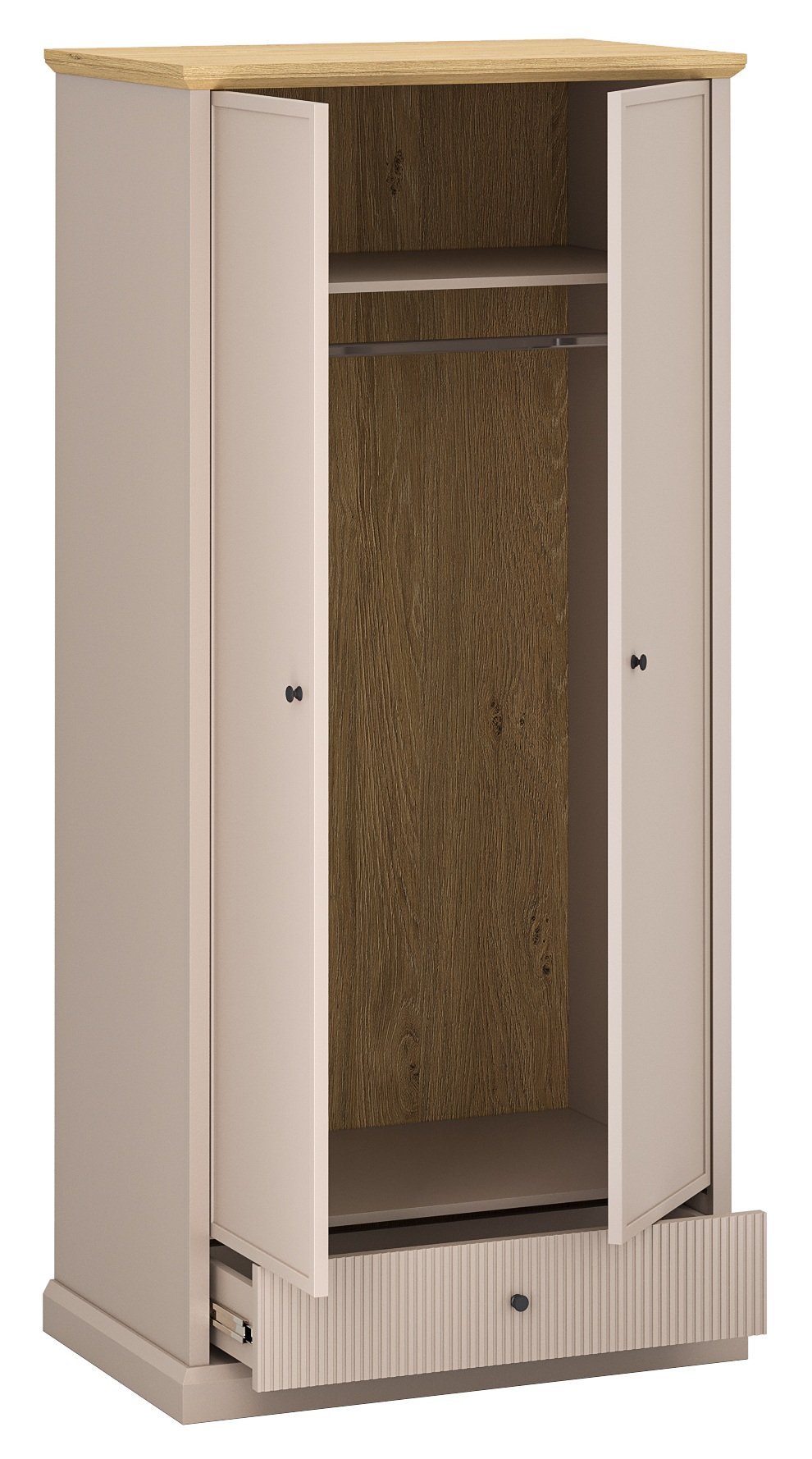 Dvokrilni dizajn skriva prostranu unutrašnjost, koja uključuje dio za vješanje odjeće te dodatne police za složene komade. Donja ladica praktična je za pohranu manjih predmeta, poput dodataka, posteljine ili sezonskog tekstila. Zahvaljujući preglednom dizajnu, sadržaj ormara uvijek je dostupan i uredan, što olakšava svakodnevnu upotrebu.