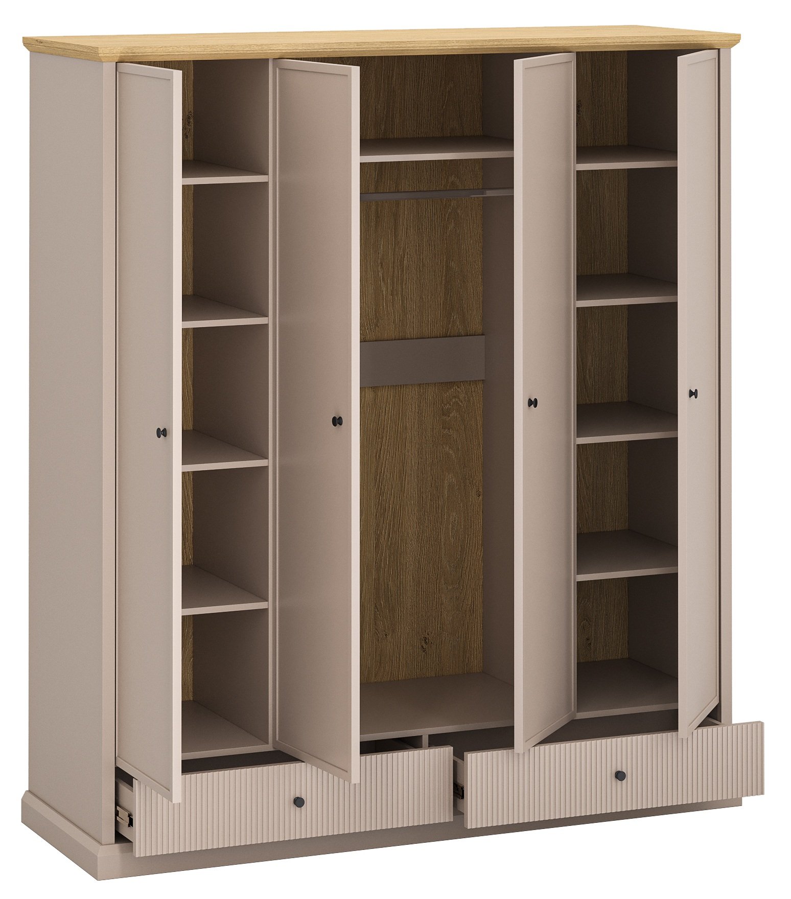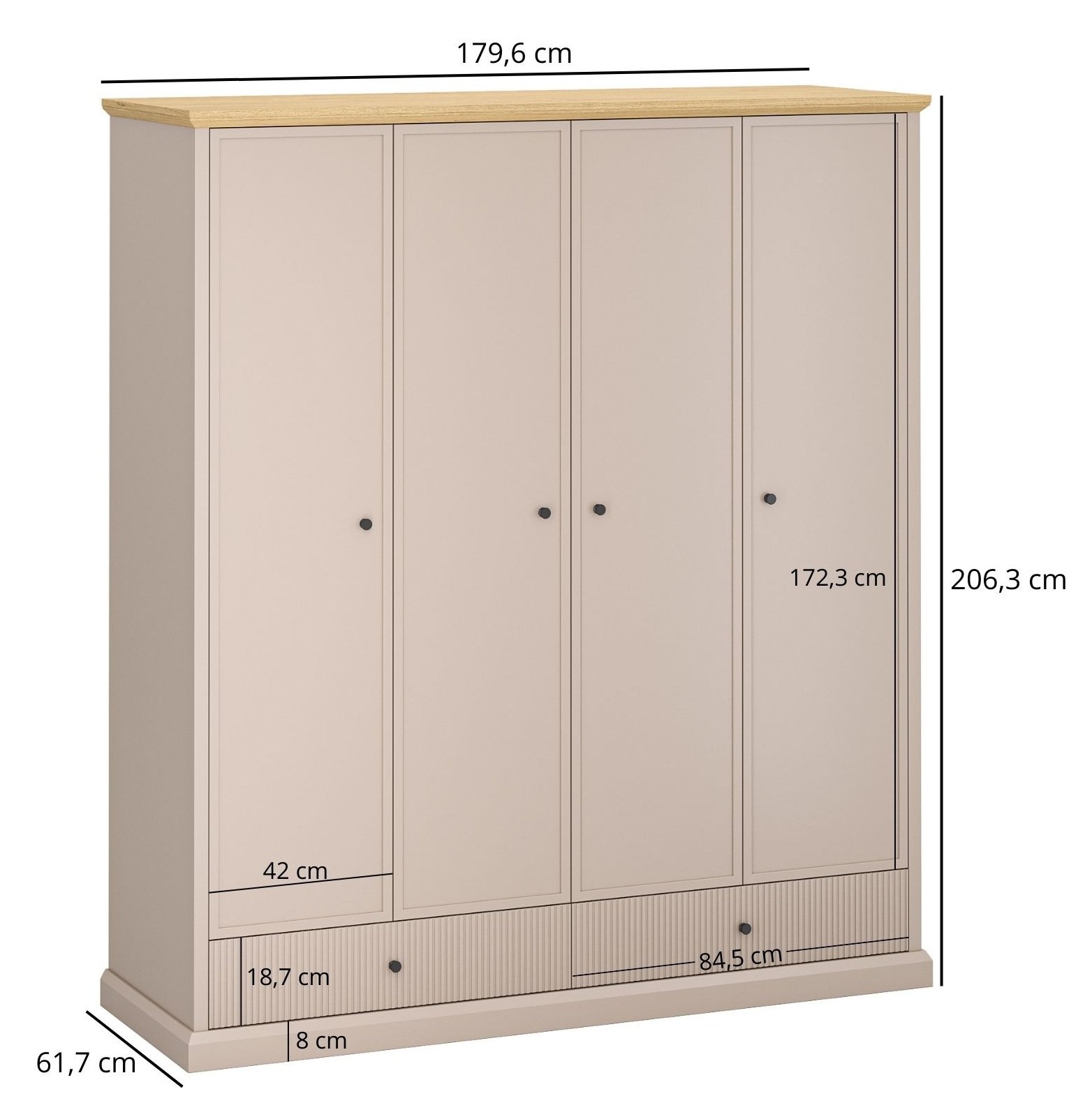 Ormar s ukupnim dimenzijama 180 × 62 × 206 cm nudi dovoljno prostora za pohranu različite odjeće, dodataka i tekstila. Konstrukciju čine četvera vrata i dvije ladice, što omogućuje pregledno raspoređivanje sadržaja. Unutrašnjost je podijeljena tako da korisnik može kombinirati vješanje dužih komada odjeće, slaganje pulovera i pohranu manjih predmeta u ladicama. Metalne ručke i vodilice dodatno pridonose izdržljivosti i udobnoj uporabi, jer omogućuju glatko otvaranje i zatvaranje bez zapinjanja.