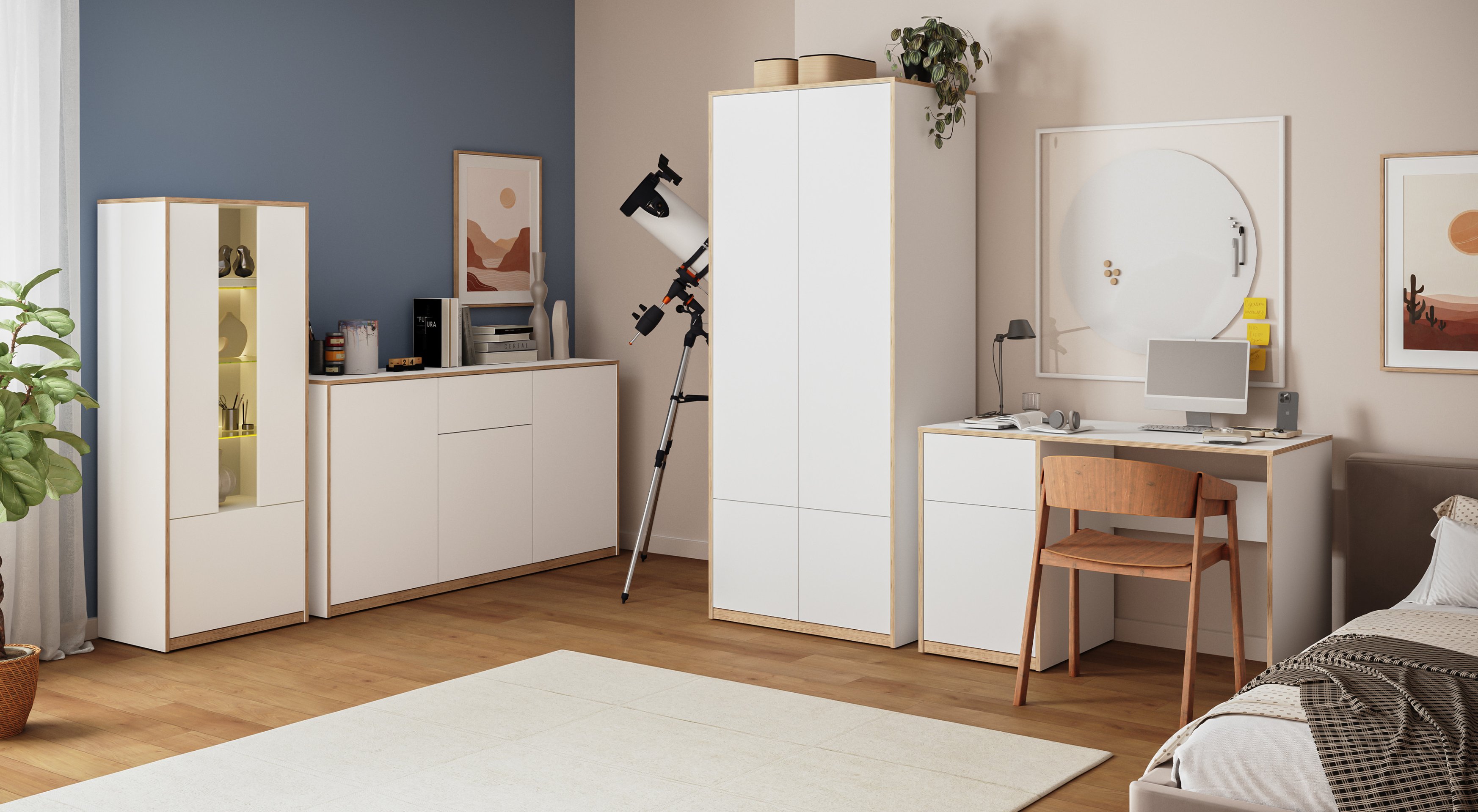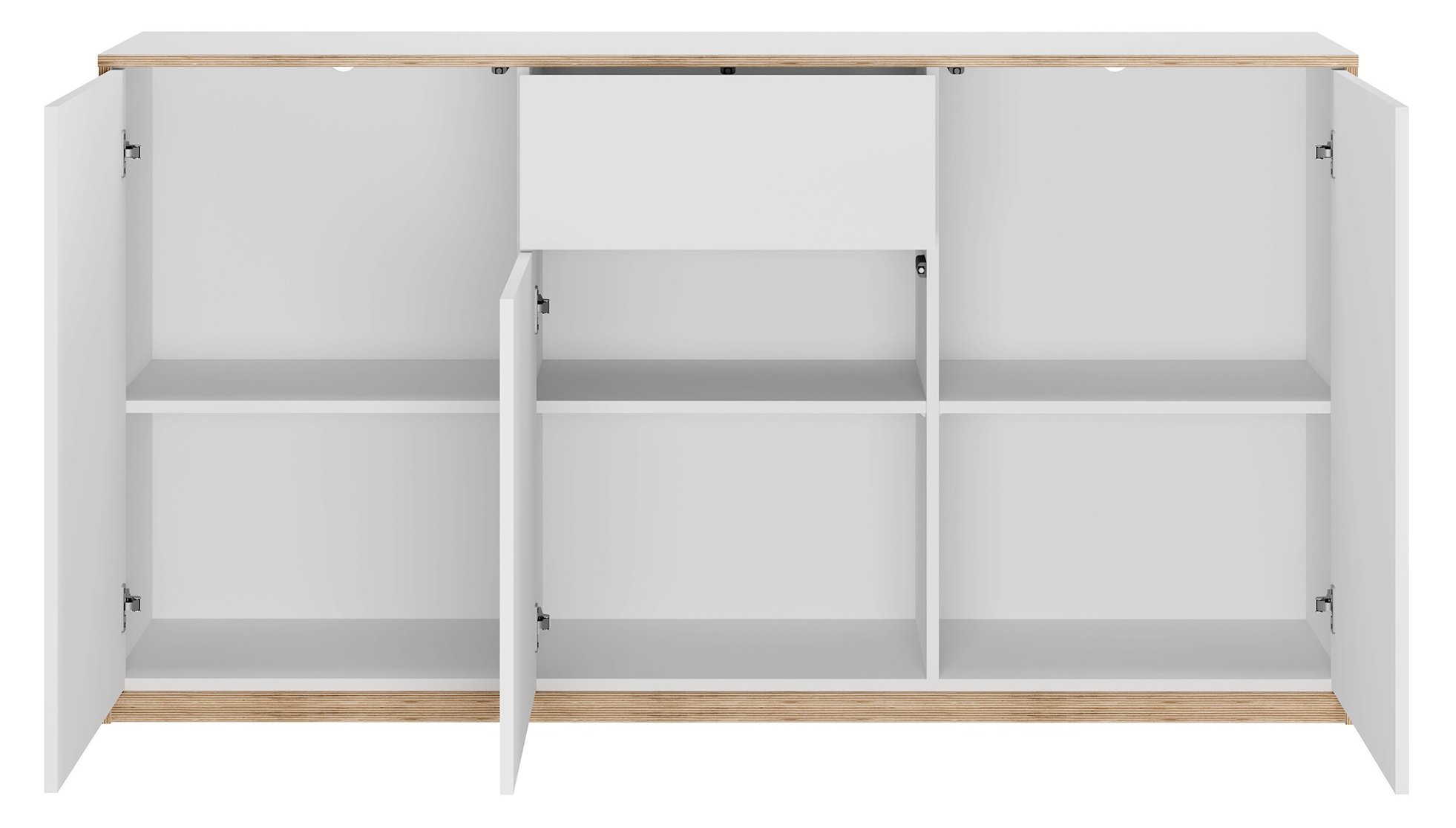 Komoda Complex 3d1s ima promišljen unutarnji raspored koji omogućuje pohranu različitih predmeta. Iza troja vrata skriva se prostrani odjeljak s policama, gdje ima dovoljno mjesta za dokumente, posuđe, tekstil ili druge osobne stvari. Jedna ladica nudi praktičan prostor za manje predmete koje želite imati uvijek pri ruci. Ova kombinacija vrata i ladice pridonosi preglednosti i urednosti prostora.