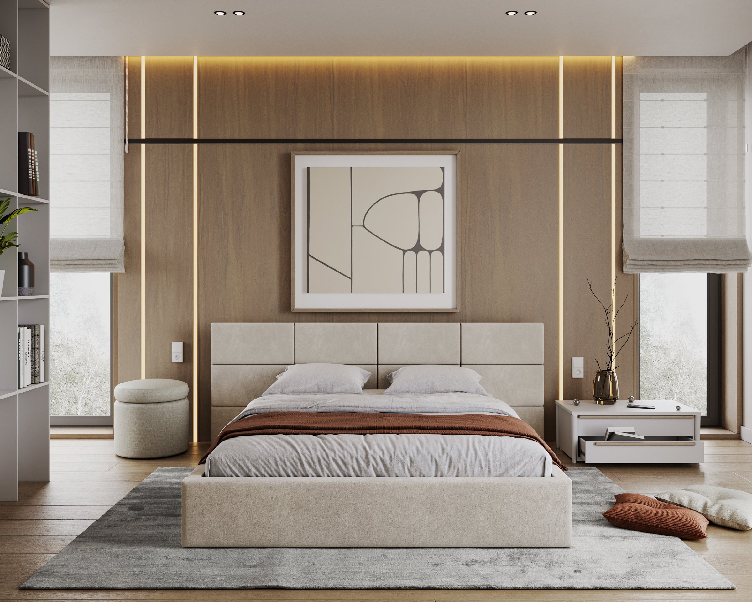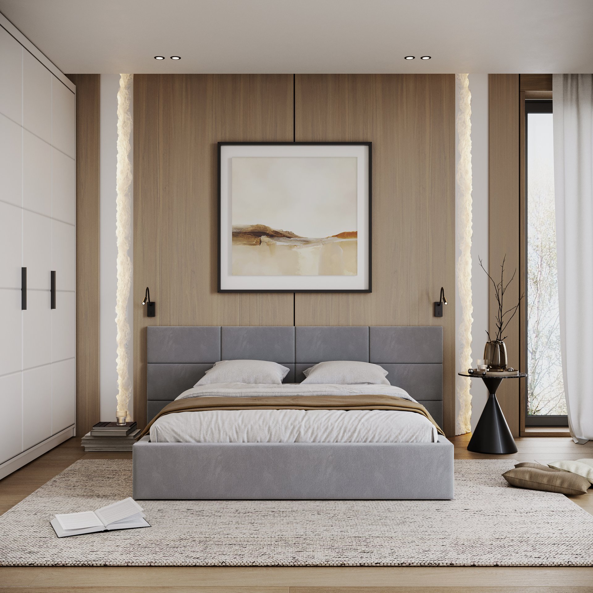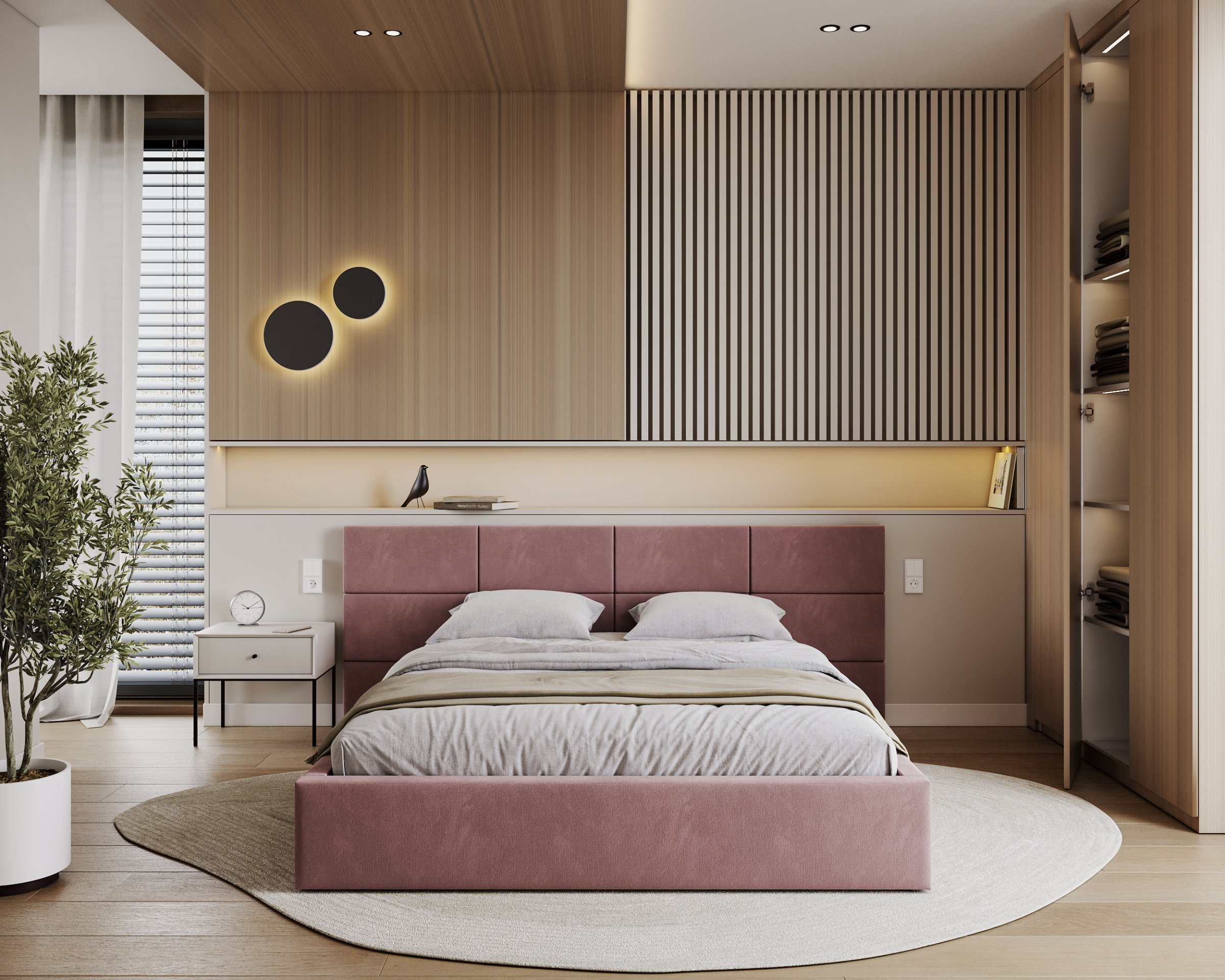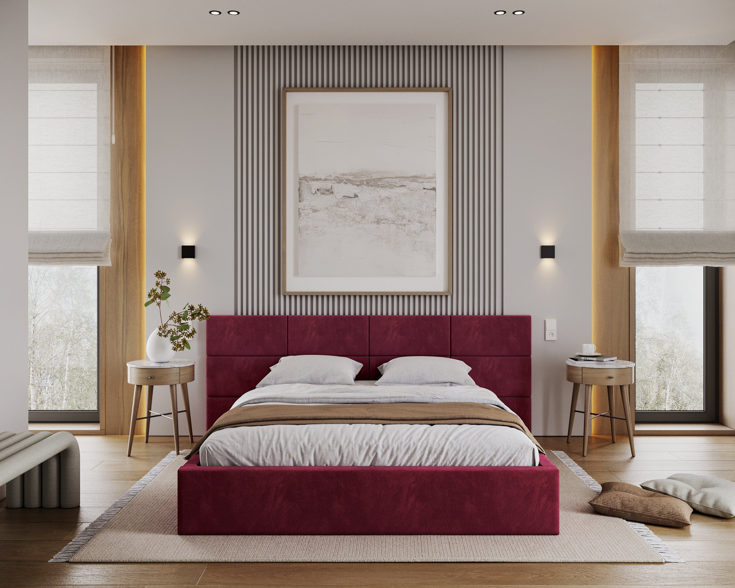 Posebna pažnja posvećena je uzglavlju, koje se sastoji od pojedinačnih kvadratnih jastučića namijenjenih montaži na zid. Takav dizajn omogućuje prilagodbu visine i razmaka, čime se ne samo poboljšava udobnost pri čitanju ili gledanju televizije, već i estetski obogaćuje prostor spavaće sobe. Vodoravno prošiveni elementi i meko tapeciranje stvaraju ugodan osjećaj topline i domaće atmosfere, bez obzira na odabranu boju tkanine.