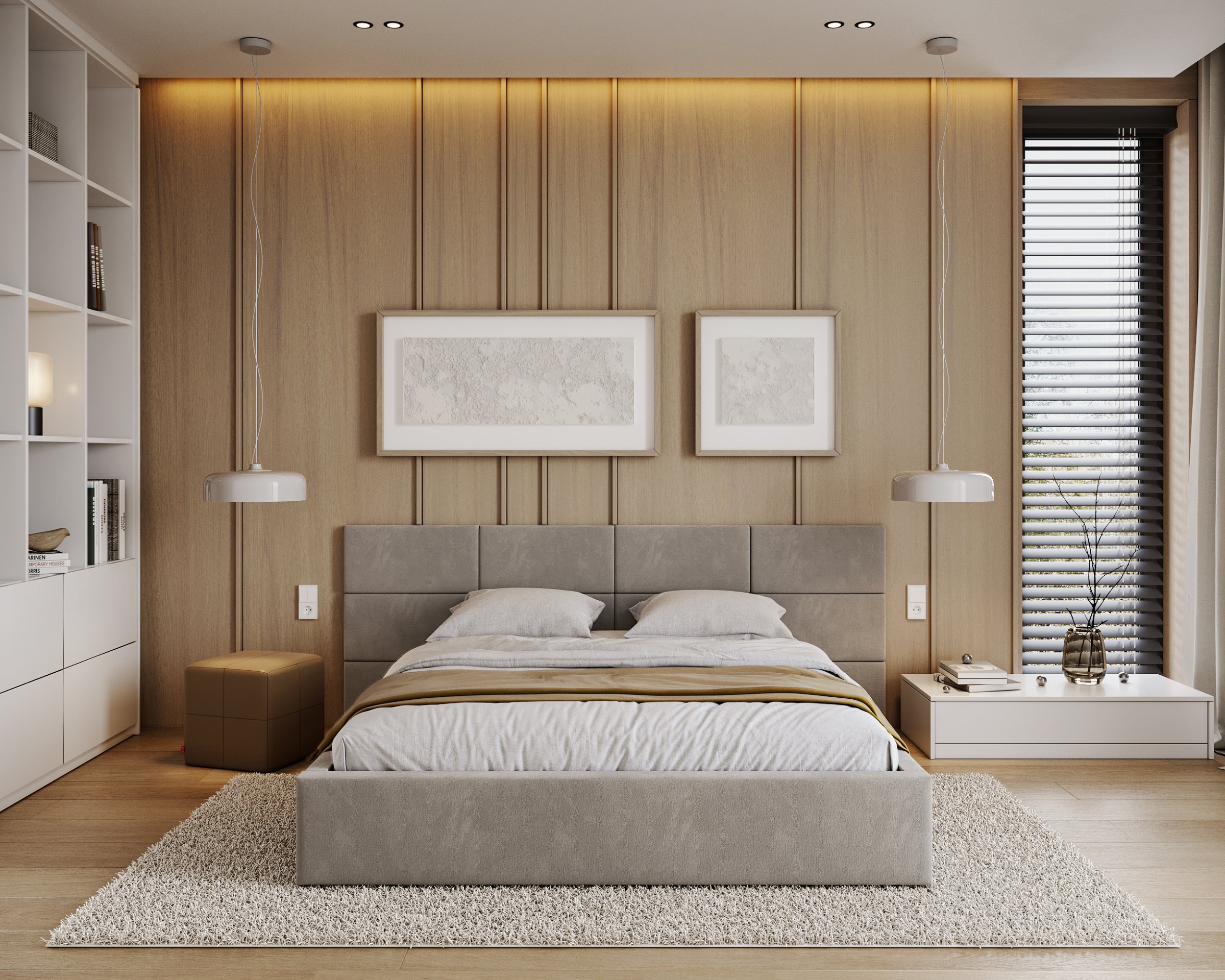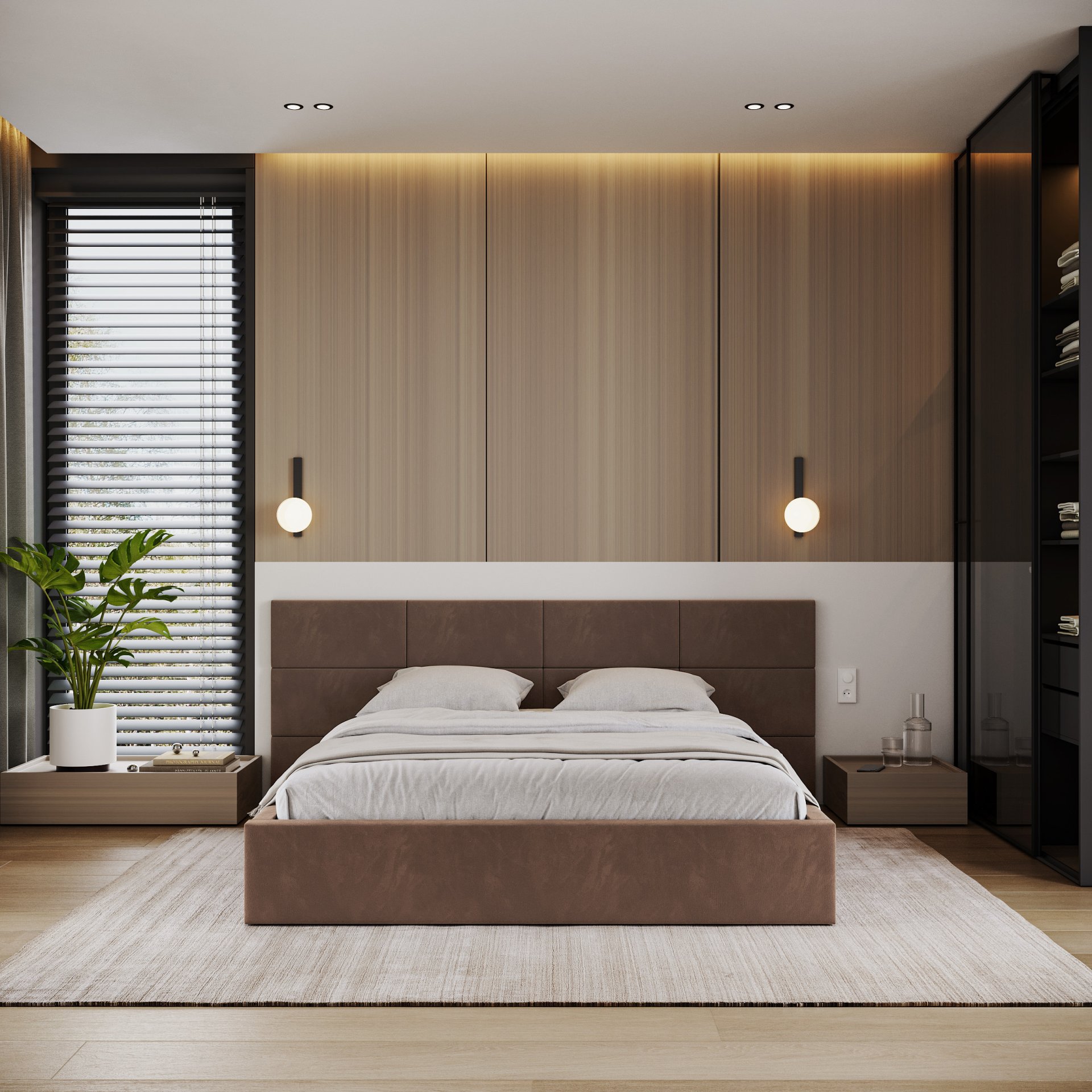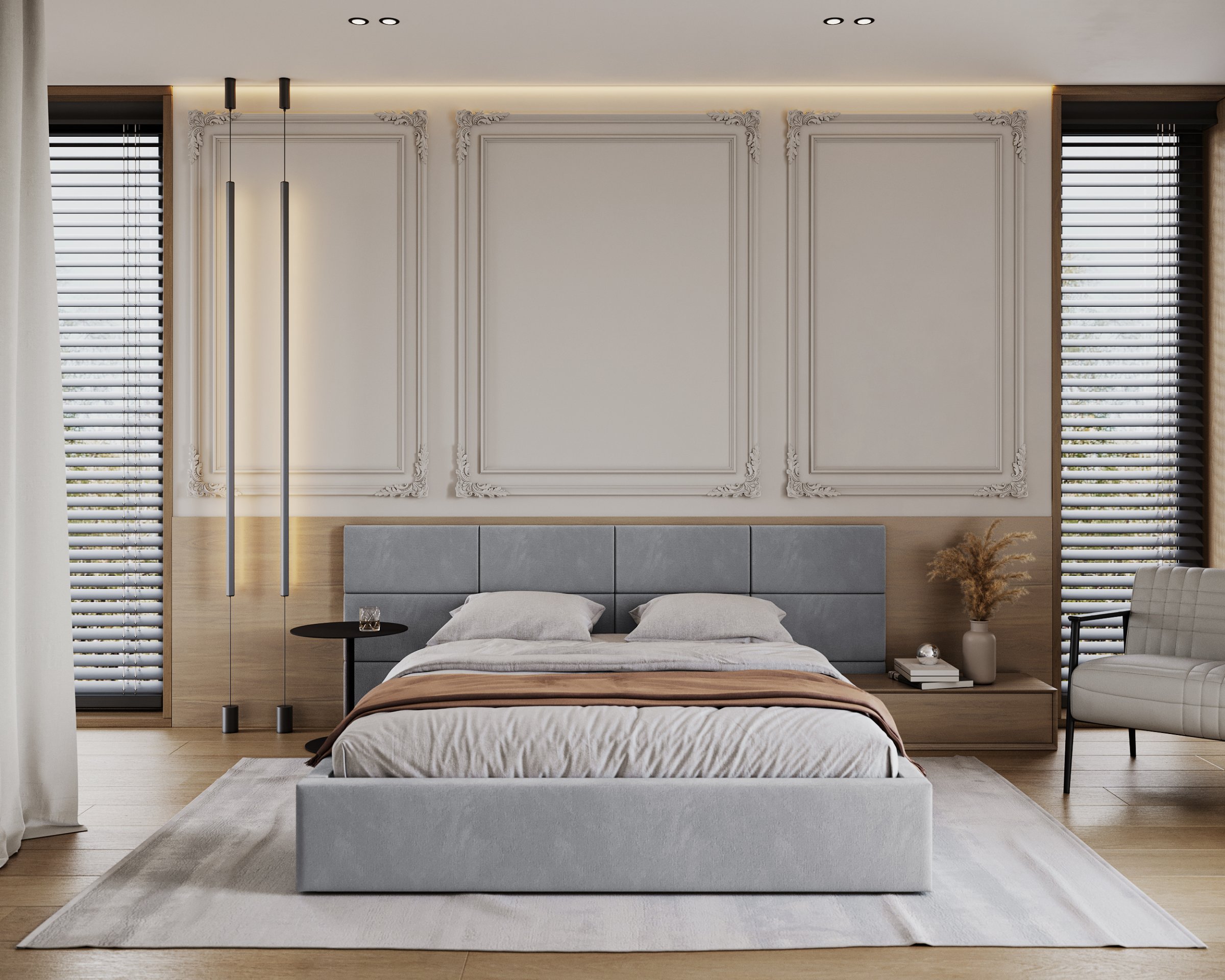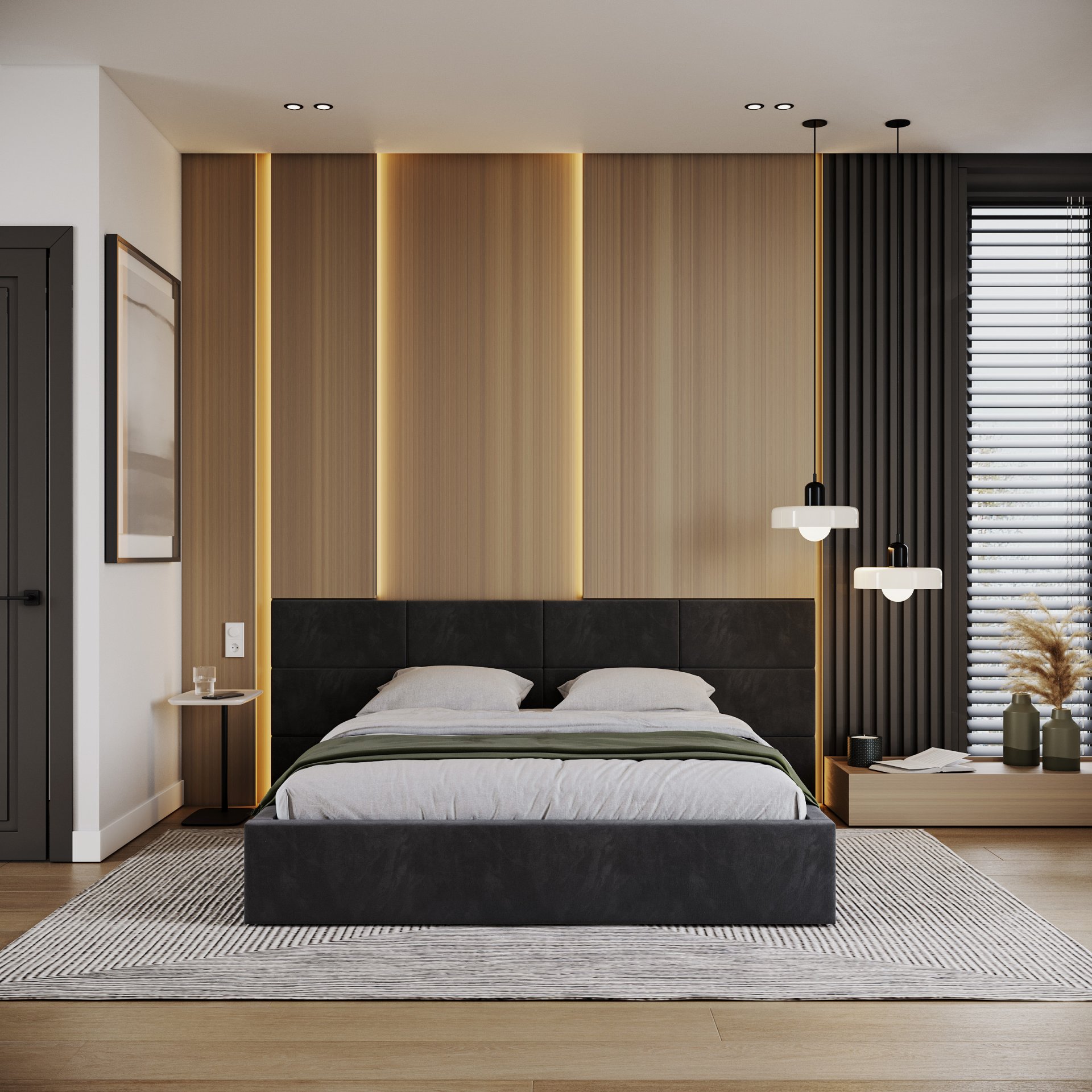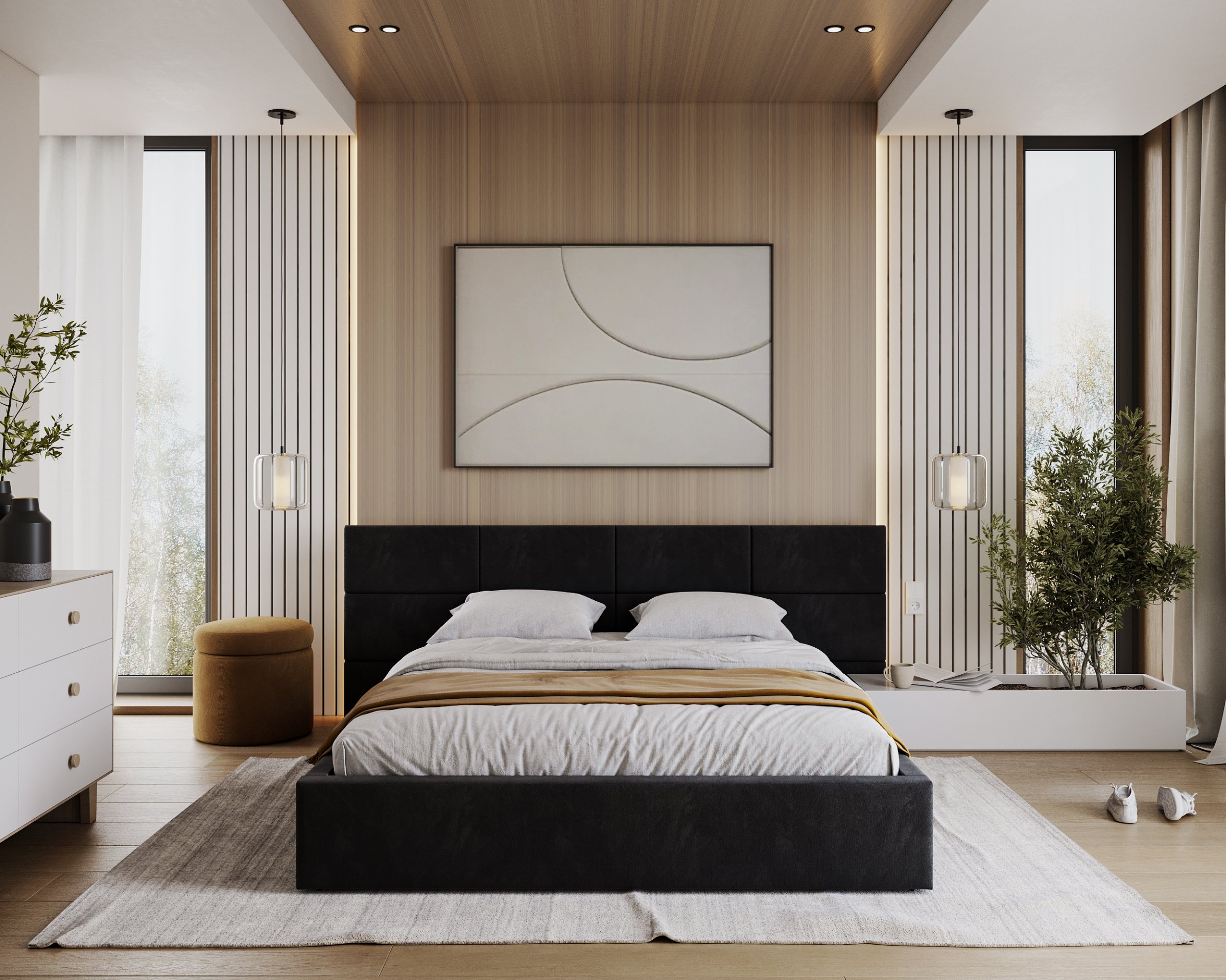 Posebna pažnja posvećena je uzglavlju, koje se sastoji od pojedinačnih kvadratnih jastučića namijenjenih montaži na zid. Takav dizajn omogućuje prilagodbu visine i razmaka, čime se ne samo poboljšava udobnost pri čitanju ili gledanju televizije, već i estetski obogaćuje prostor spavaće sobe. Vodoravno prošiveni elementi i meko tapeciranje stvaraju ugodan osjećaj topline i domaće atmosfere, bez obzira na odabranu boju tkanine.