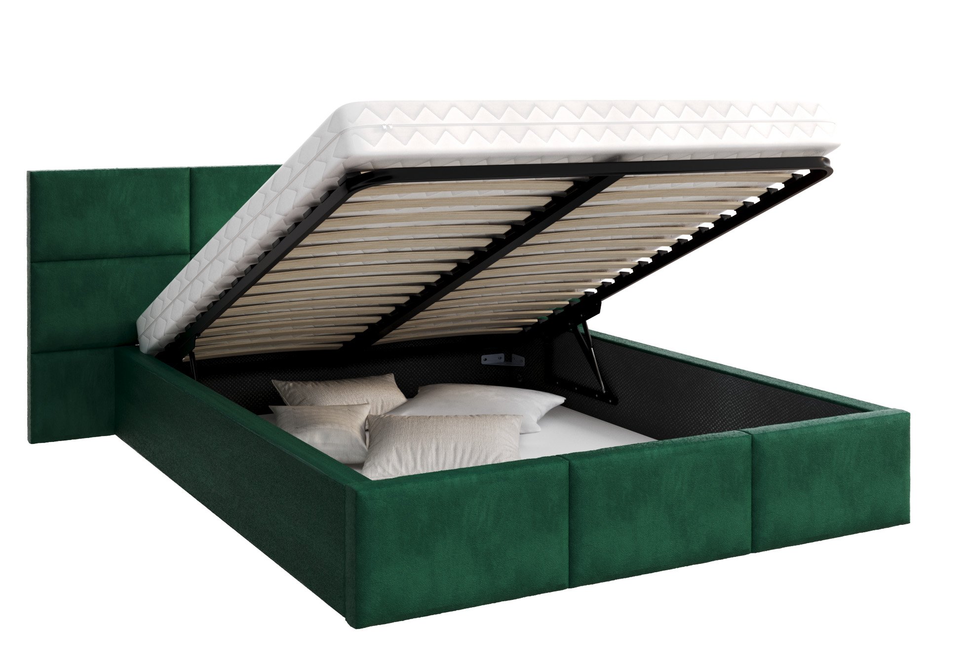 Krevet uključuje podizni mehanizam koji omogućuje brzo i jednostavno podizanje ležišta. Standardno je opremljen drvenim mehanizmom, dok je verzija s čeličnim mehanizmom dostupna uz nadoplatu. Ova funkcionalnost omogućuje pristup prostranoj ladici ispod ležišta – idealnoj za pohranu posteljine, deka ili sezonske odjeće. Sustav podizanja radi glatko i pouzdano, pa je upotreba jednostavna i za svakodnevne potrebe.