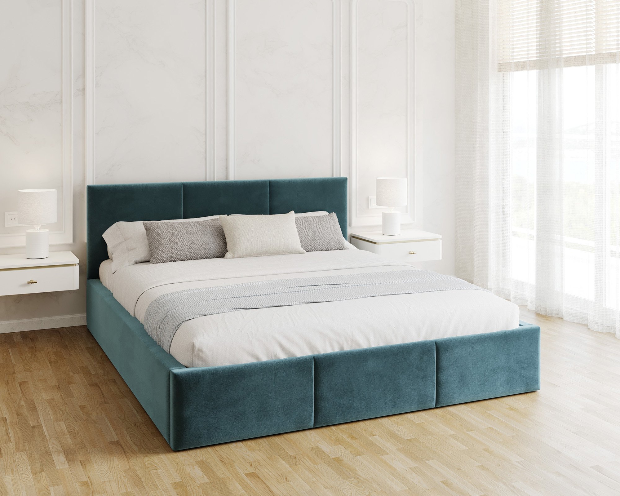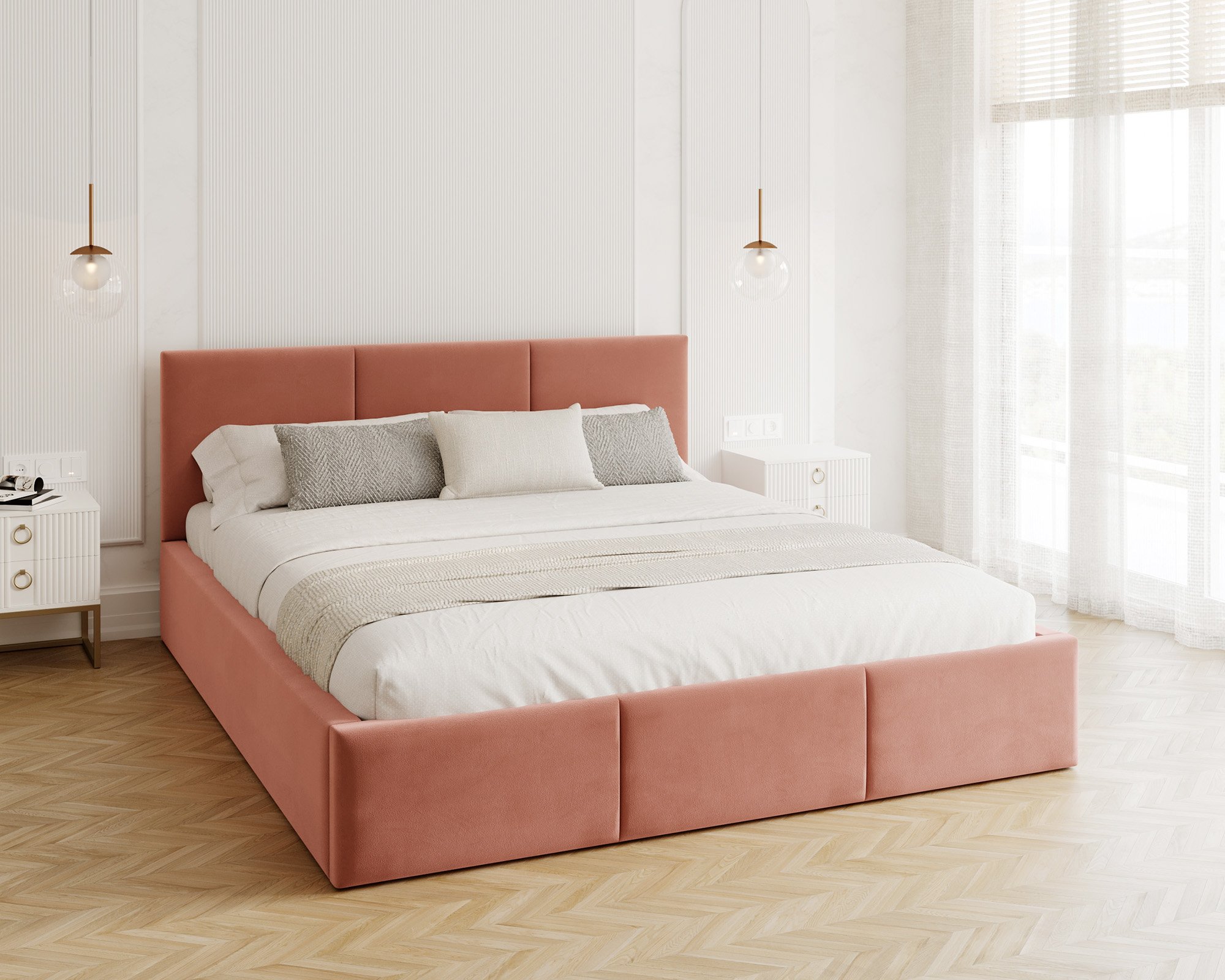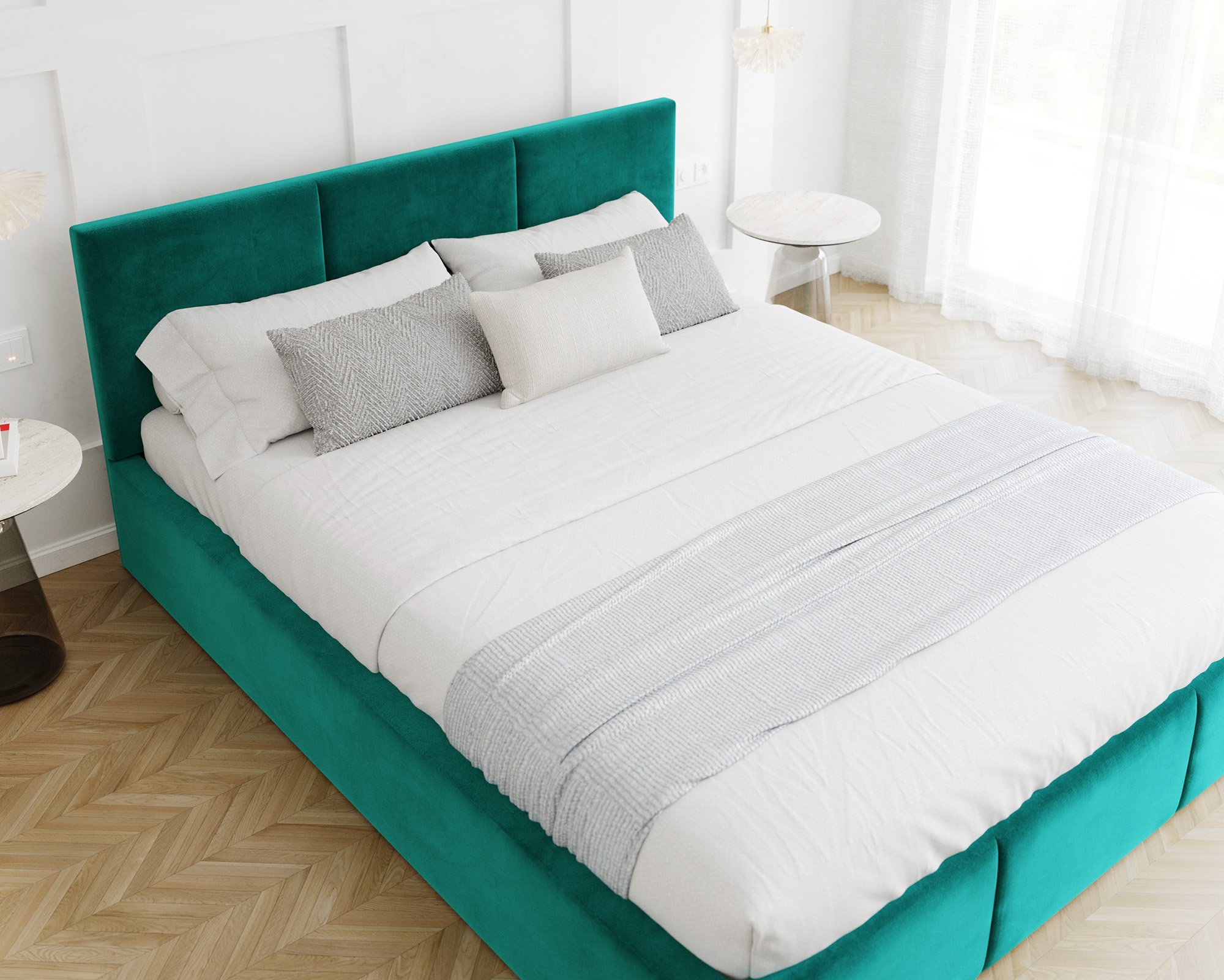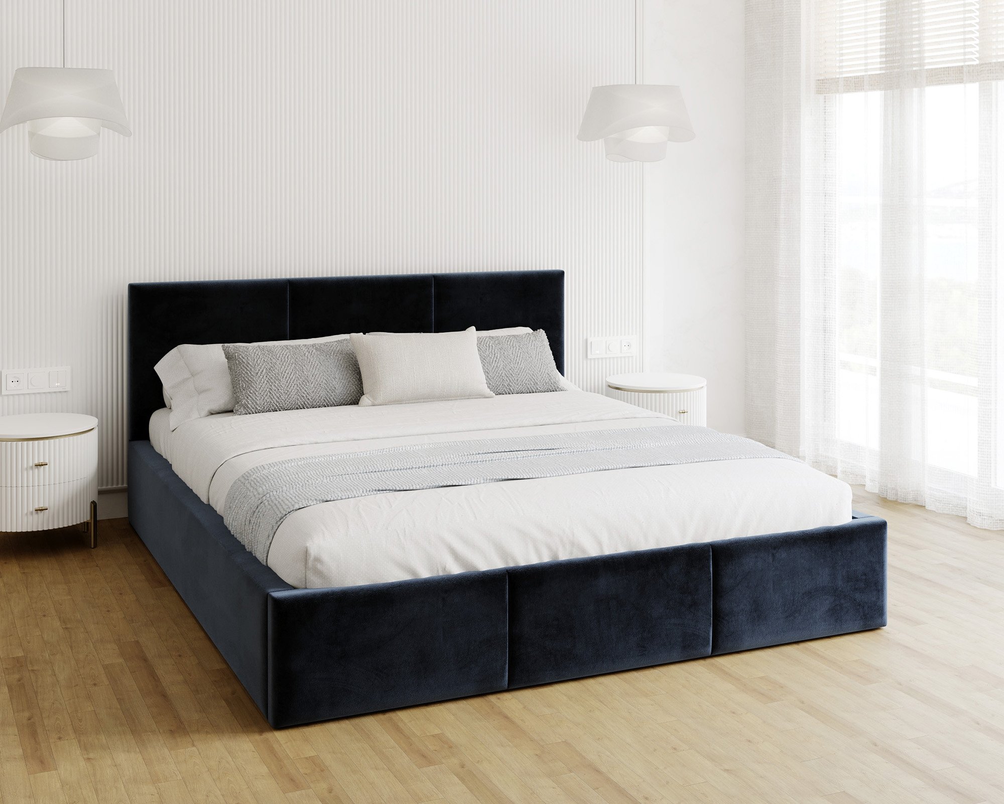 Uzglavlje i prednji dio kreveta prošiveni su vodoravnim linijama koje stvaraju ugodan vizualni ritam i meku površinu za naslon. Takav dizajn omogućuje udobno čitanje ili gledanje televizije u krevetu, jer pruža pouzdanu potporu leđima. Vodoravni šavovi istodobno osiguravaju da krevet izgleda elegantno i moderno, bez obzira na odabranu kombinaciju boja.